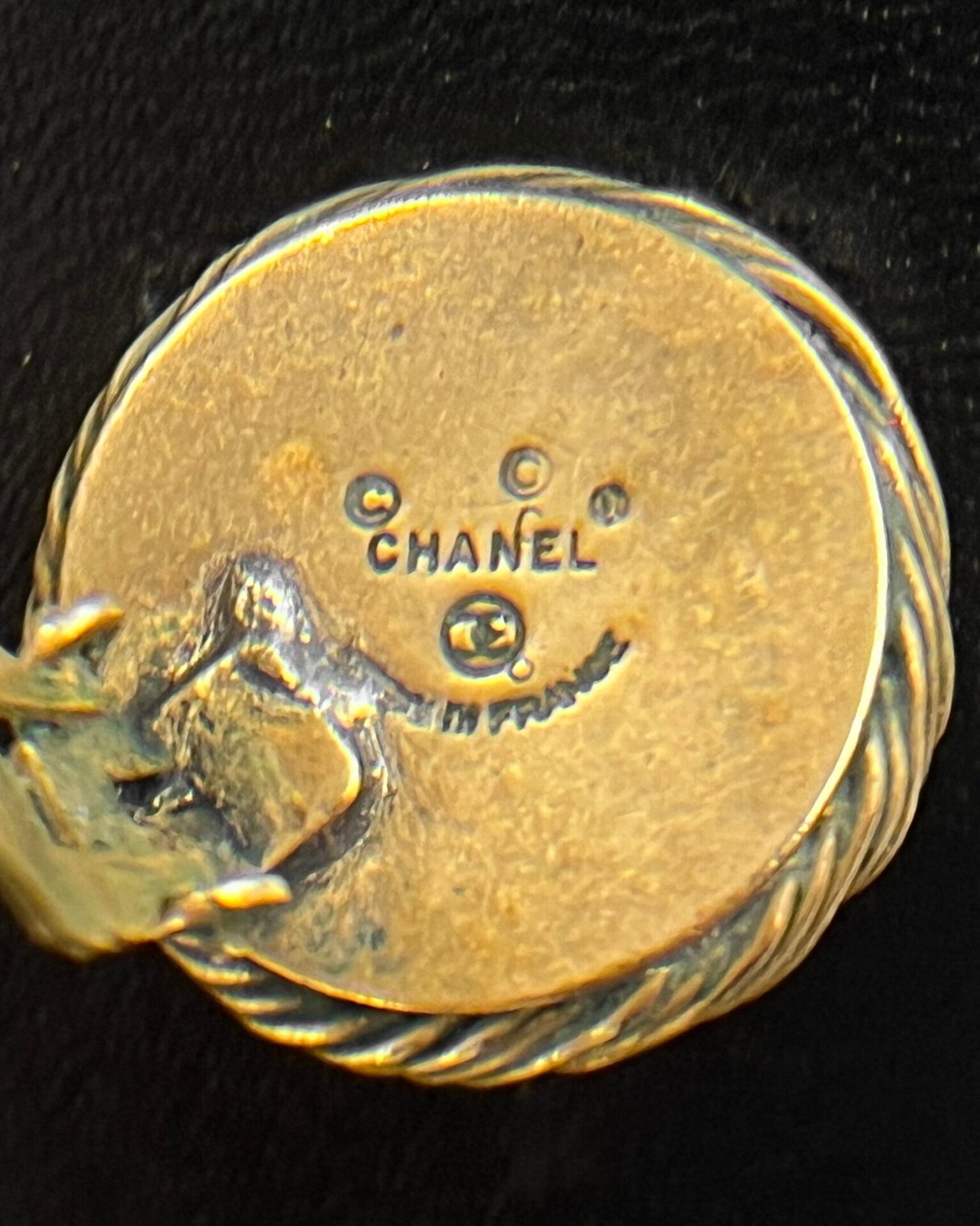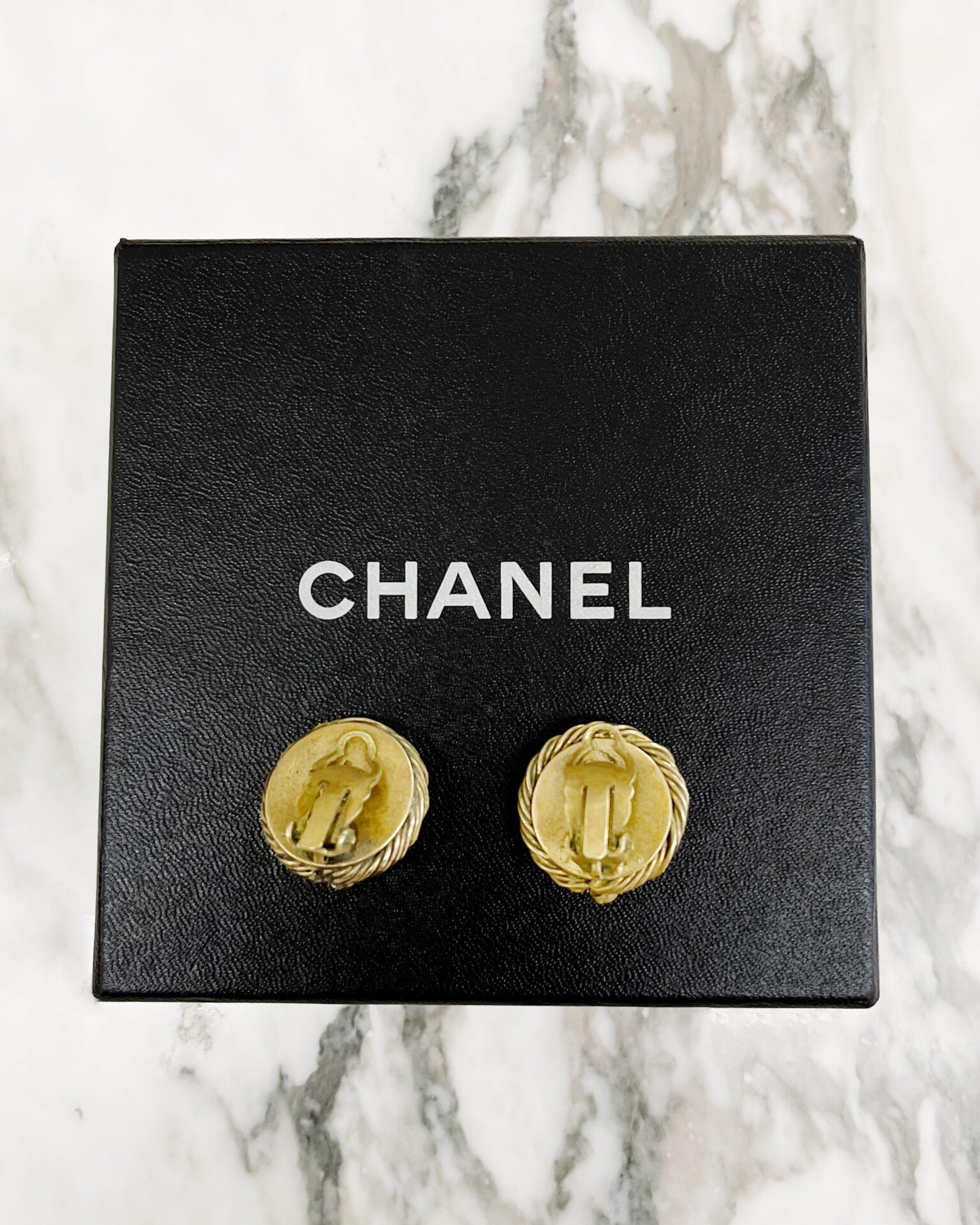 1980’s vintage Chanel clip-on earrings with large black Gripoix glass balls surrounded by crystals and rope-style border. Doesn’t include box