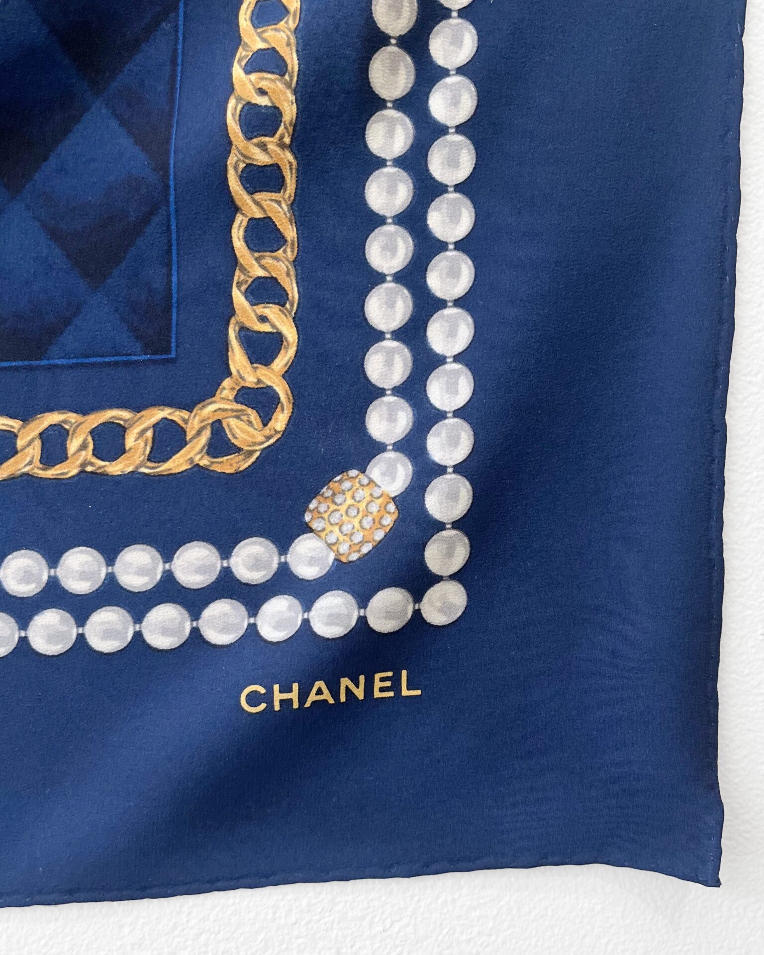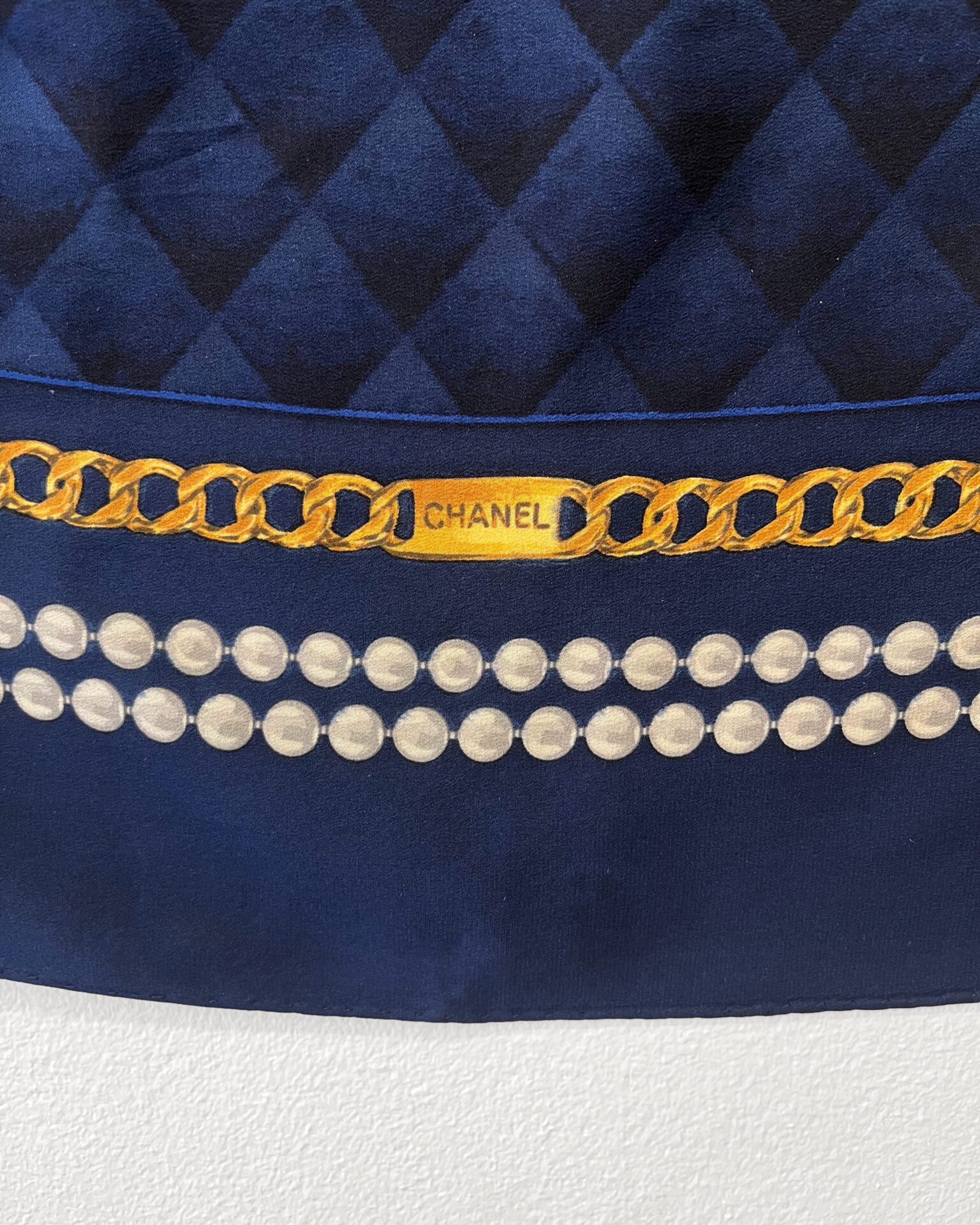 Beautiful 100% silk navy Chanel scarf with large ‘CC’ logo and pearl/chain print wrapping around the outside