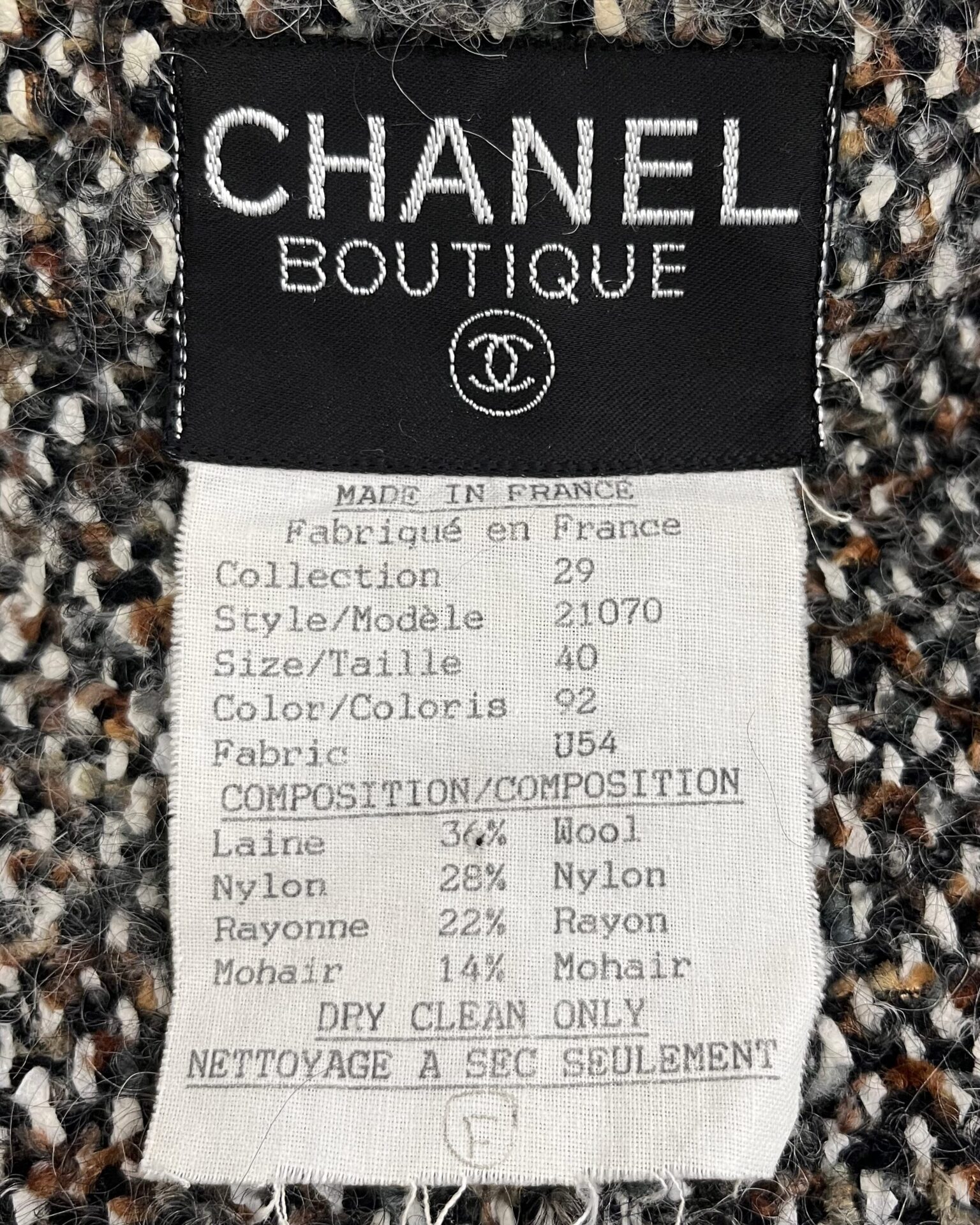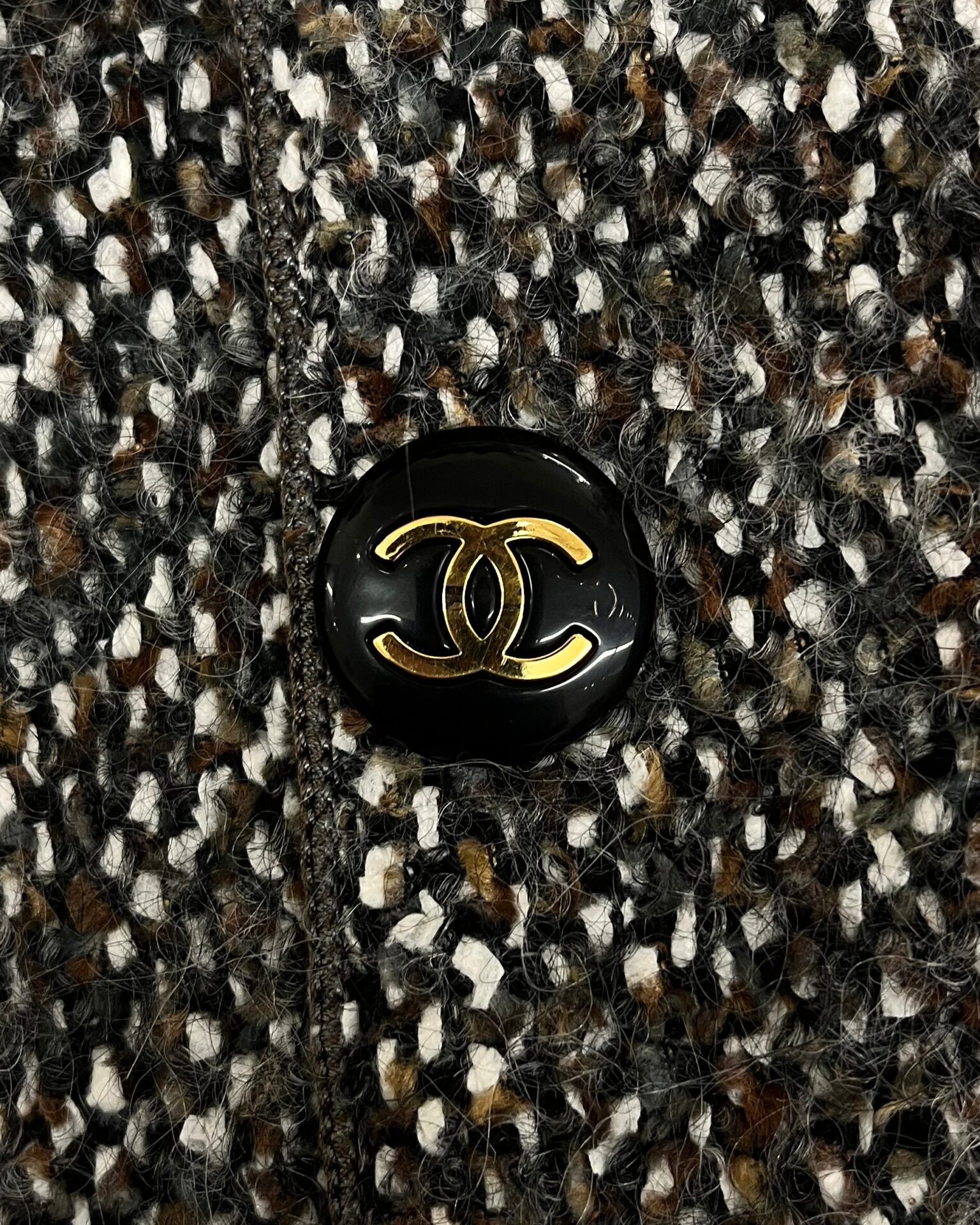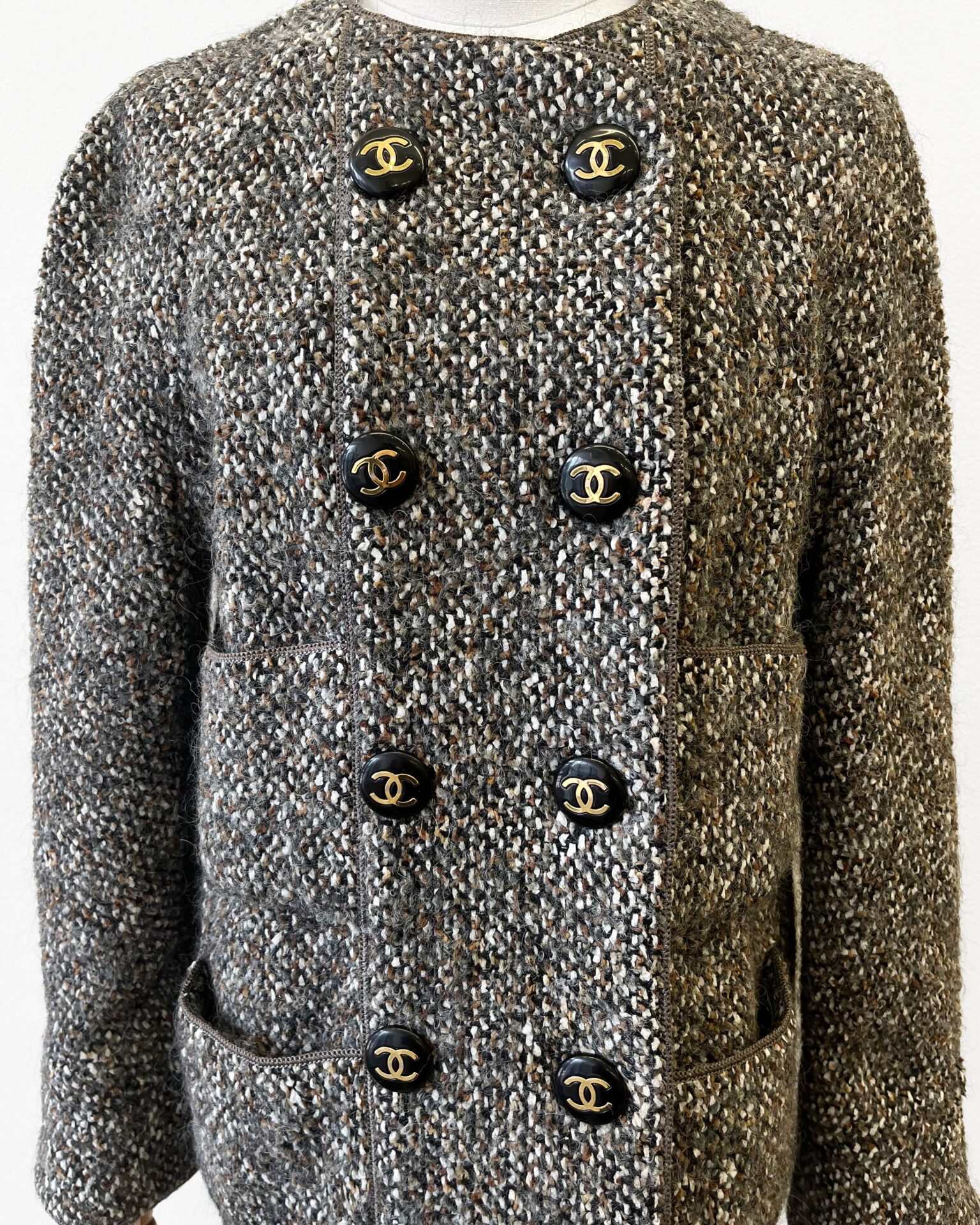 Vintage Chanel 1992 brown mohair & tweed unlined coat with large logo buttons and 4 pockets.