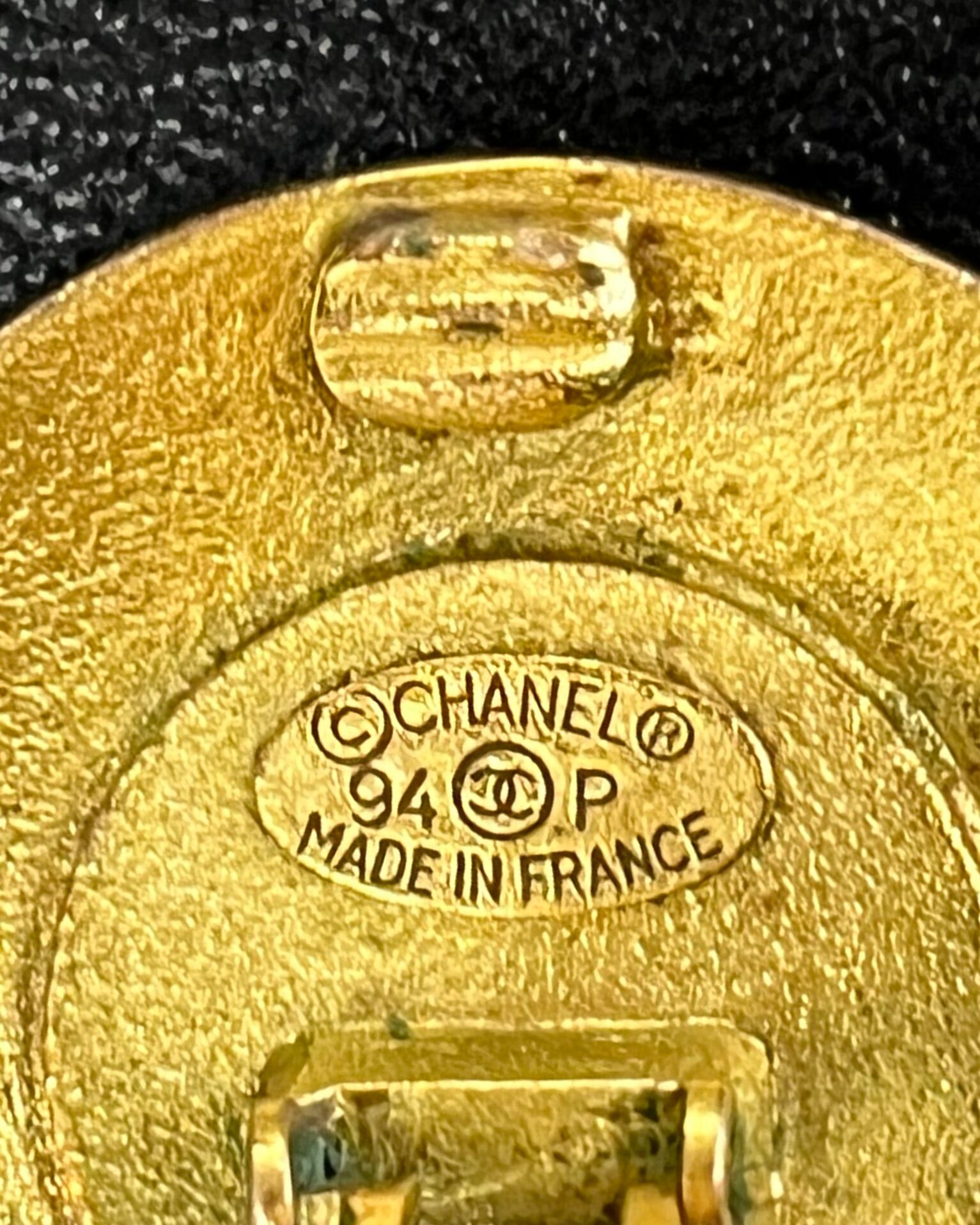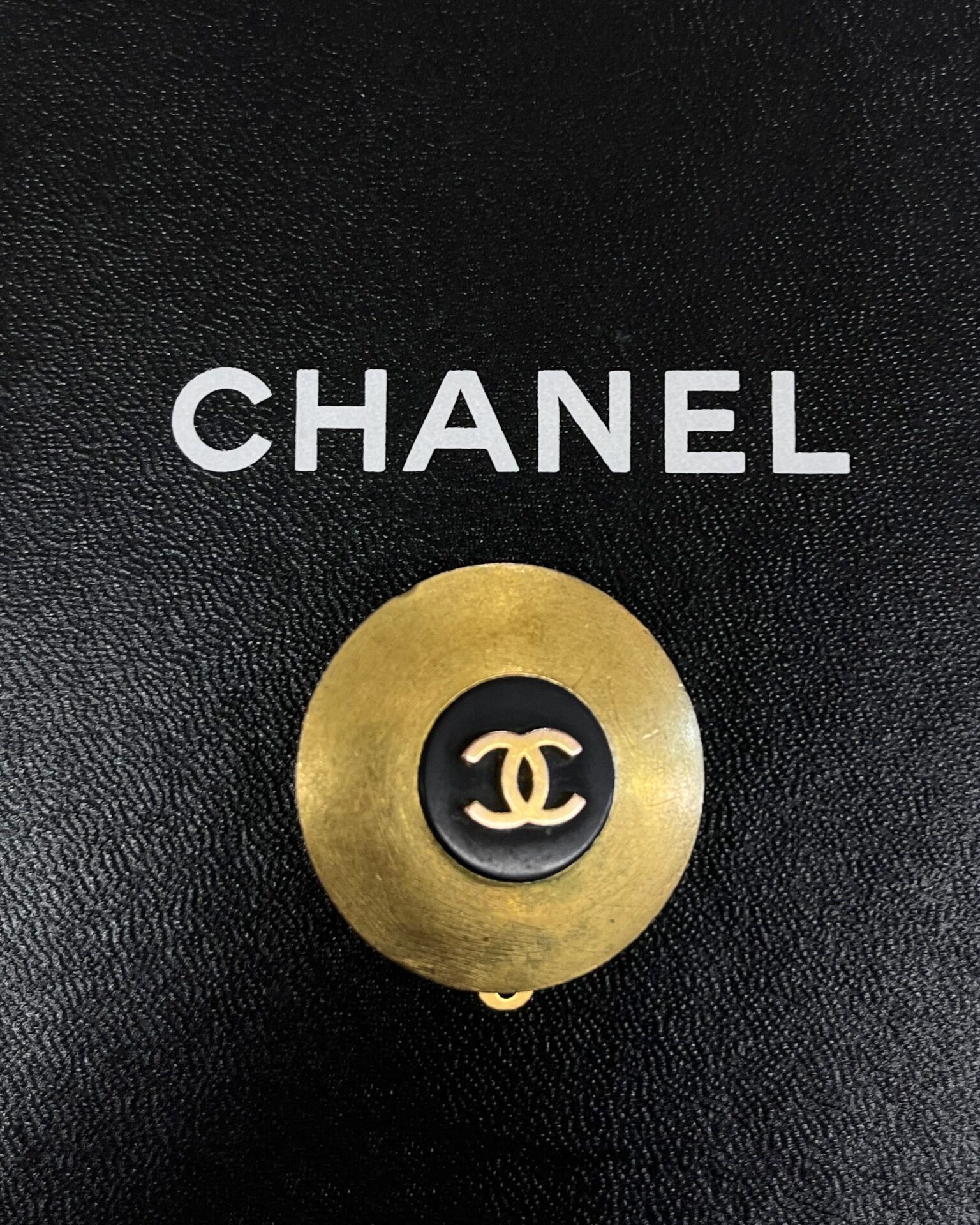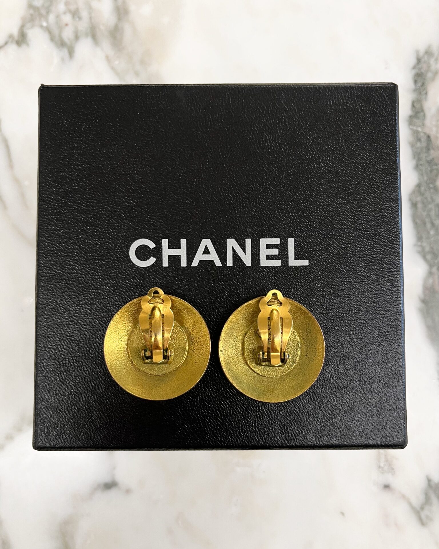 Vintage Chanel 1994 clip-on gold metal disk earrings with black circle in the middle with Chanel ‘CC’ logos. Doesn’t include box