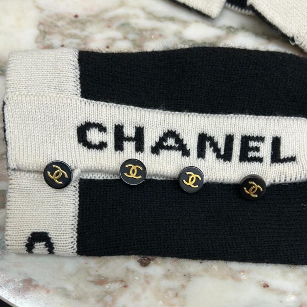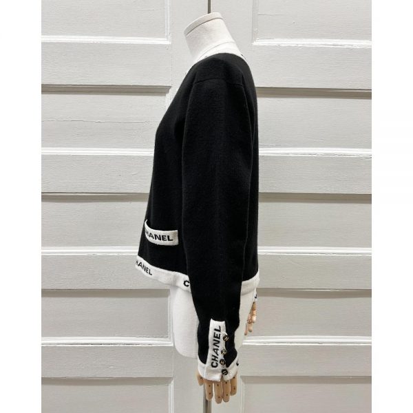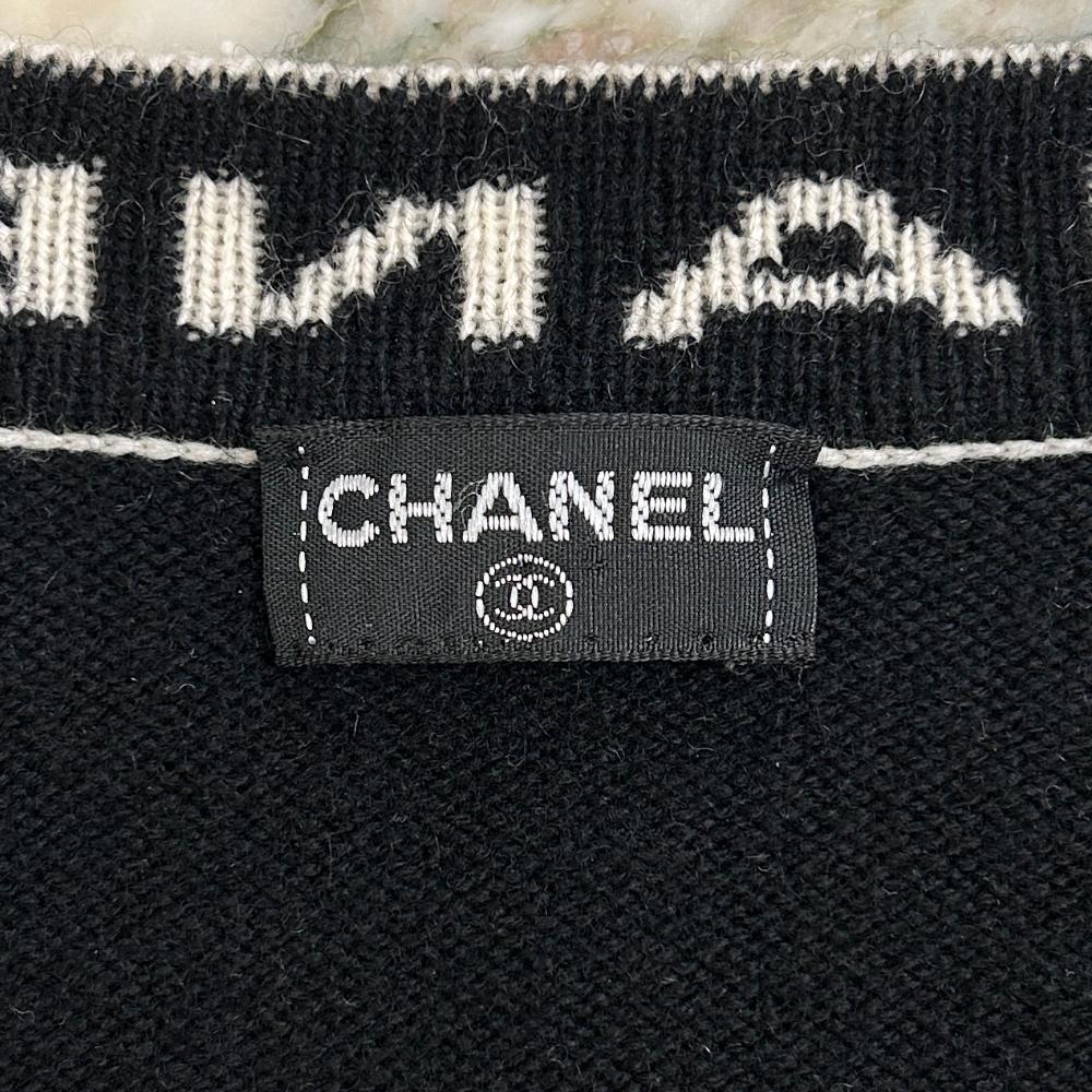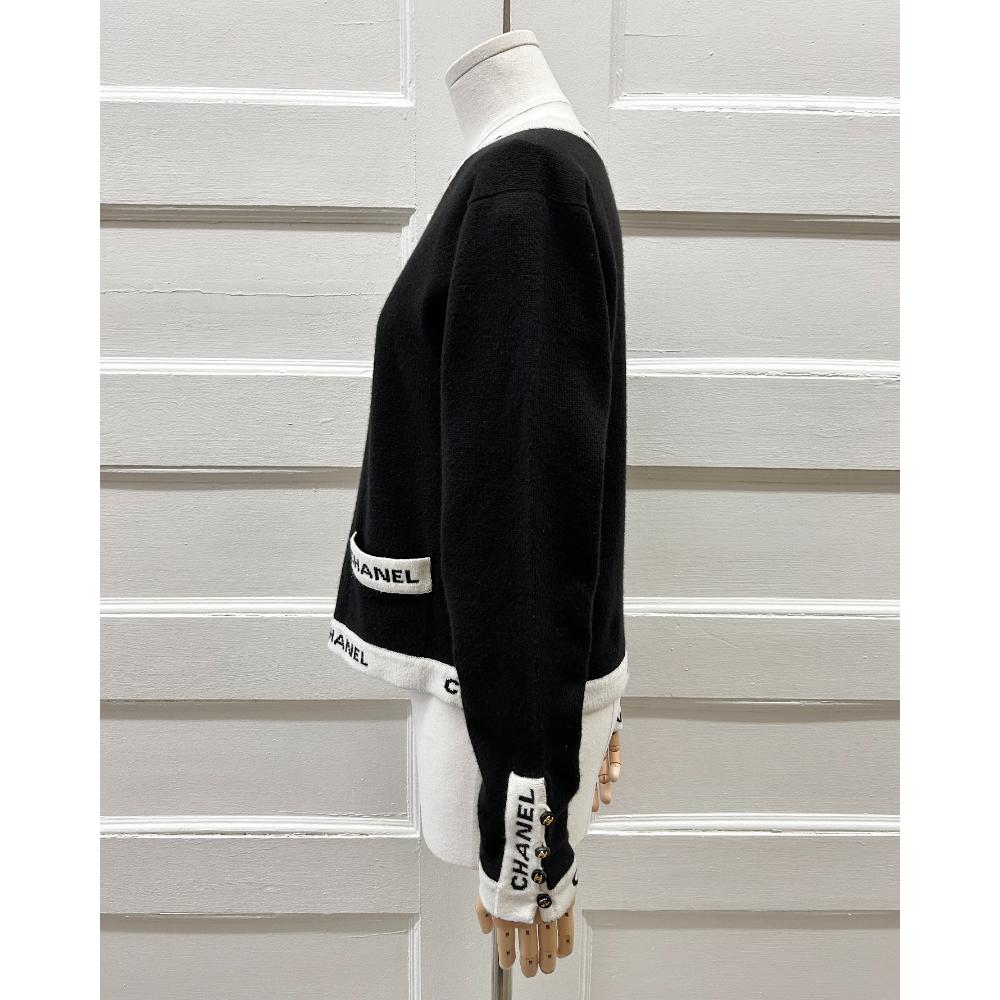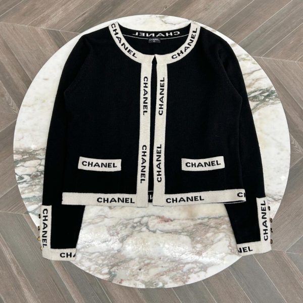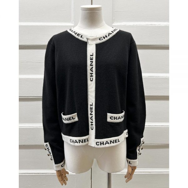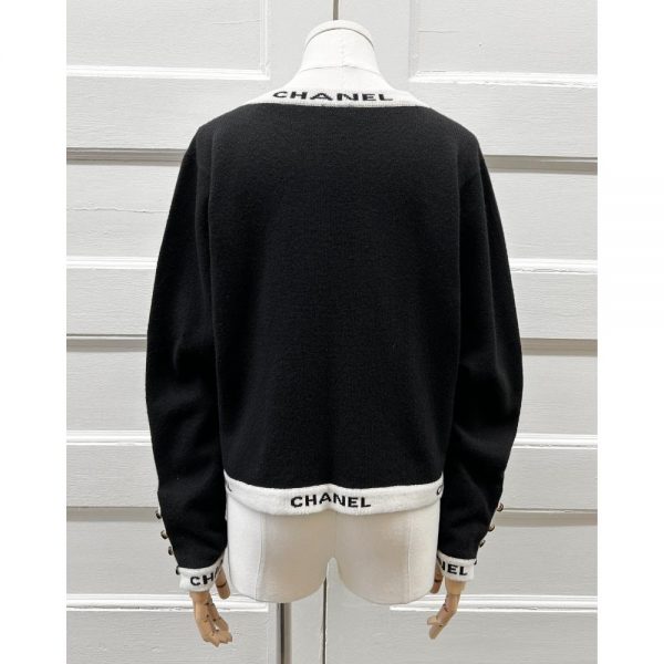 Vintage 1995 black cashmere knit cardigan, with ivory and black logo trim. There’s two front pockets, CC buttons at the sleeves, and the cardigan has an open front. Size and content tags were removed before it arrived in store. Condition: Near purrrfect. Little bit of surface pilling on the knit, but no other flaws.