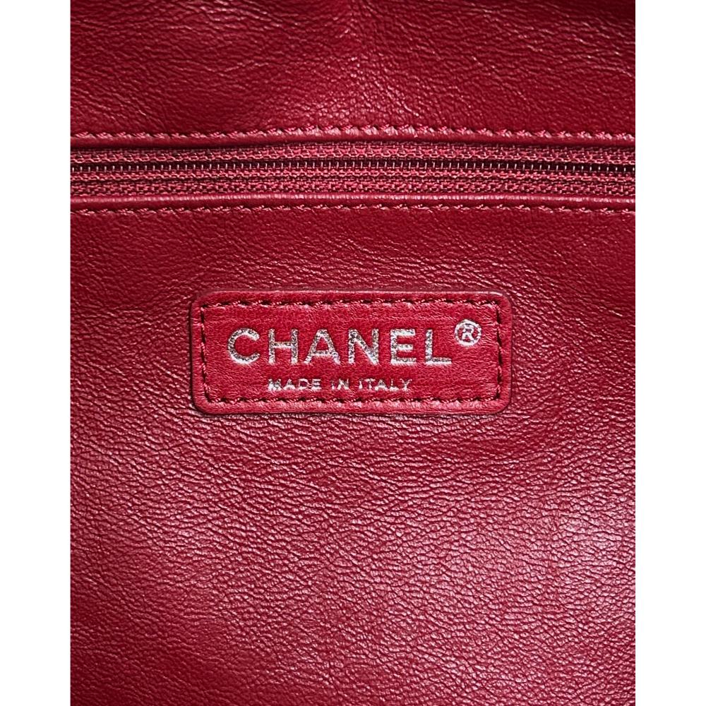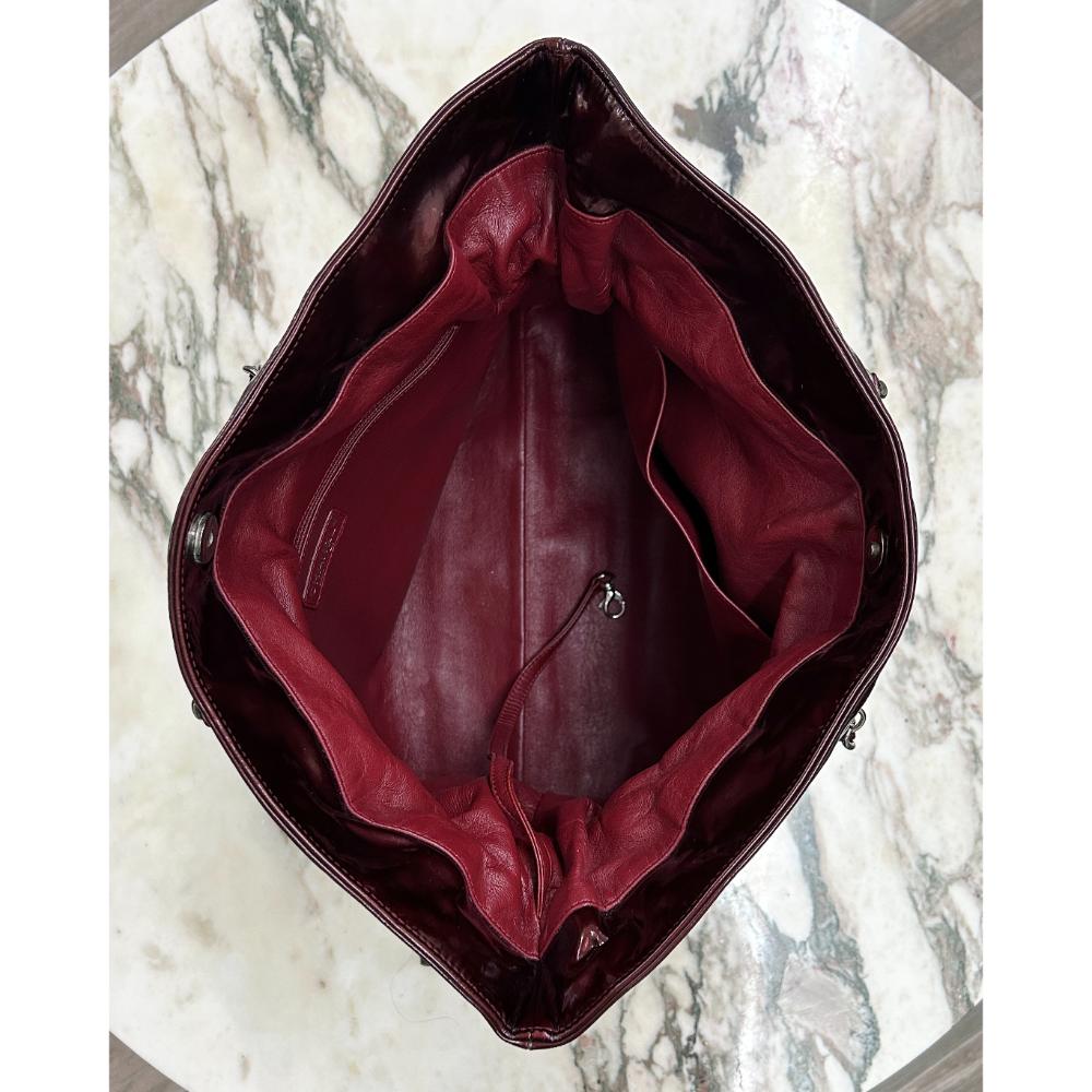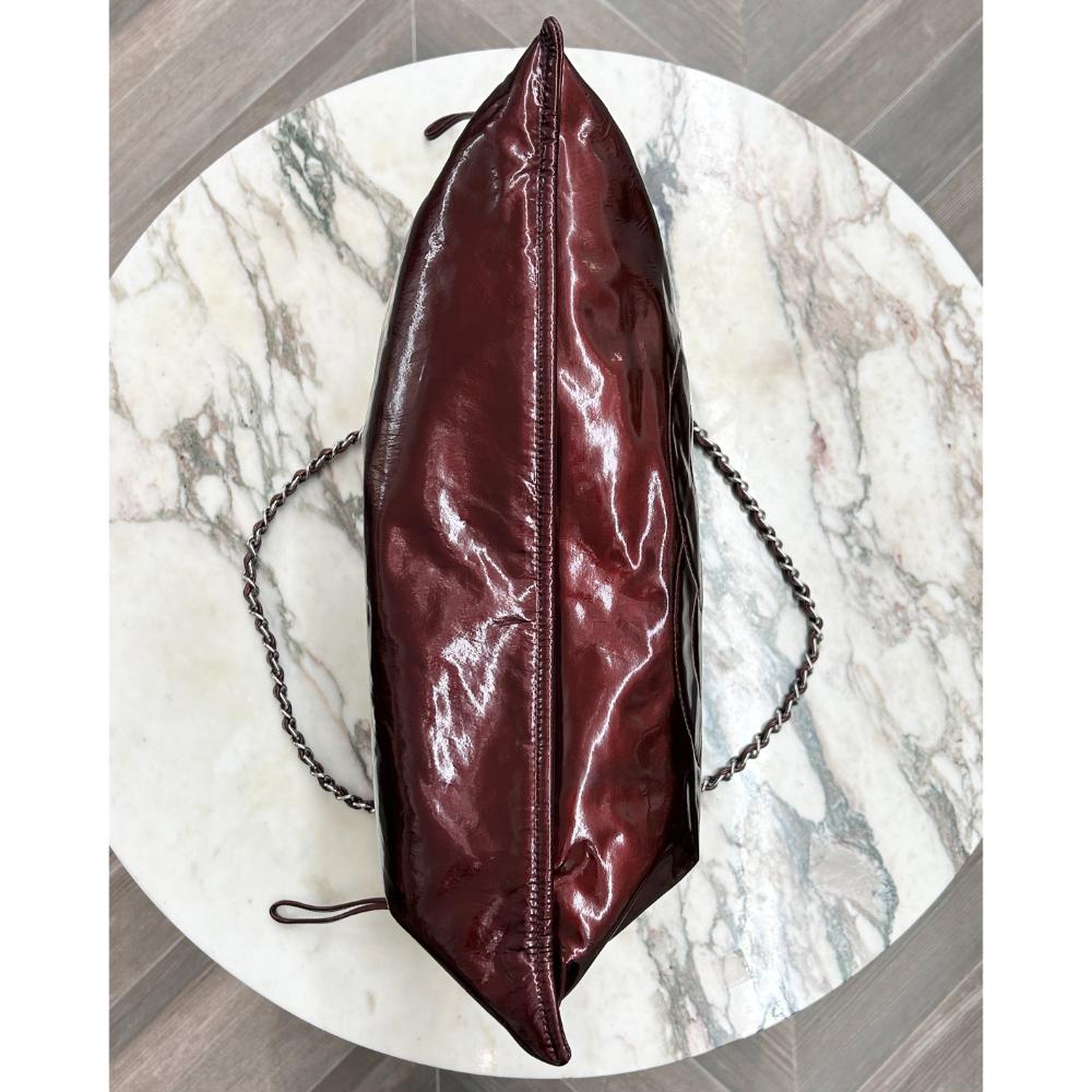 Burgundy patent leather tote bag with a large stitched CC logo on the front, two leather and silver chain shoulder straps, and drawstring side detailing. The bag has a magnetic snap closure, and is lined in red leather. The inside of the bag also features three pockets and a lanyard. Bag dimensions: 18″ x 16″ (W x H). Strap drop: 9″. Condition: Fair. There is a bit of discolouration on the front of the bag, and the straps have some cracks in the lather. The bag’s serial code sticker fell off before arrival in store.