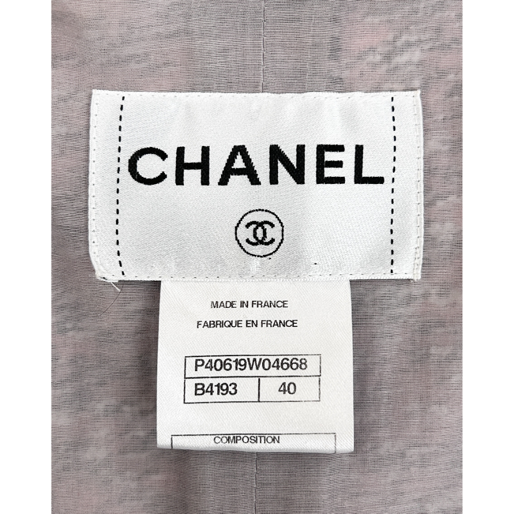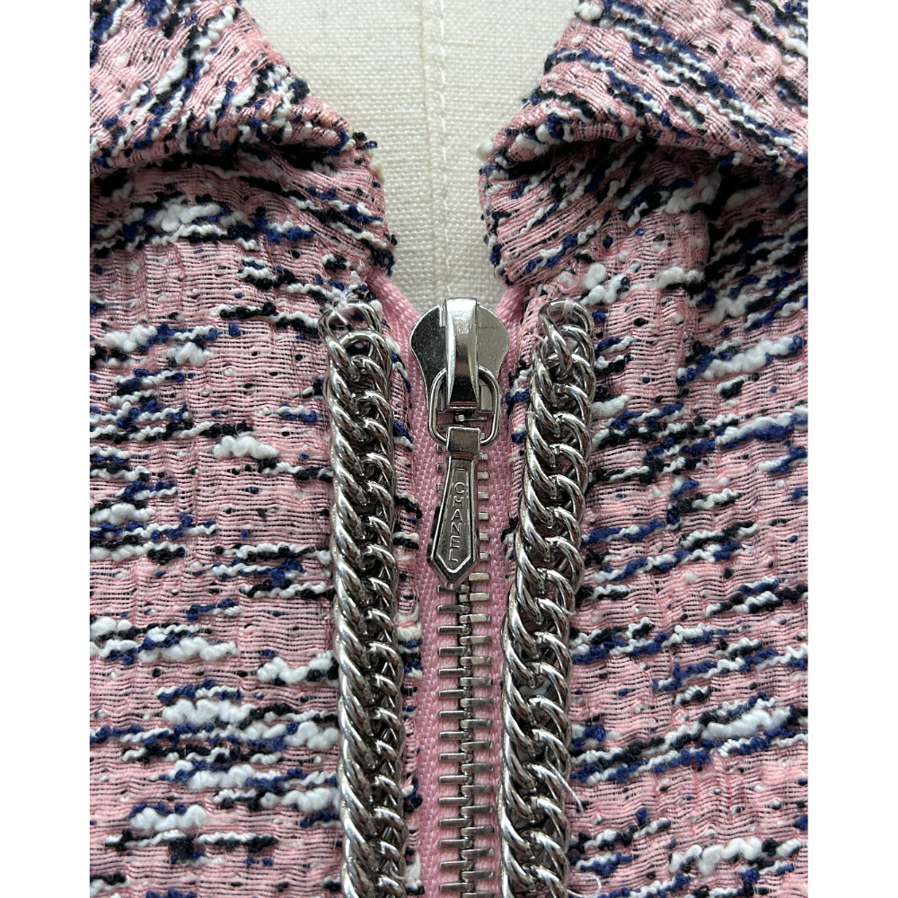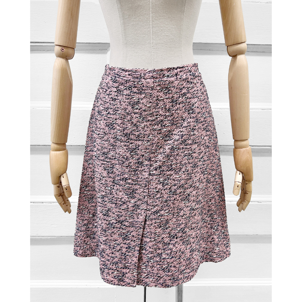 Pink, black, navy and white tweed skirt suit. The skirt has a front hem vent and is an A-line silhouette. The jacket has four pockets and a zipper front closure. Both pieces are fully lined. See label image for the suit’s material content. Condition: Purrrfect. No flaws.