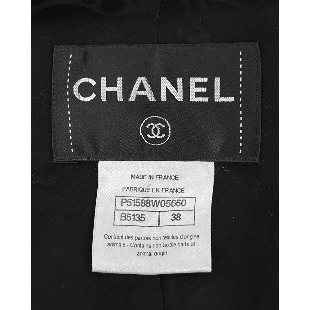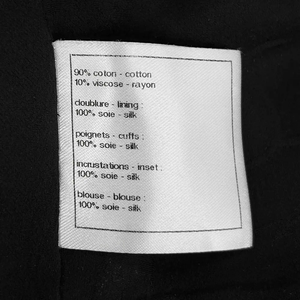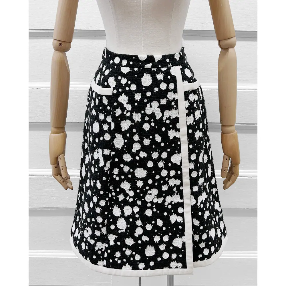 Black tweed skirt suit with white paint splatter print and cream trim. The jacket has four pockets, hook and eye closures down the front and is a cropped fit. The skirt is a faux wrap style with an overlapping front, has two pockets, and has an A-line silhouette. Both pieces are fully lined. See label image for material content. Condition: Good. Some faint discolouration marks on the white trim around the jacket, as well as some light pilling on the tweed fabric.