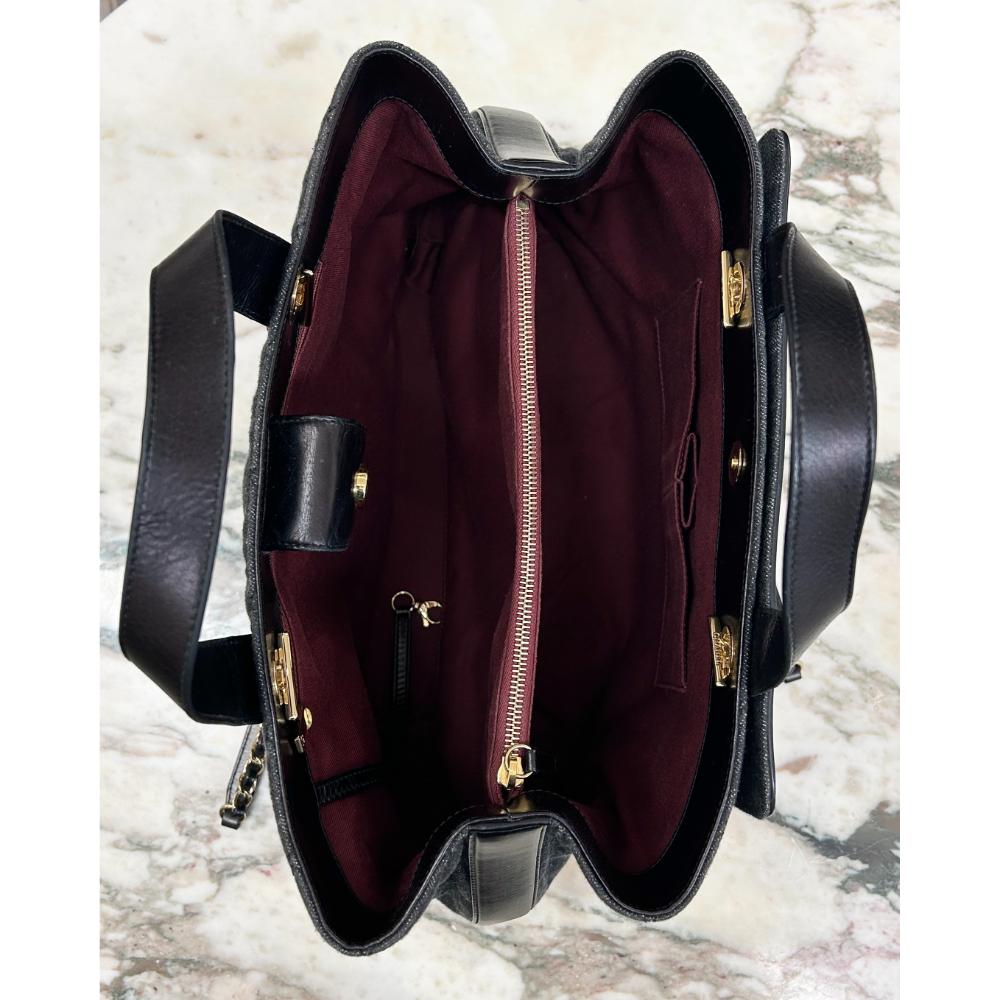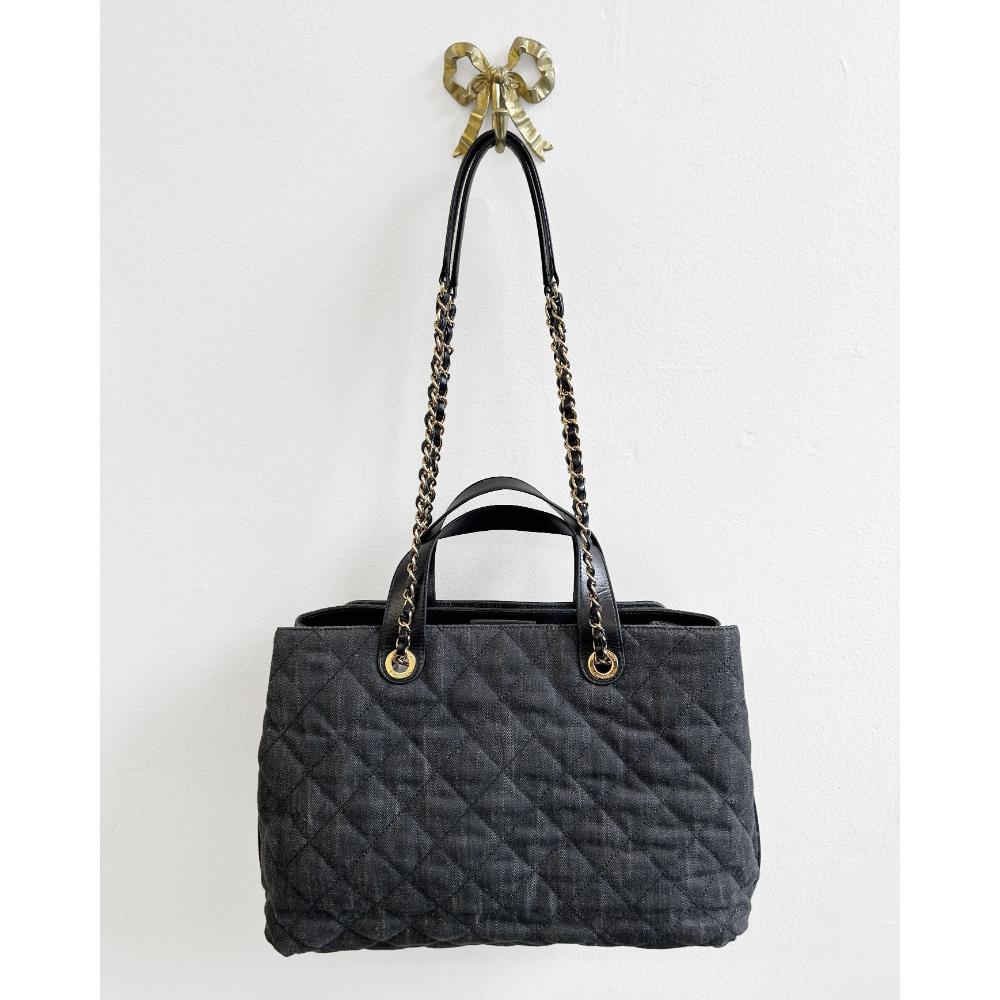 Large quilted dark grey denim and black leather tote bag, with gold tone hardware, leather top handles and two long leather and chain straps. The tote opens with a magnetic top strap to a burgundy twill interior. The inside has a zippered middle compartment, two large open compartments, as well as a couple smaller pouches. Comes with a dust bag. Bag dimensions: 14″ x 9.5″ x 5″ (W x H x D). Long straps drop: 13″. Condition: Very good. The leather trim and top handles have a few small scuffs. The rest of the bag is in near purrrfect condition.