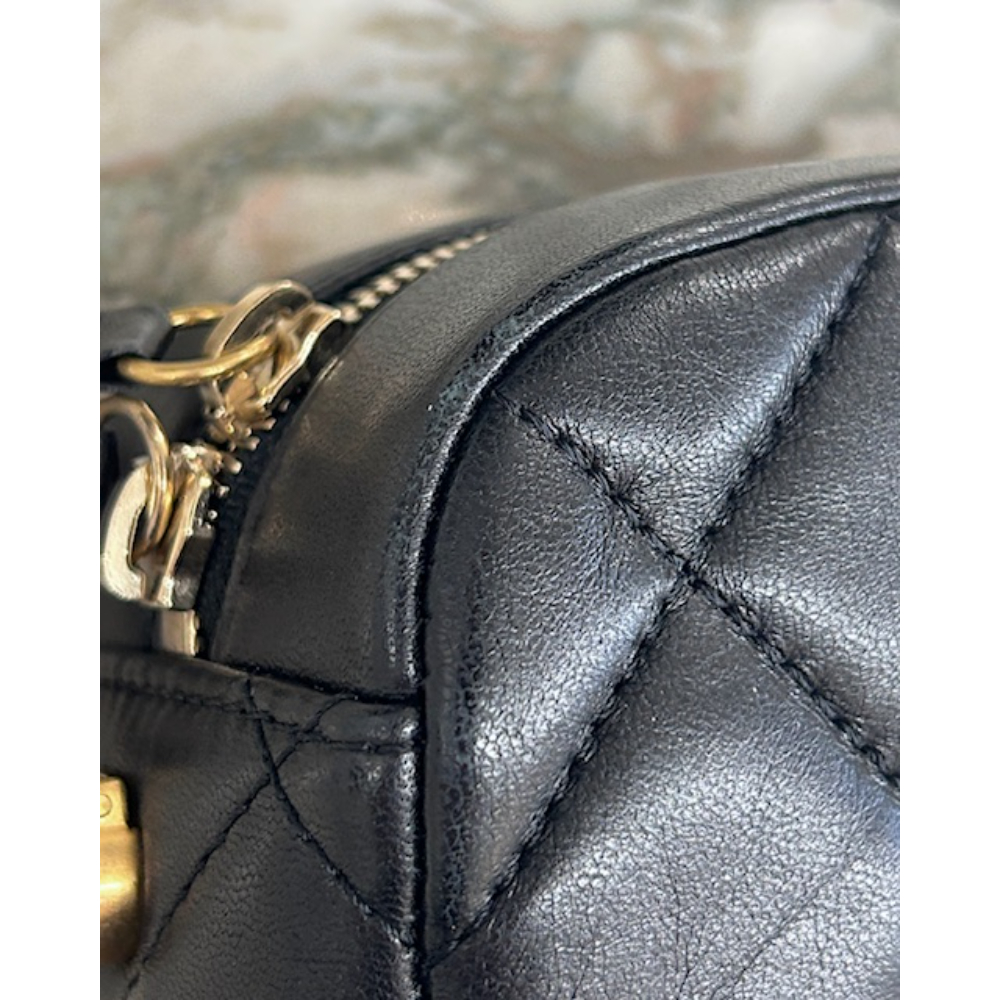 This is the chicest camera bag you’ve ever seen! Smooth, quilted, black lambskin leather with a red grosgrain fabric lining. The adjustable strap is a combo of leather/chain and pearls strung on strong cable for a classy touch. Comes with its original dust bag. Dimensions: 7″ x 5.25″ x 2,5″ (W x H x D). Strap drop (adjustable): 15″ – 28″. Condition: Great. Has some light creasing in the leather, and one light scuff on the edge of the bag. See last two images for close ups of wear.