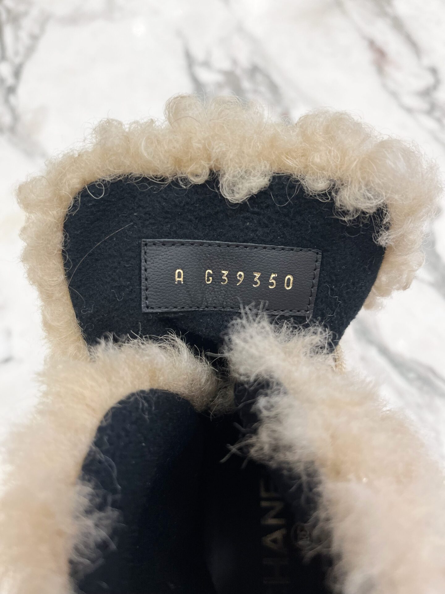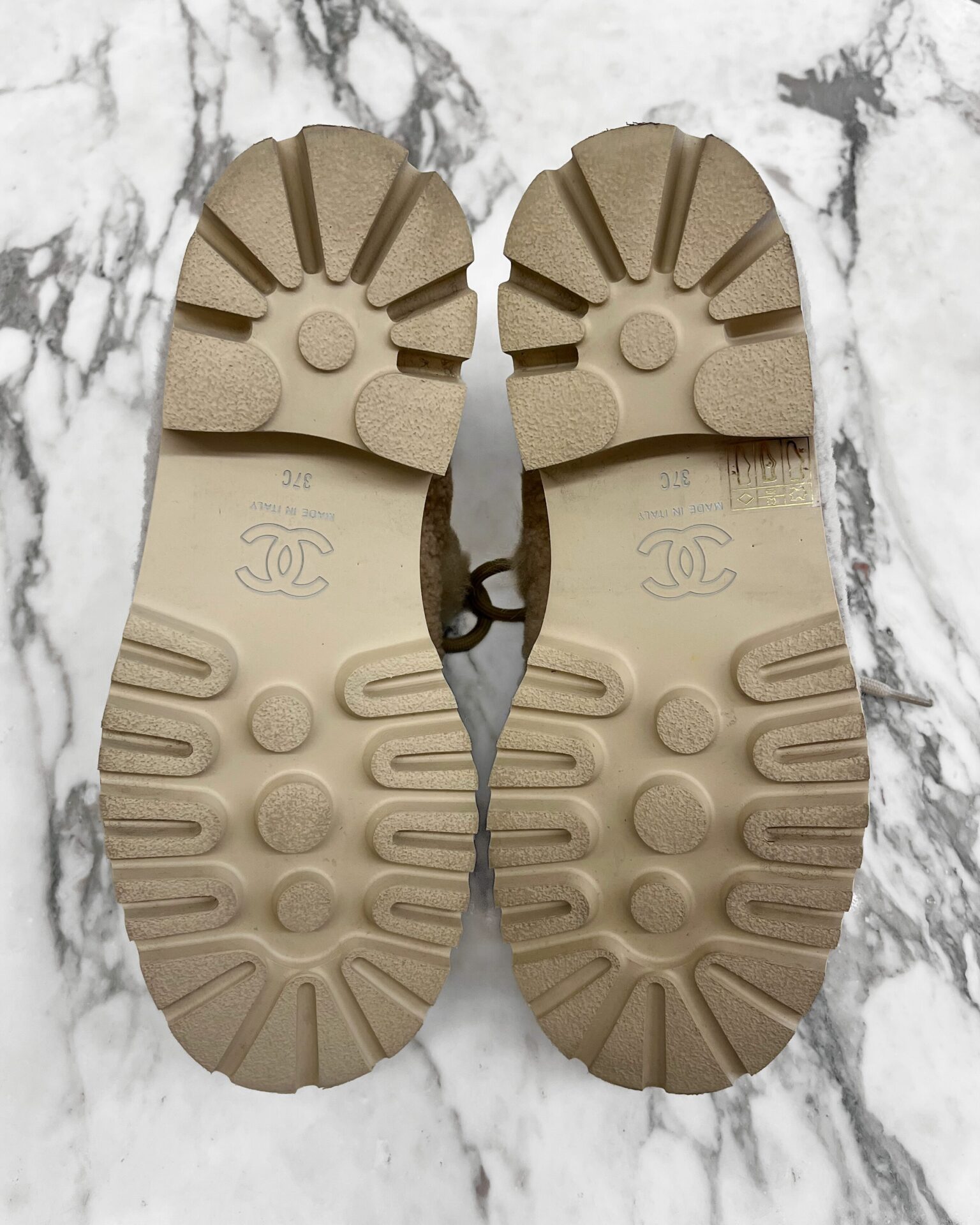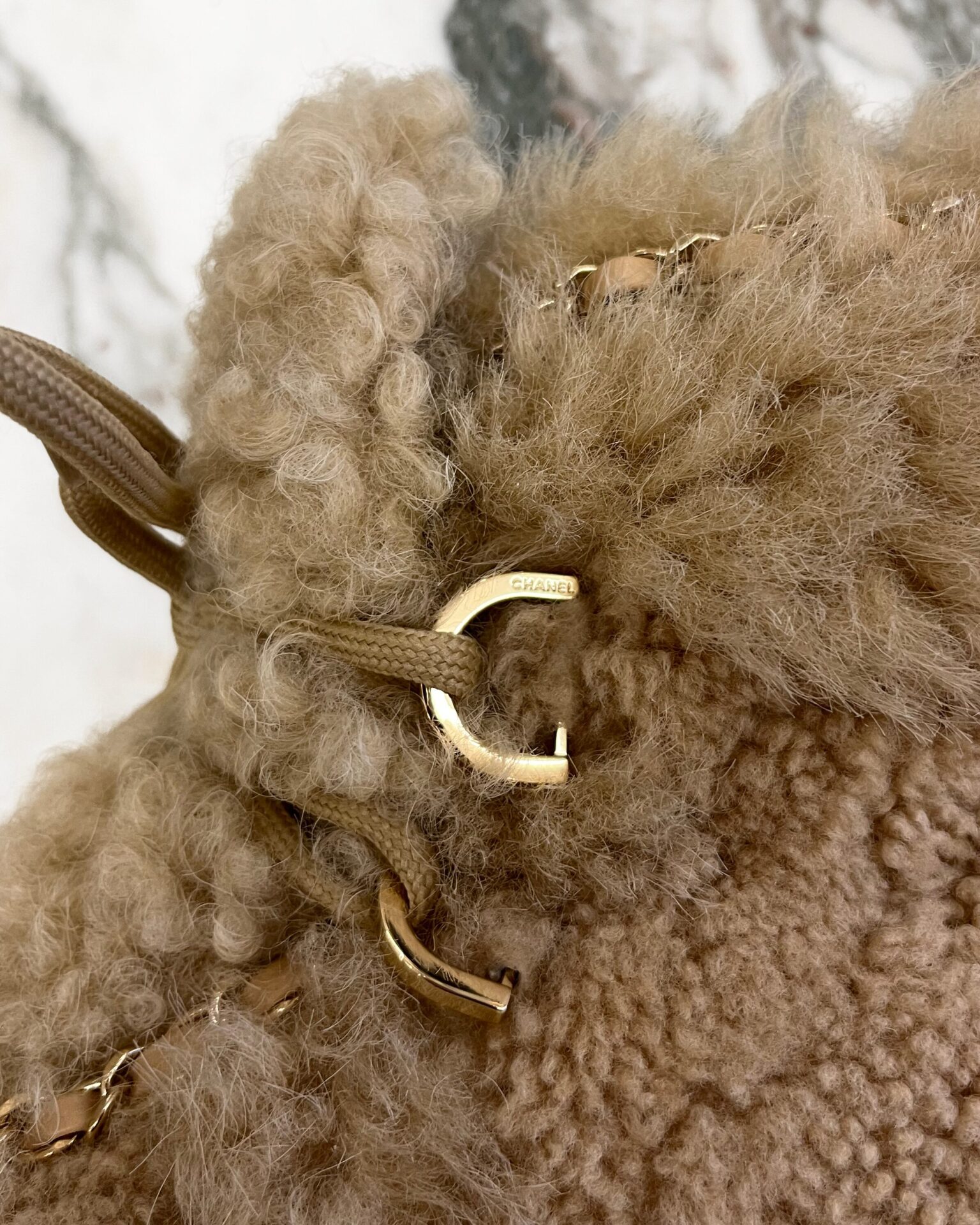 Camel tone beige shearling hiking style boots with gold metal hardware engraved with Chanel branding and a gold chain/leather woven trim accent around the boot. Includes box.