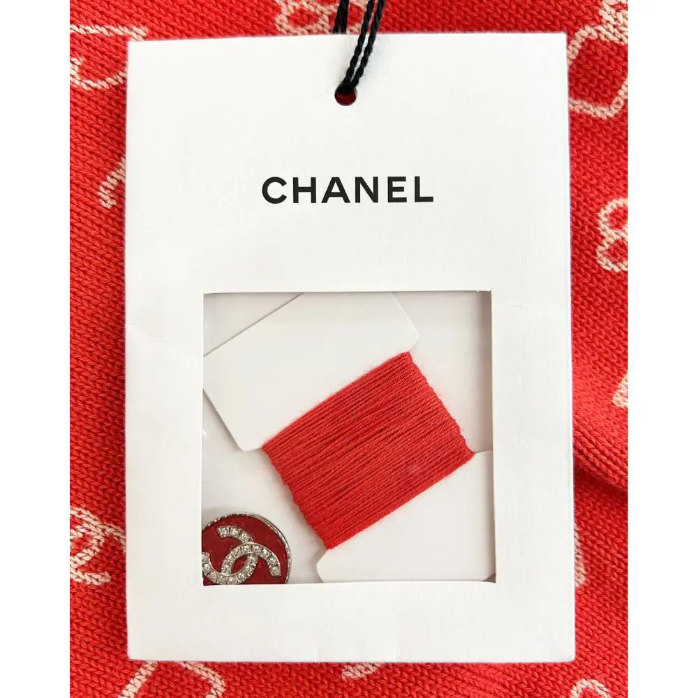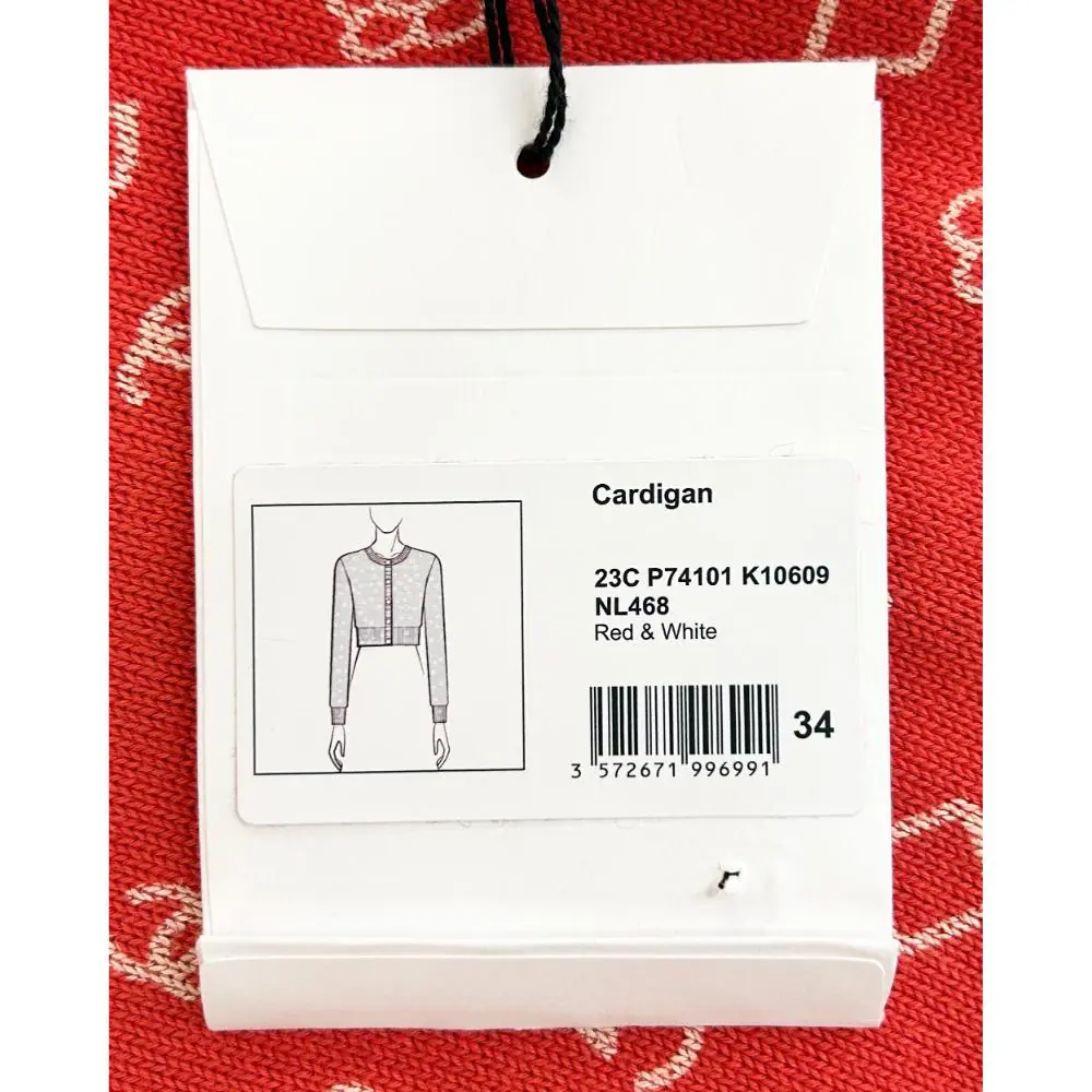 Cropped Chanel knit cardigan. Features long sleeves, a button-down front and screen printed symbols all over. See label pic for material content. Condition: Amazing! One small mark of discolouration inside by the hem. Not visible from outside. Comes with original tag.