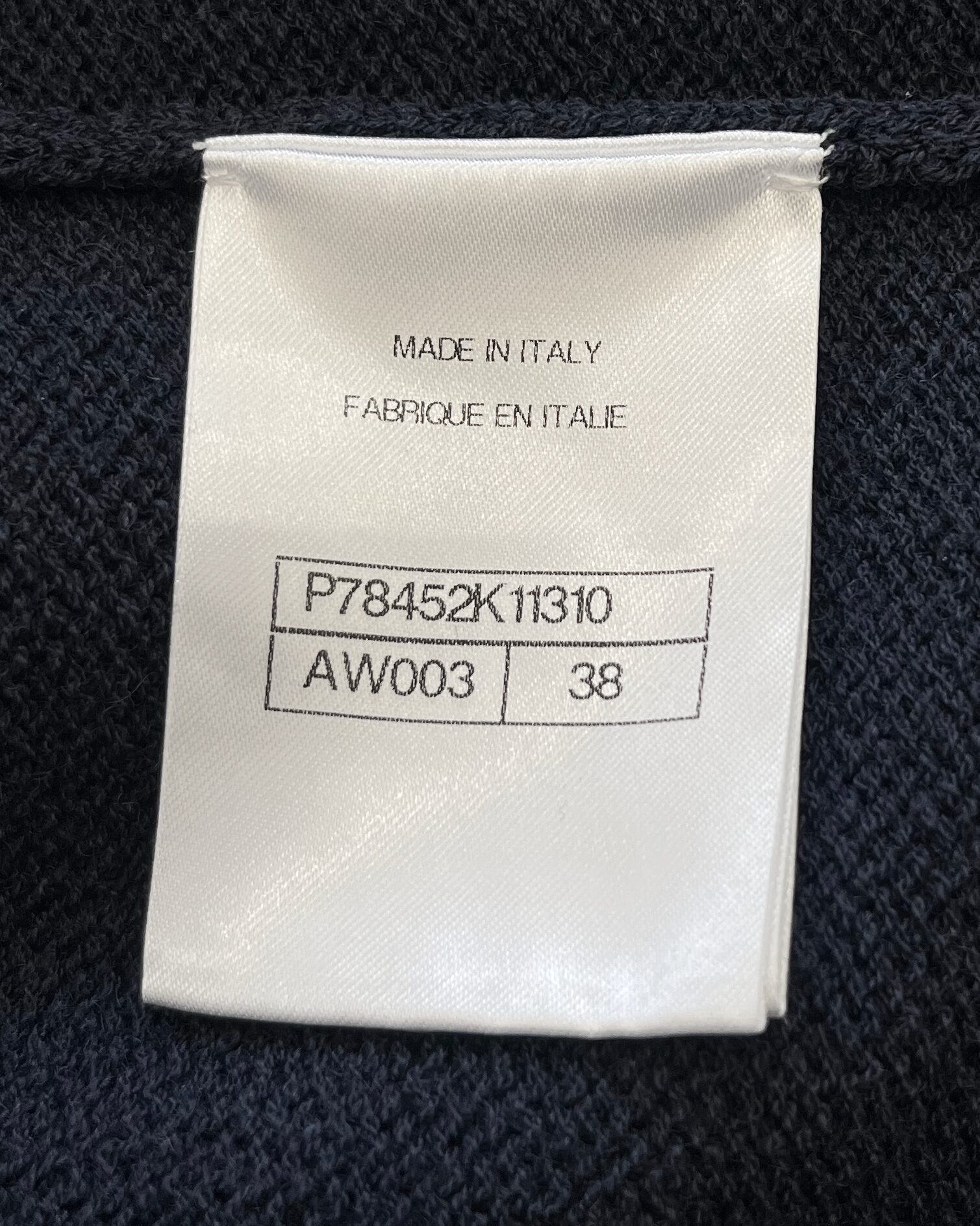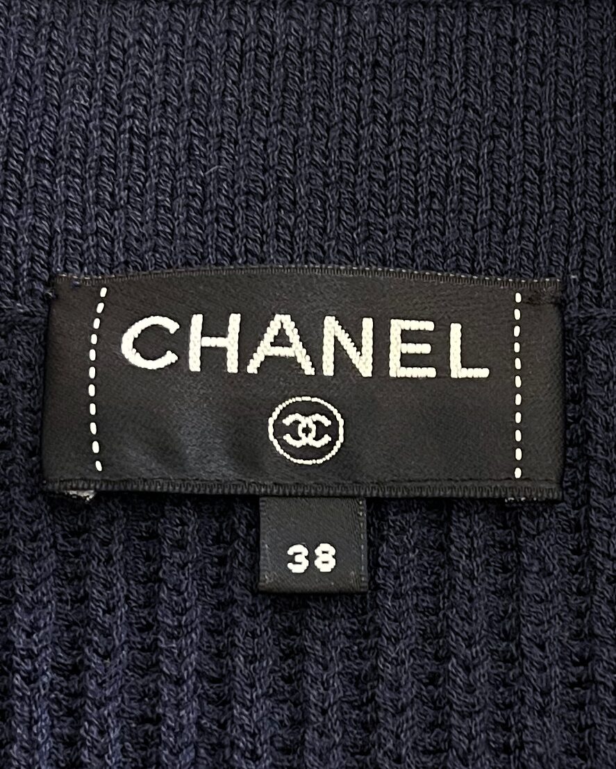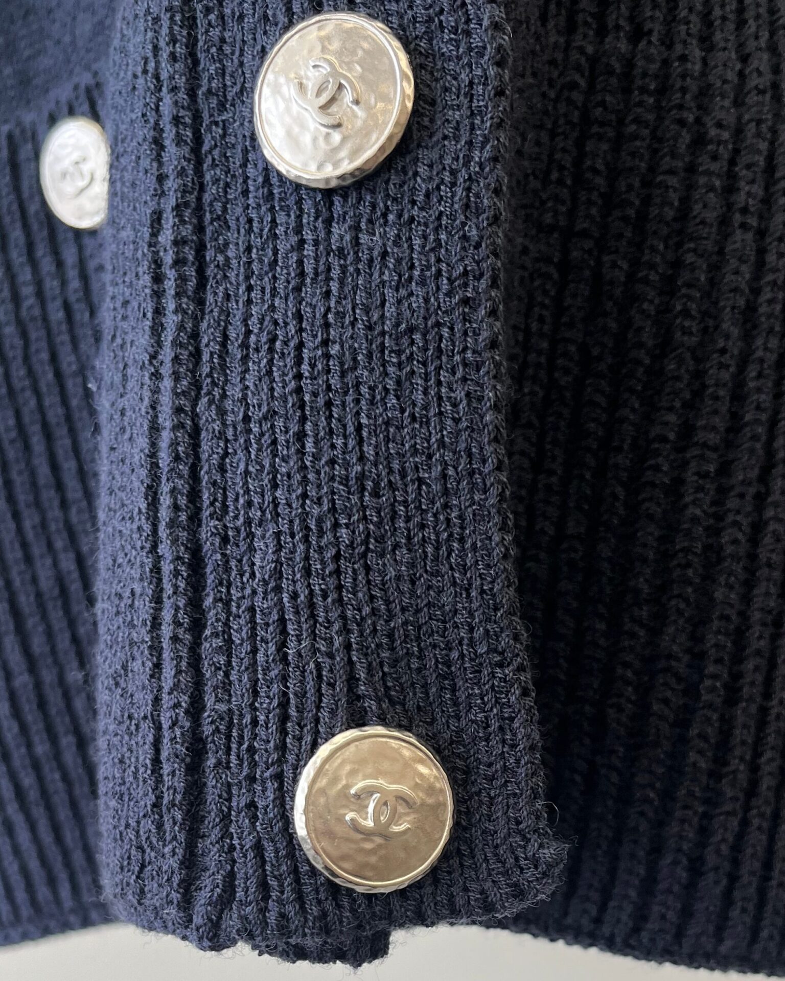 Navy wool knit loose fit cardigan sweater featuring 4 pockets, lapel collar and silver metal textured buttons with ‘CC’ logo embossed on them.