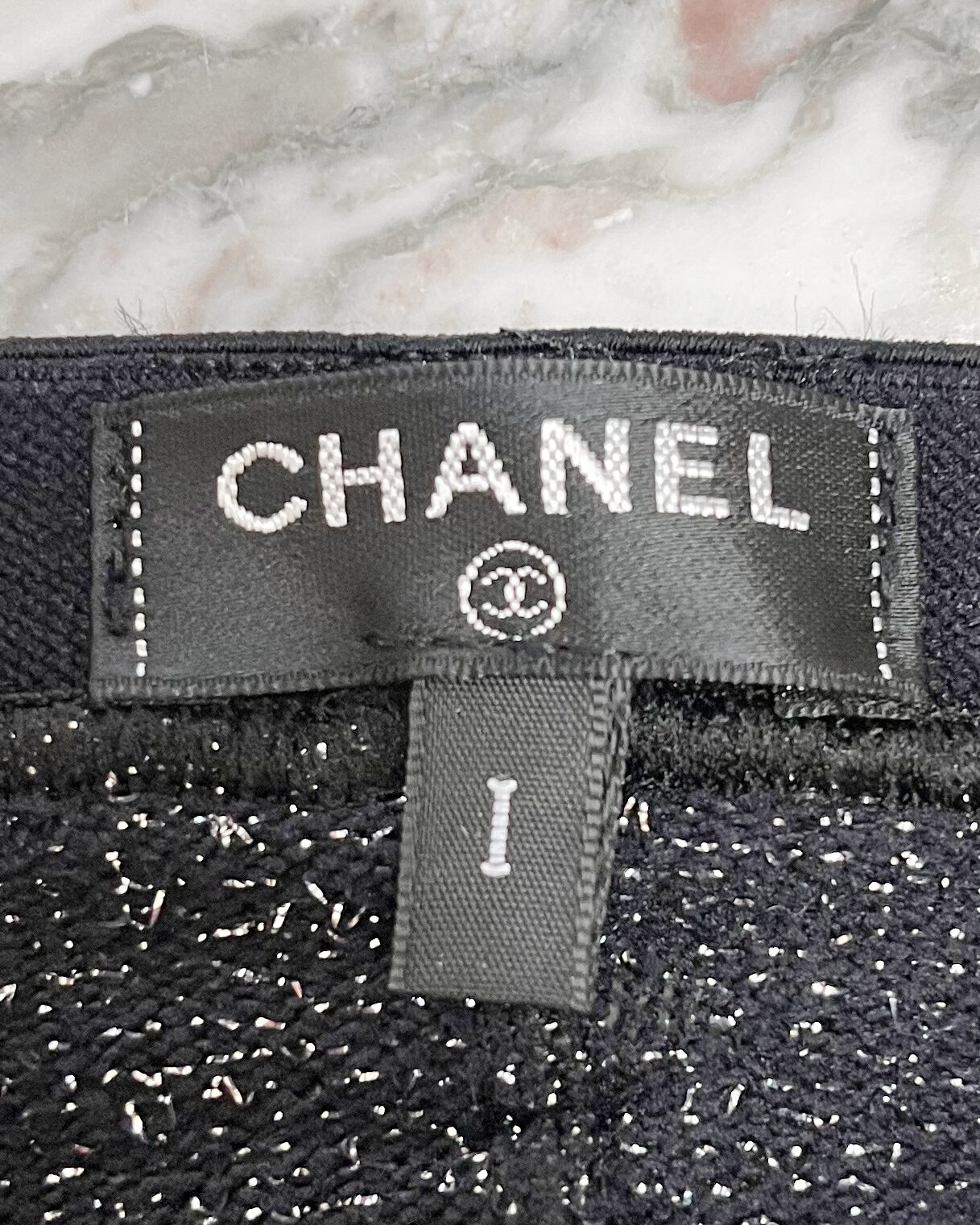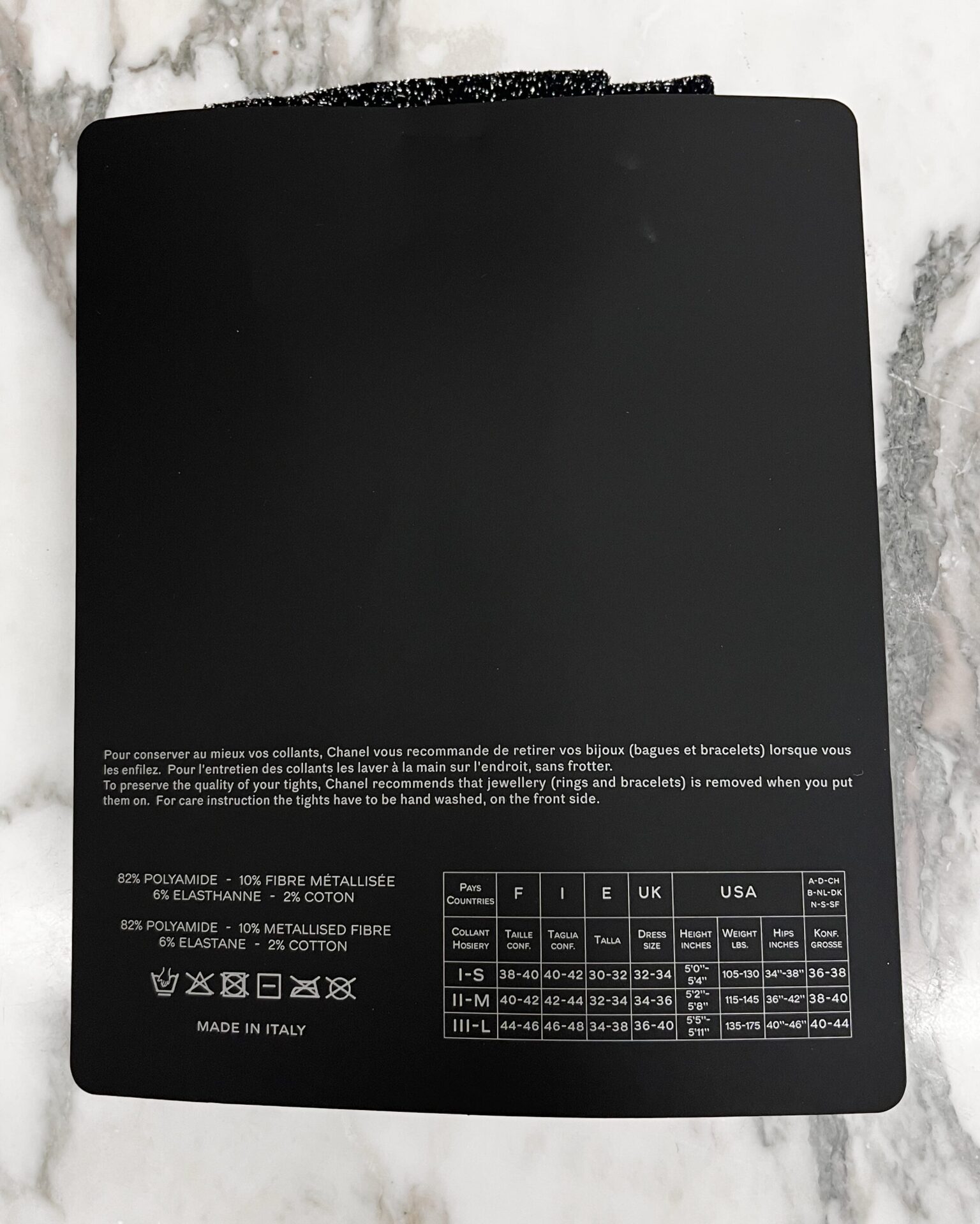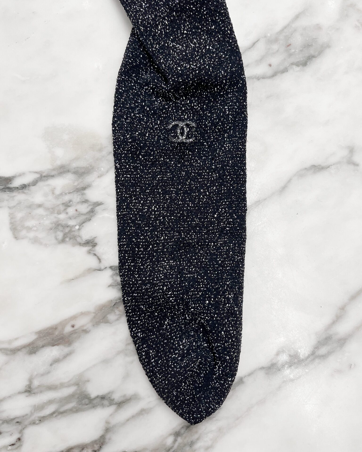 Brand new black and silver chevron knit tights with a logo embroidered elastic waistband, and Chanel “CC” patch on the ankle.