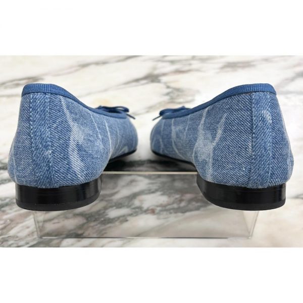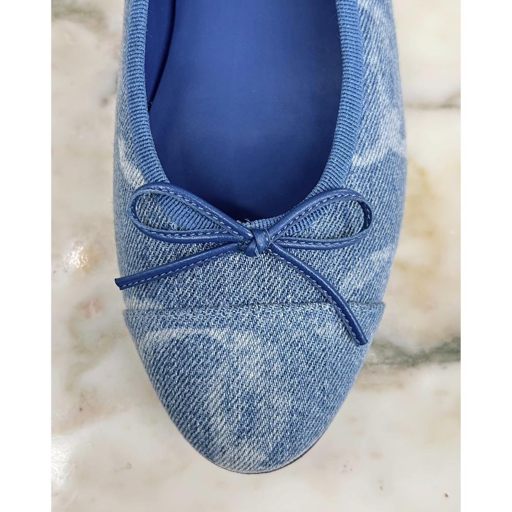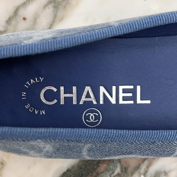 Blue denim flats, with a dyed CC logo print and leather bow detail. The flats are lined in leather and have leather outsoles. Size 38 (US 7.5). They come with dust bags. Condition: Very good. Some wear on the outsoles. One faint discolouration mark on the left shoe, and one little damage in the denim on the back of the right shoe (see image).
