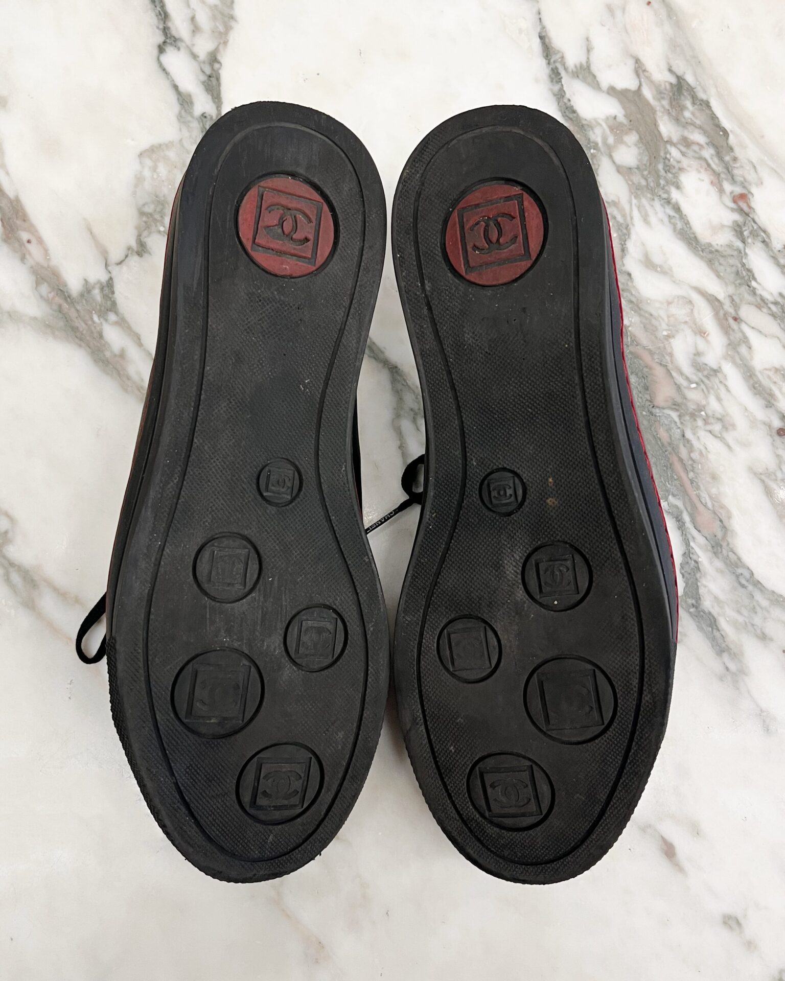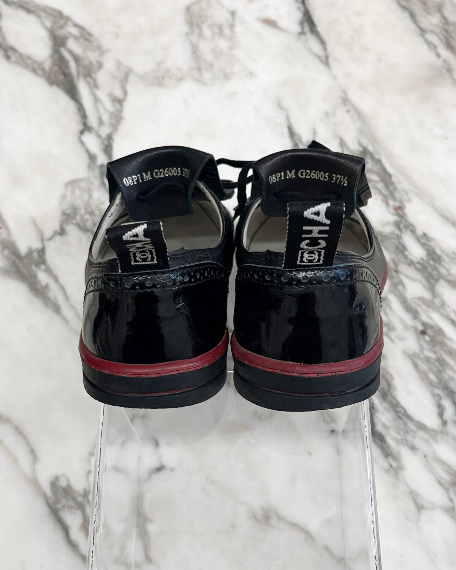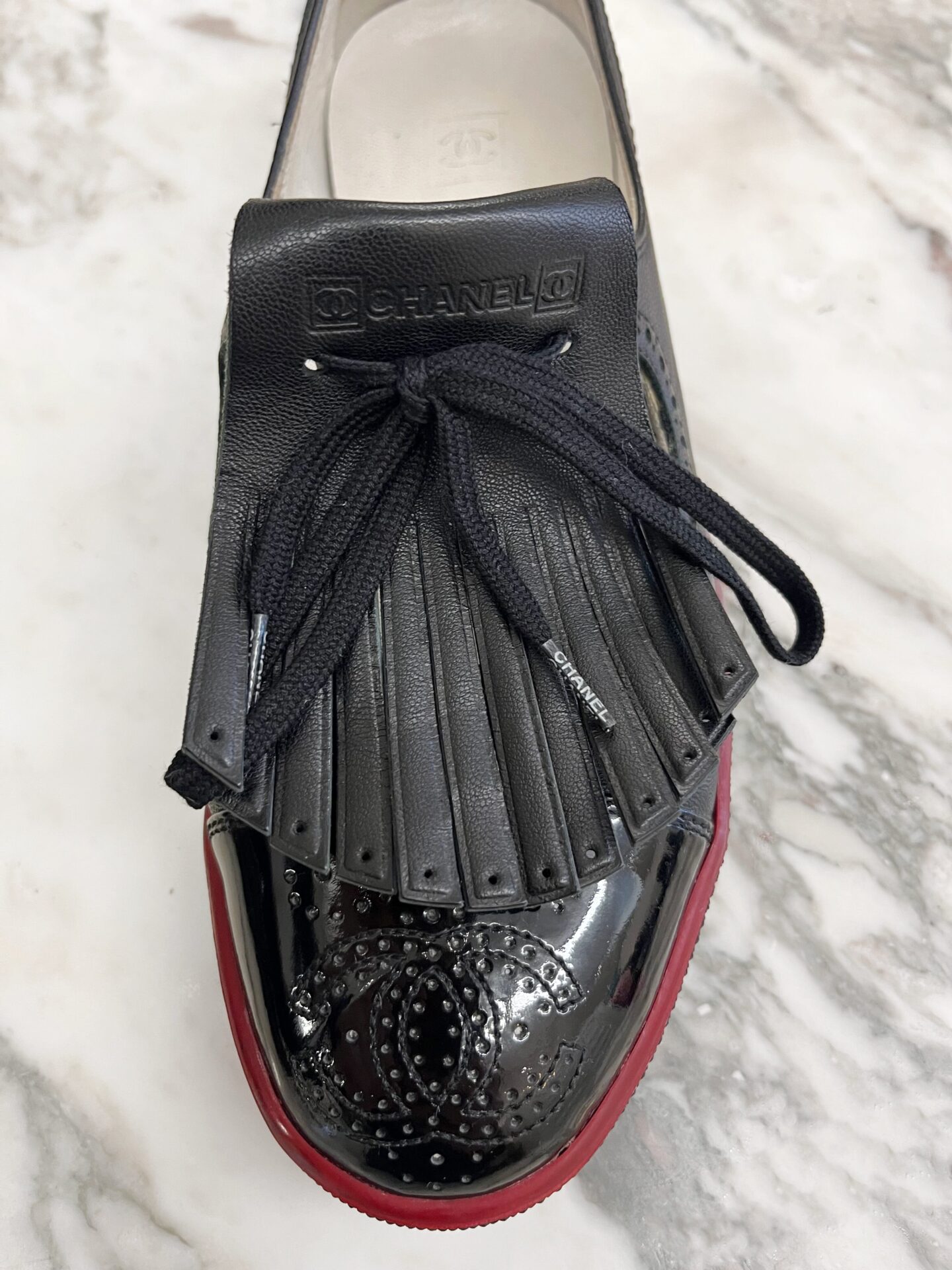 Black leather & patent open-top sneakers with red stripe on sole, leather fringe strip with debossed logo, branded pull tabs, and wingtip style debossed logo on toe. Includes dustbags