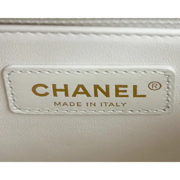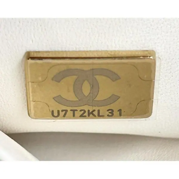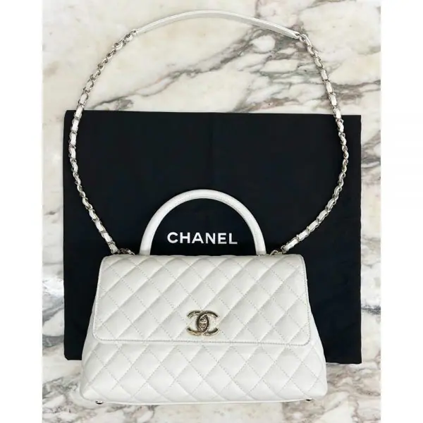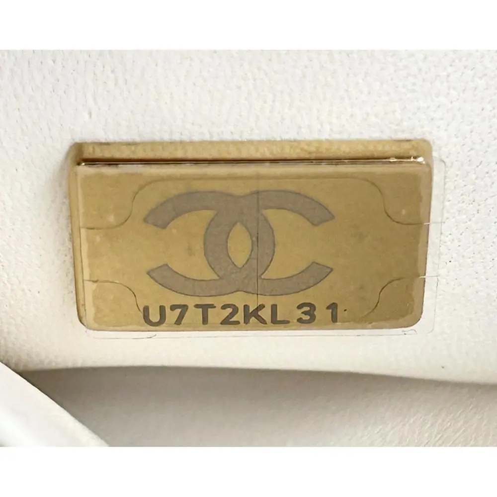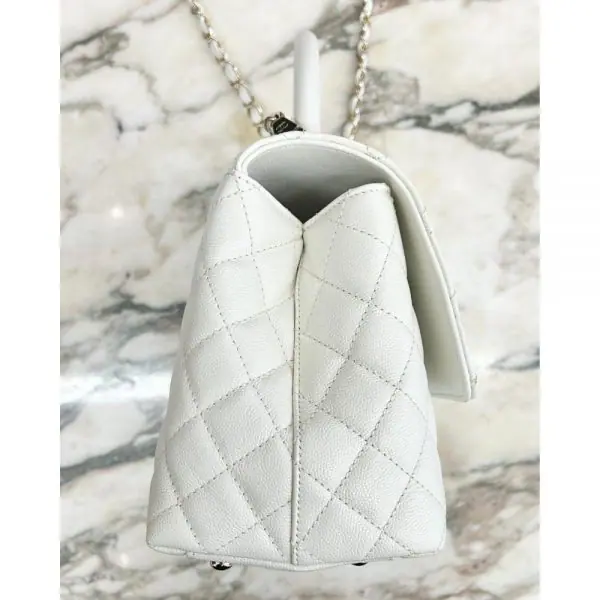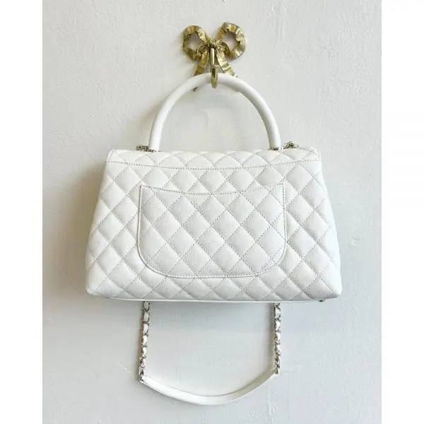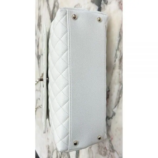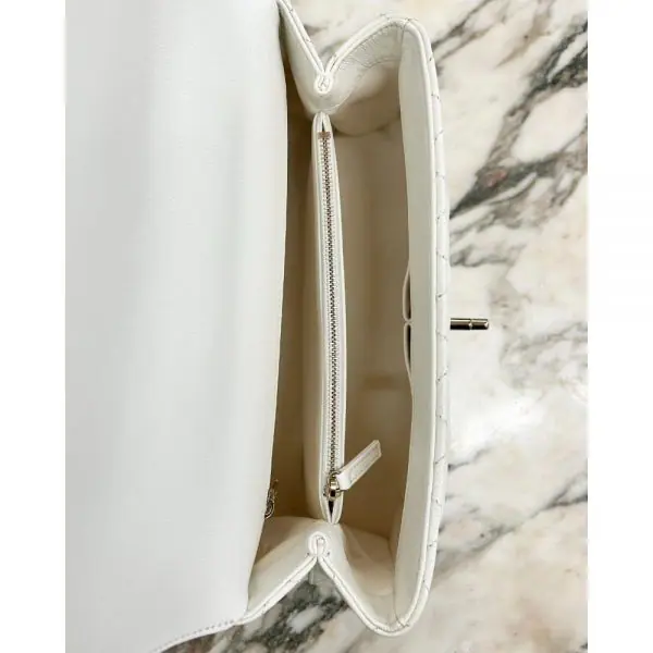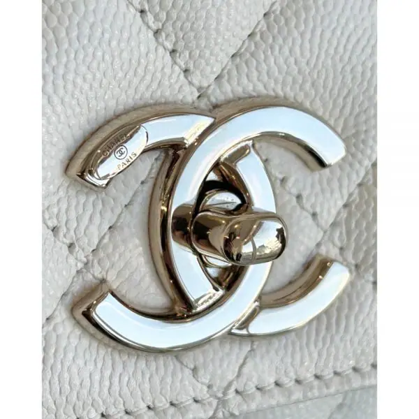 Cream caviar leather bag with light gold metal hardware. It has a top handle and a removable long leather/chain strap. The twist clasp opens the bag to a matching cream leather interior with multiple compartments and pockets. Comes with a dust bag. Bag dimensions: 11″ x 7″ x 4.5″ (W x H x D). Handle drop: 3.25″. Long strap drop: 18.5″. Condition: Purrrfect. No flaws. Protective plastic still on some hardware.