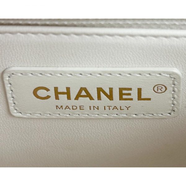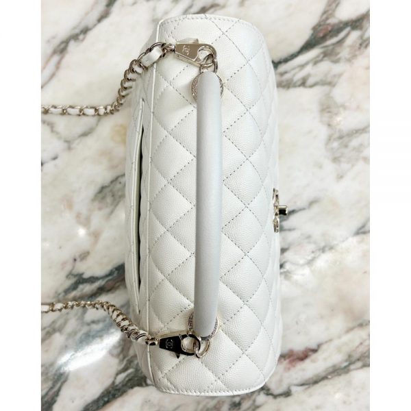 Cream caviar leather bag with light gold metal hardware. It has a top handle and a removable long leather/chain strap. The twist clasp opens the bag to a matching cream leather interior with multiple compartments and pockets. Comes with a dust bag. Bag dimensions: 11″ x 7″ x 4.5″ (W x H x D). Handle drop: 3.25″. Long strap drop: 18.5″. Condition: Purrrfect. No flaws. Protective plastic still on some hardware.