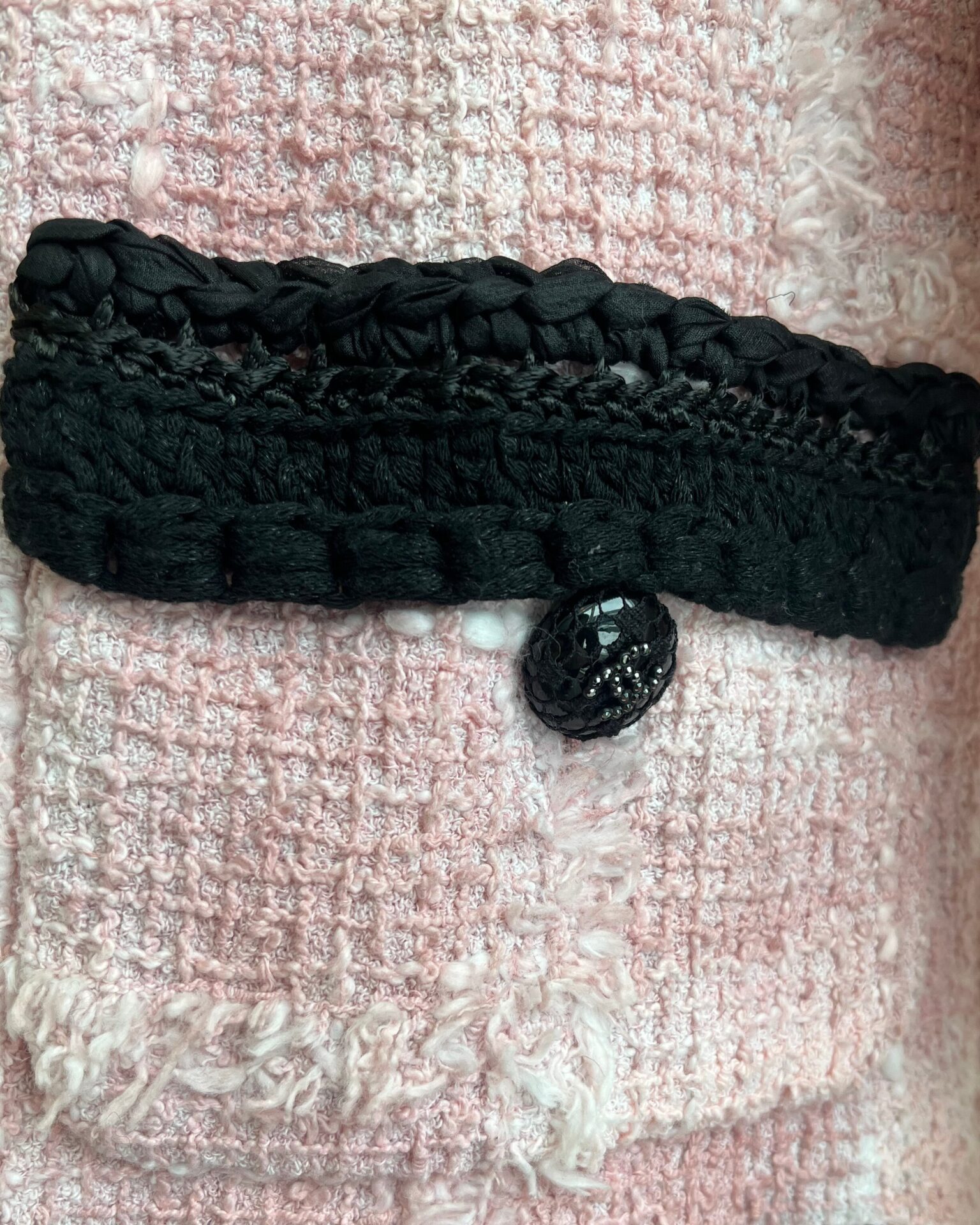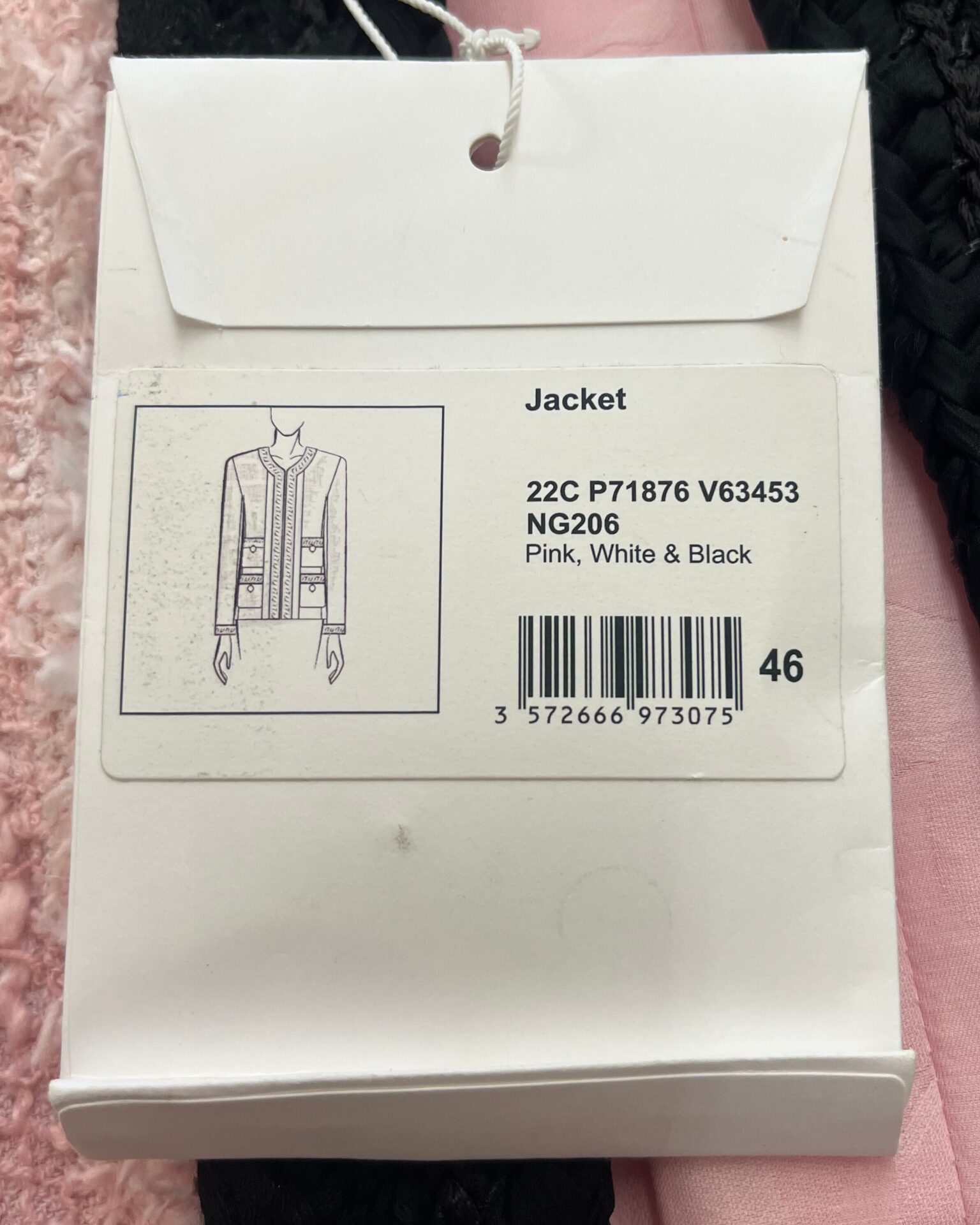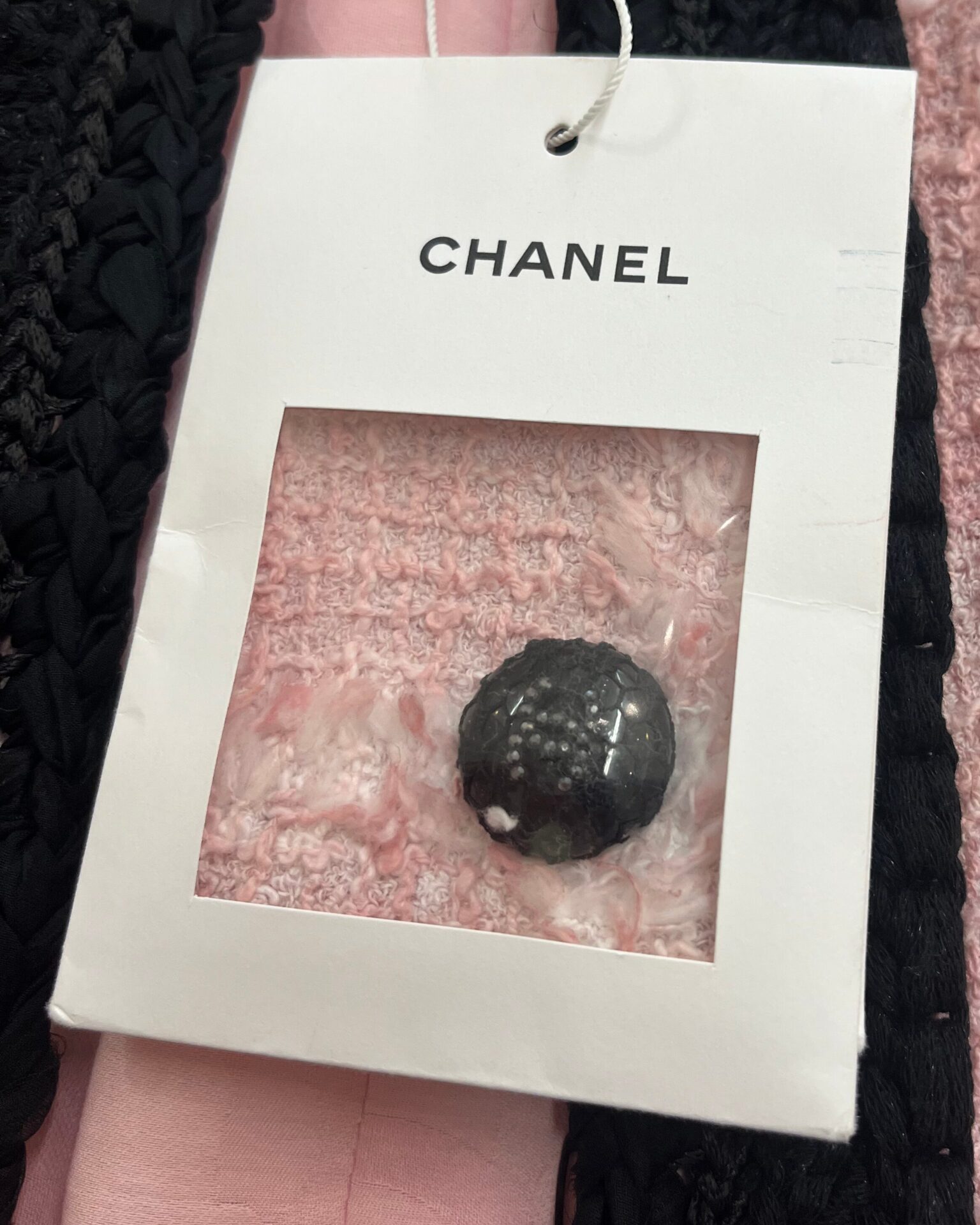 Brand new with tags pink tweed jacket with a black braided trim around collar, pockets and cuffs. Jacket has 4 front pockets, logo buttons, metal link chain along the hem lining, and custom Chanel branded hook & eye closure. See photos for material content.