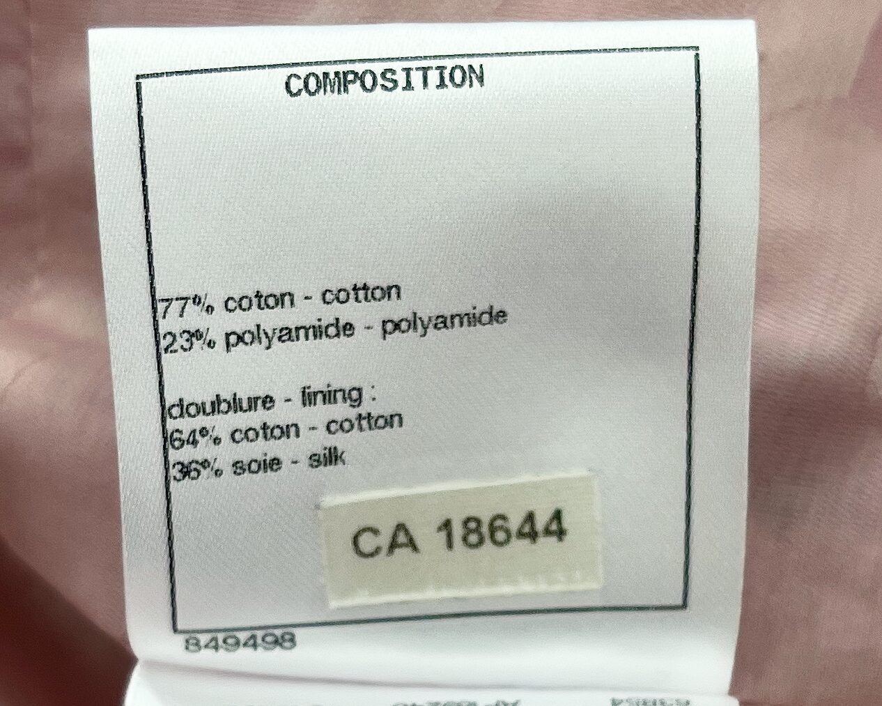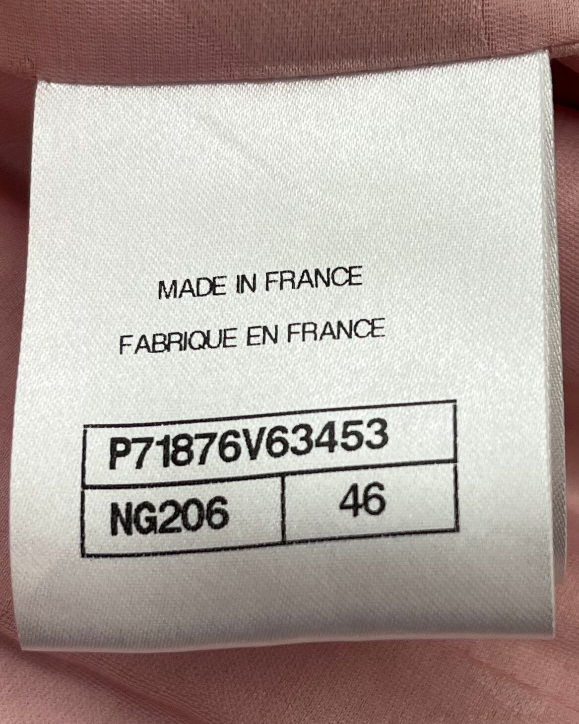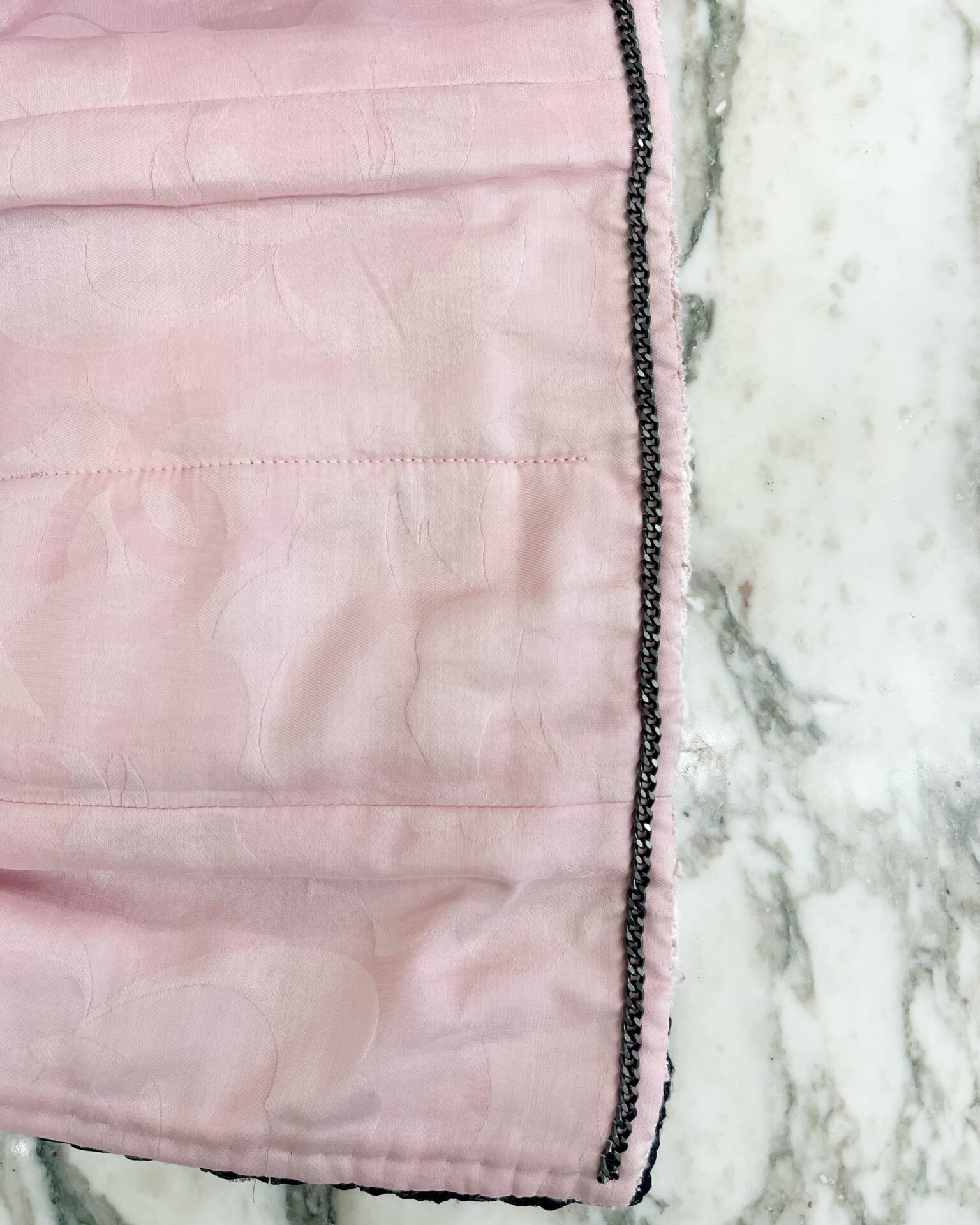 Brand new with tags pink tweed jacket with a black braided trim around collar, pockets and cuffs. Jacket has 4 front pockets, logo buttons, metal link chain along the hem lining, and custom Chanel branded hook & eye closure. See photos for material content.