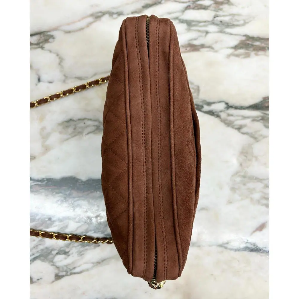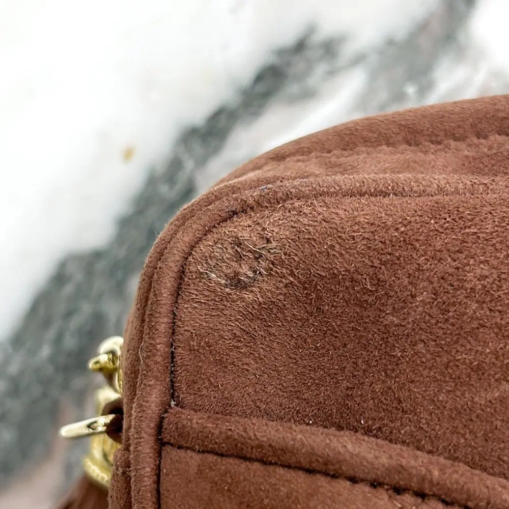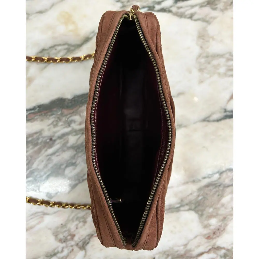Nutmeg brown suede purse with gold tone hardware. The bag zippers open to a burgundy leather interior with a zippered pocket inside. The suede and chain strap is long, so the bag can be worn over the shoulder or crossbody. Comes with a dust bag. Bag dimensions: 9.5″ x 6.5″ x 2.25″ (W x H x D). Strap drop: 18″. Condition: Good. The suede has one small damage on the front corner of the bag (see image). The rest of the bag is in great condition.