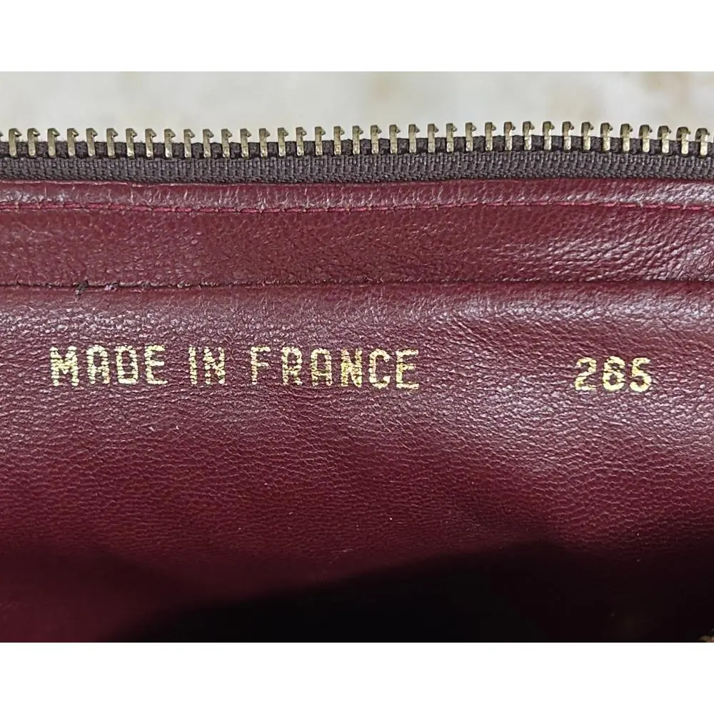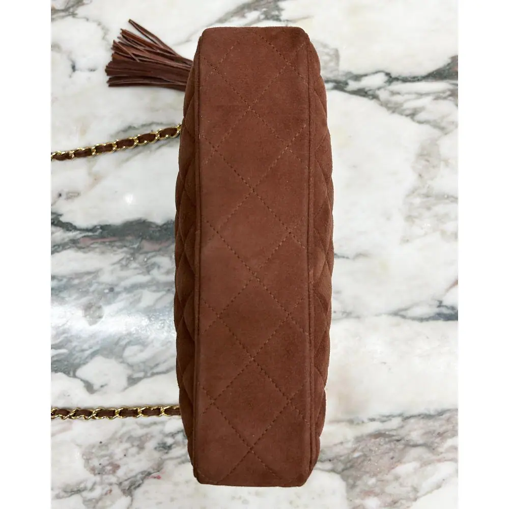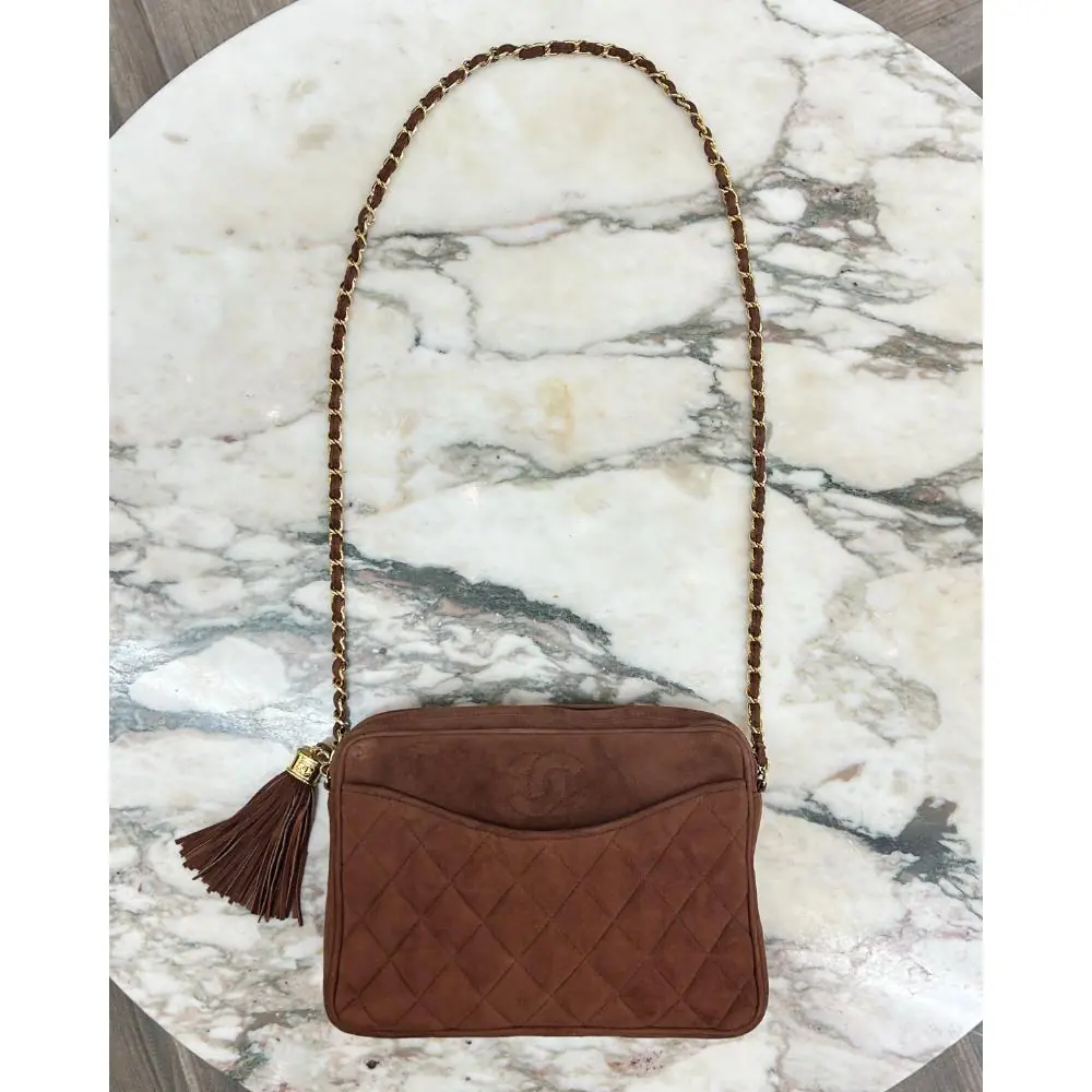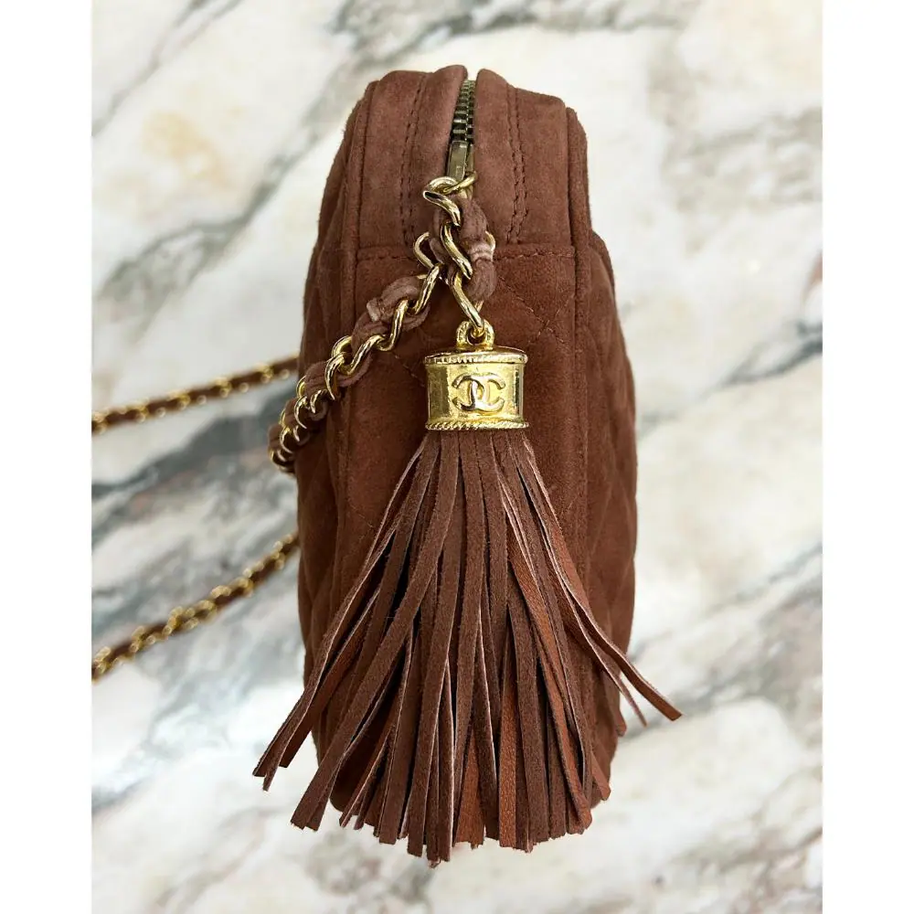 Nutmeg brown suede purse with gold tone hardware. The bag zippers open to a burgundy leather interior with a zippered pocket inside. The suede and chain strap is long, so the bag can be worn over the shoulder or crossbody. Comes with a dust bag. Bag dimensions: 9.5″ x 6.5″ x 2.25″ (W x H x D). Strap drop: 18″. Condition: Good. The suede has one small damage on the front corner of the bag (see image). The rest of the bag is in great condition.