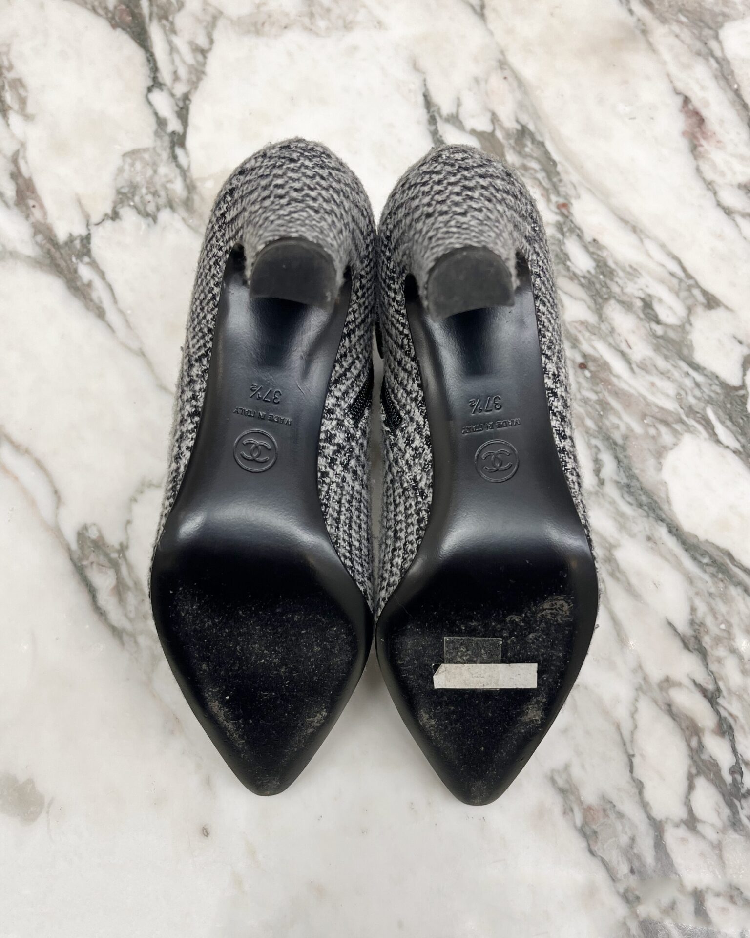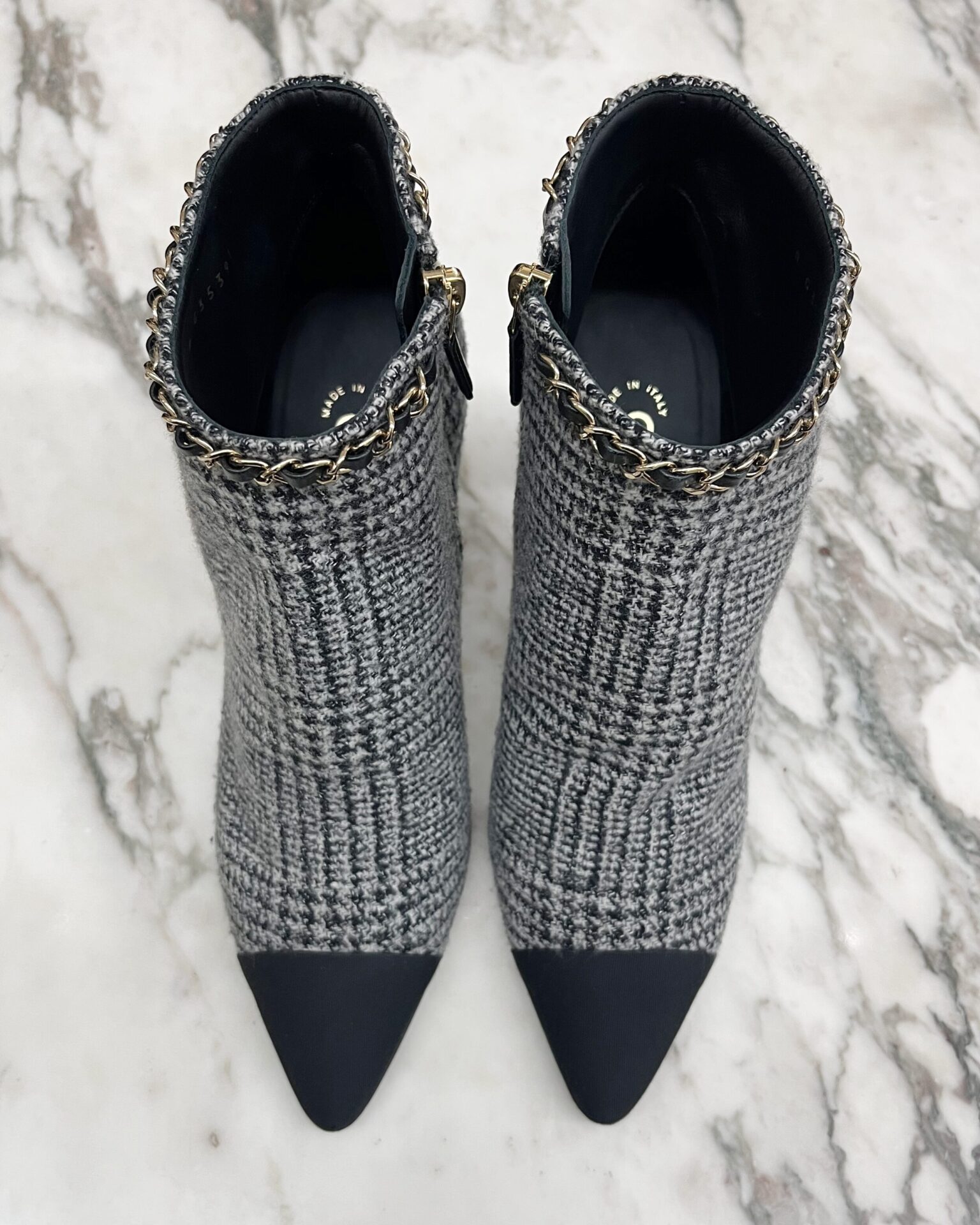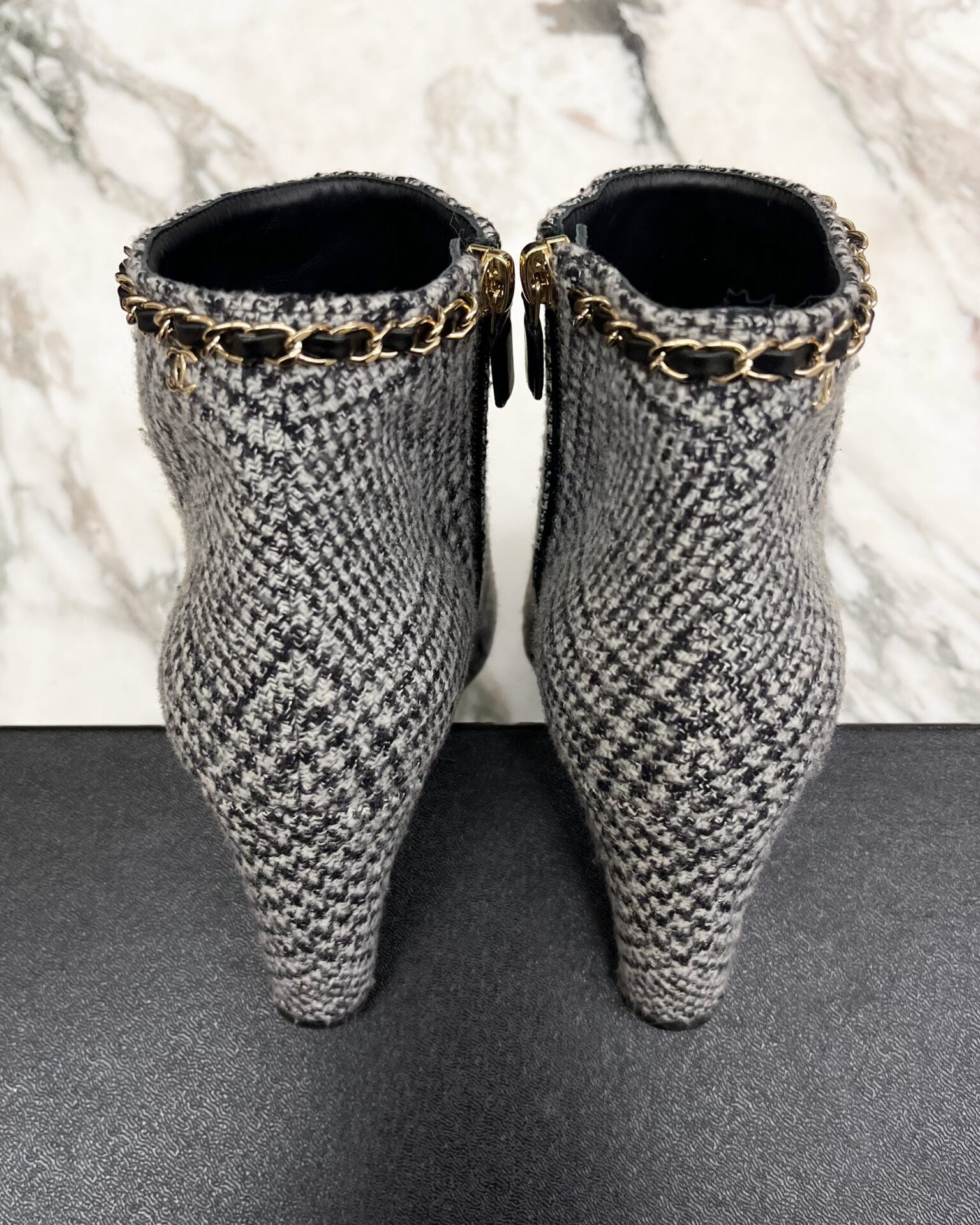 Chanel wool booties with 3.25″ heel, black pointed toe, leather interior and metal/leather chain trim detail with metal ‘CC’ logo. Includes box.