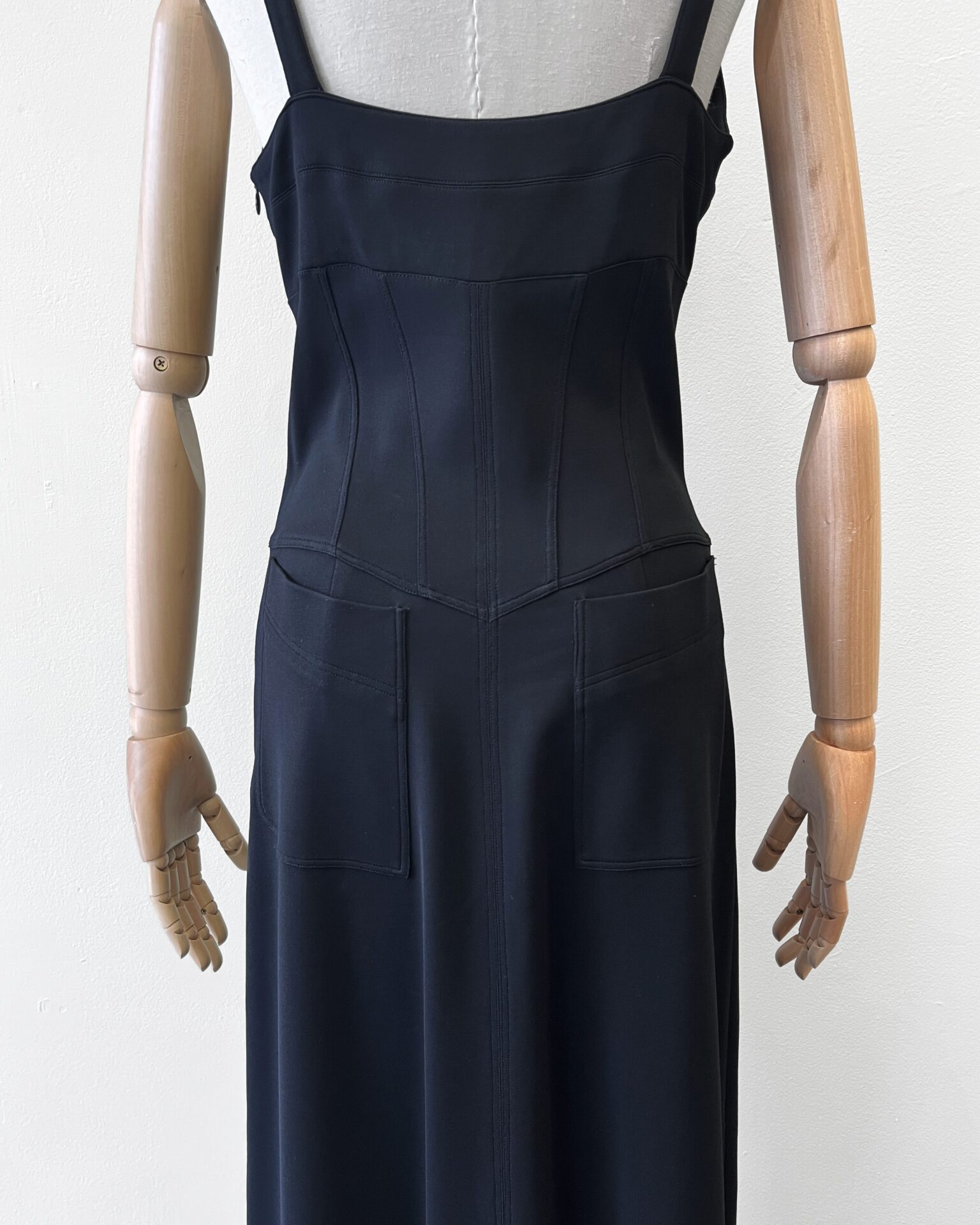 Inky black form-fitting bodycon sleeveless dress featuring two back pockets, a side zip and back slit.