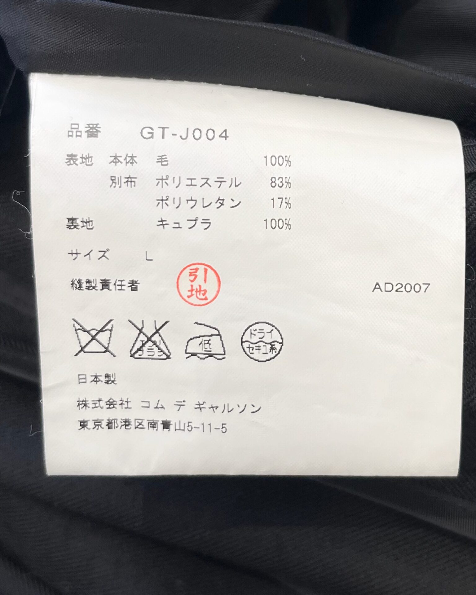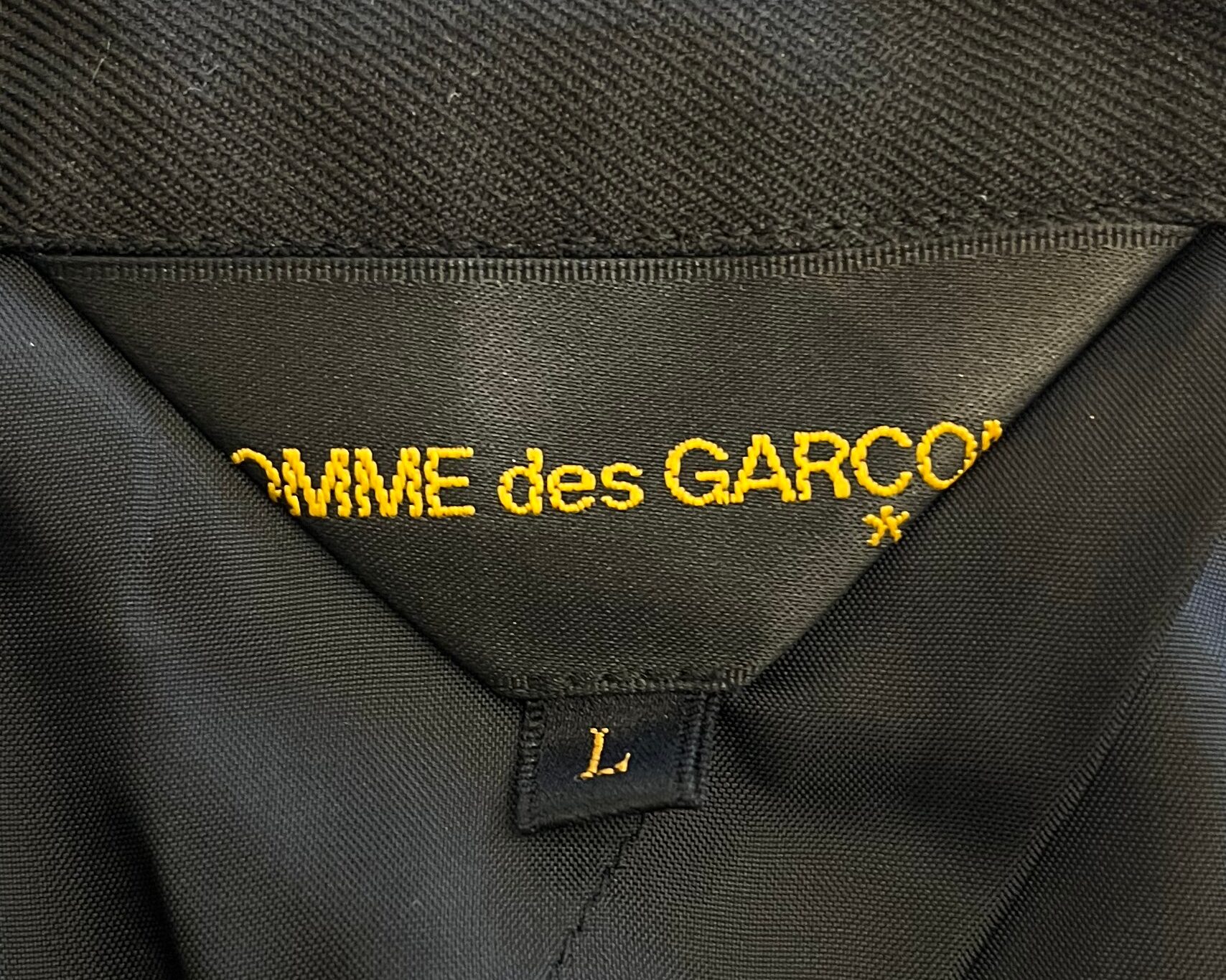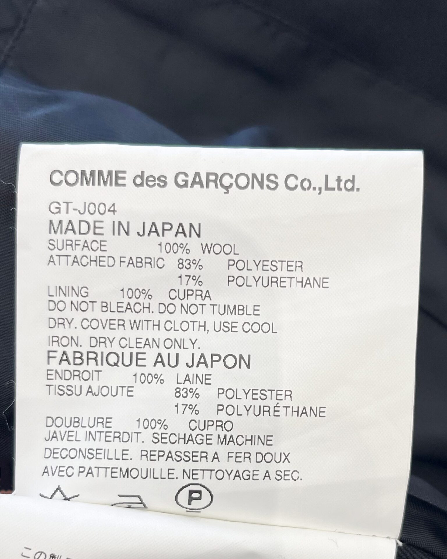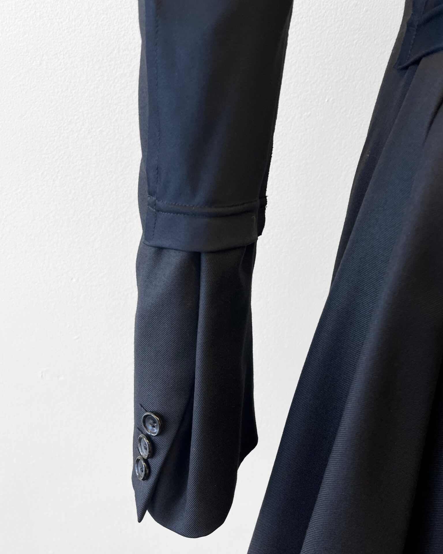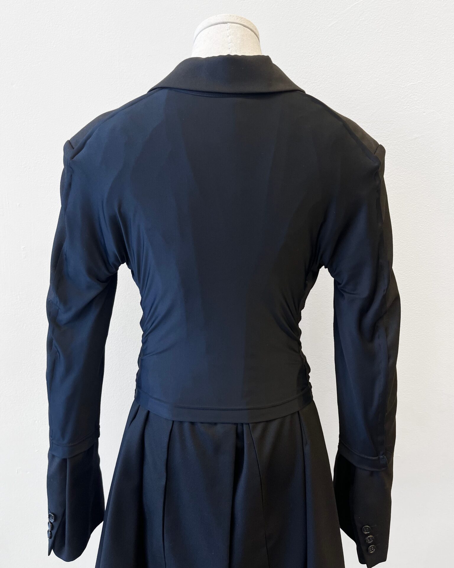 Comme Des Garcons inky black button up jacket with navy spandex panel on the back that creates waist cinch and flare effect.