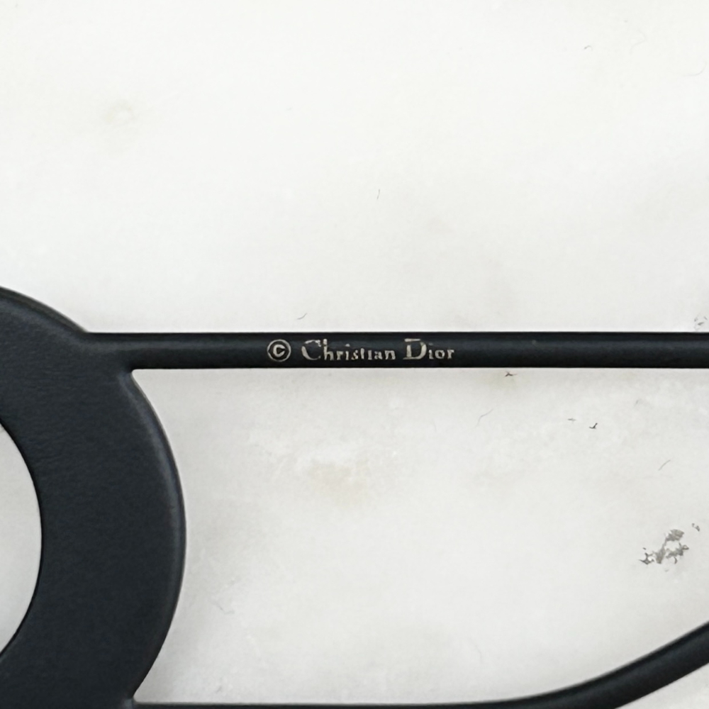 Black sunglasses with ombre grey lenses and matte black metal temples. The temple hinges have cutout CD logos. Comes with a case. Dimensions: Lens width: 55 mm. Bridge width: 22mm. Temple length: 135mm. Condition: Purrrfect. No flaws.