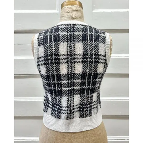 Plaid knit sleeveless sweater. Made from a lightweight mohair/wool blend that is slightly sheer. See label pic for material content. Condition: Purrrfect! No flaws. Original tag still on.
