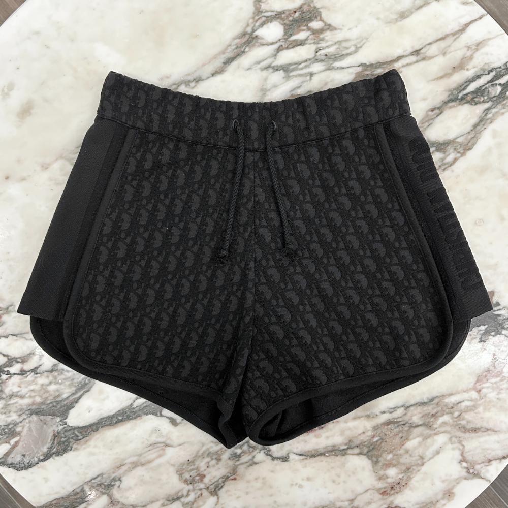 Black terry cloth mini shorts. They have an embroidered Oblique pattern all over, and have logo lettering down the left side. They also have a drawstring and elastic waistband to ensure a comfortable fit. See label image for material content. Condition: Purrrfect. No flaws.