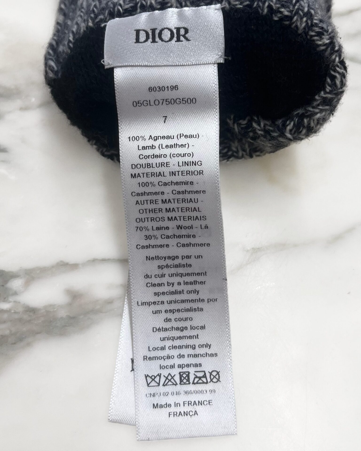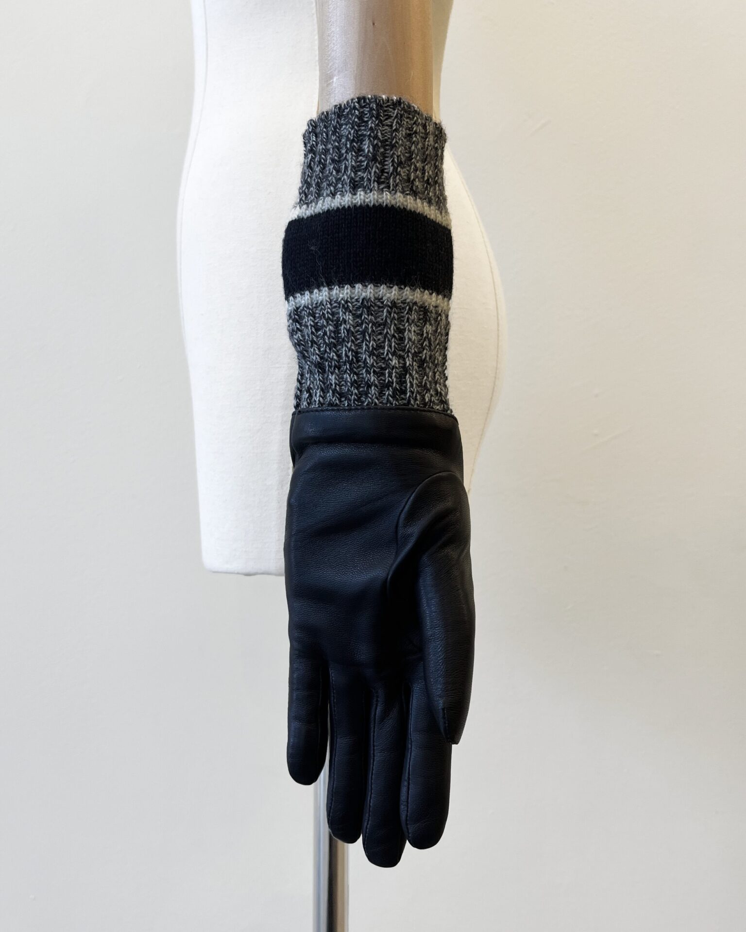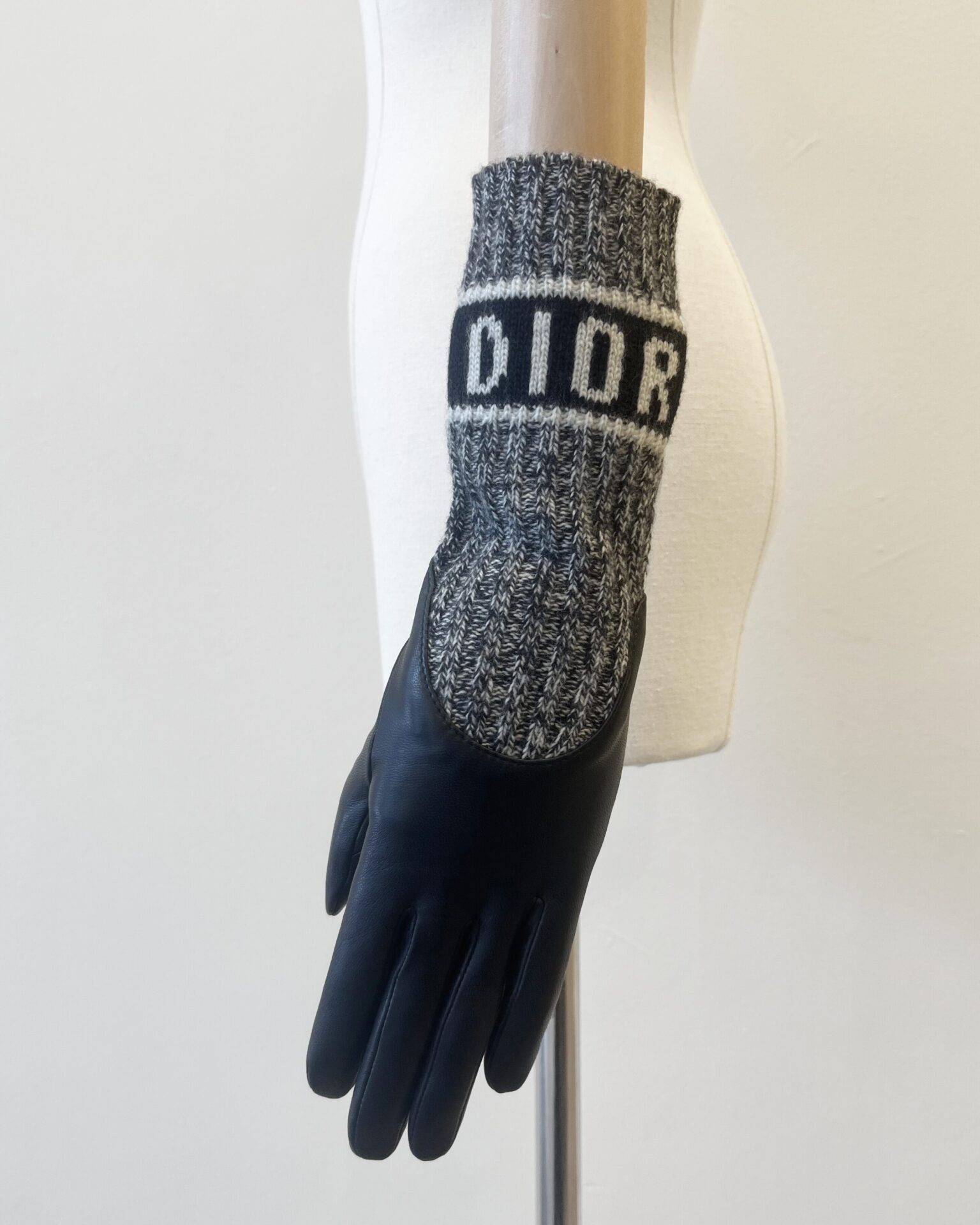 Dior gloves with knit cashmere sleeves and navy leather hands. Sleeves feature a Dior logo spellout.