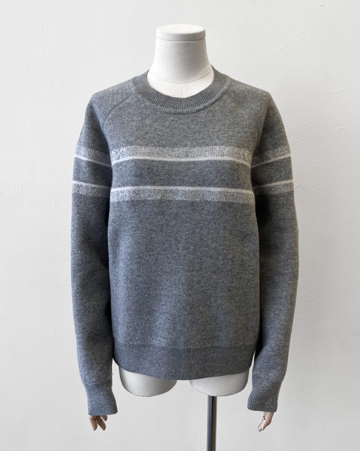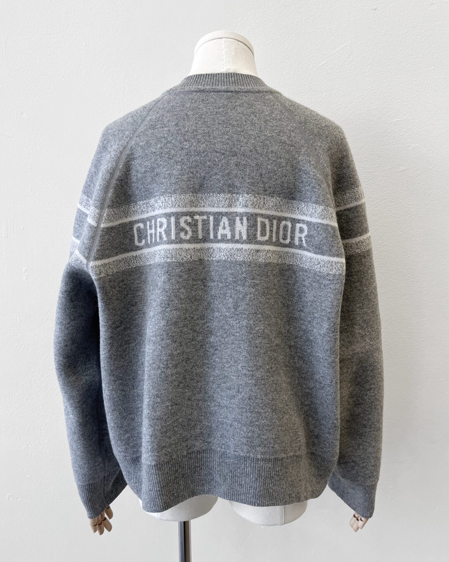 Grey knit cashmere sweater with Dior Oblique print & logo spellout on the back. Sans label.