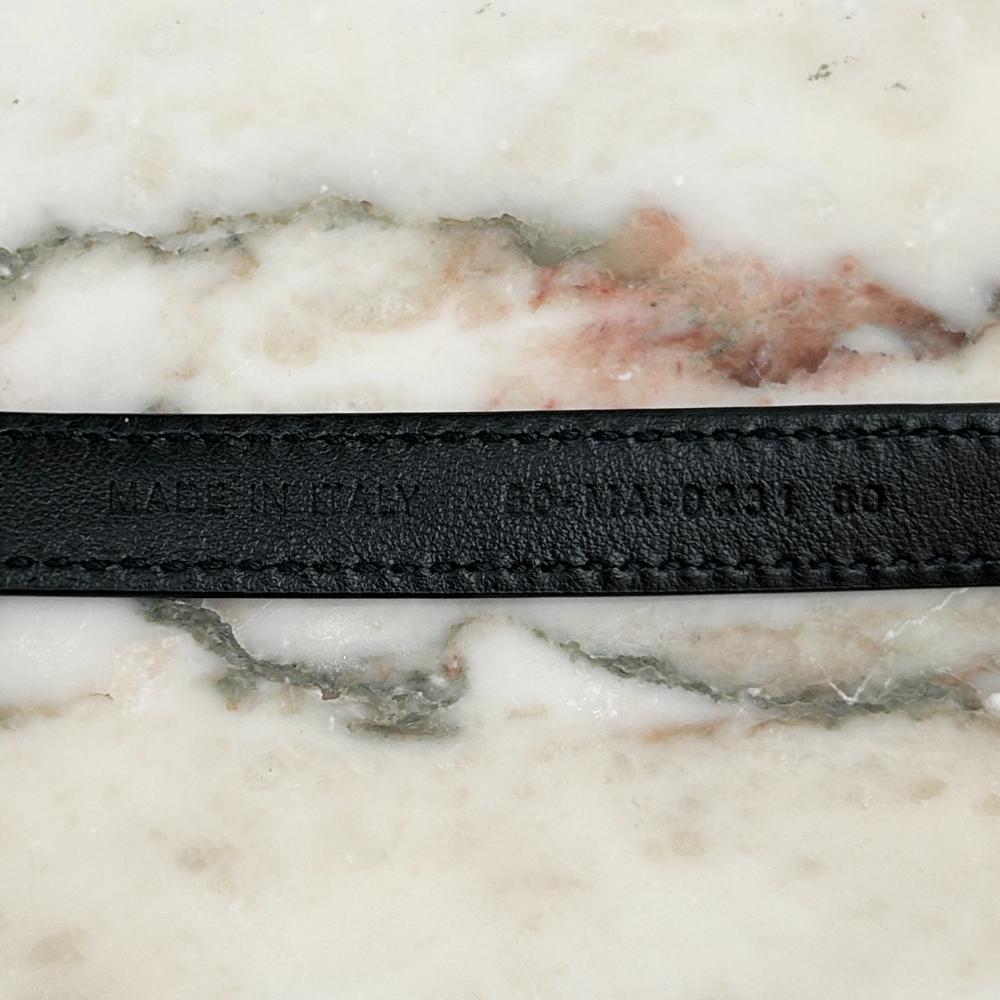 Thin black leather belt with a gold metal and black logo buckle. The belt measures a little over 1/2″ thick, and has an inner circumference of 29.75″ – 33.5″ (adjustable). It comes with a protective pouch. Condition: Purrrfect. No flaws.