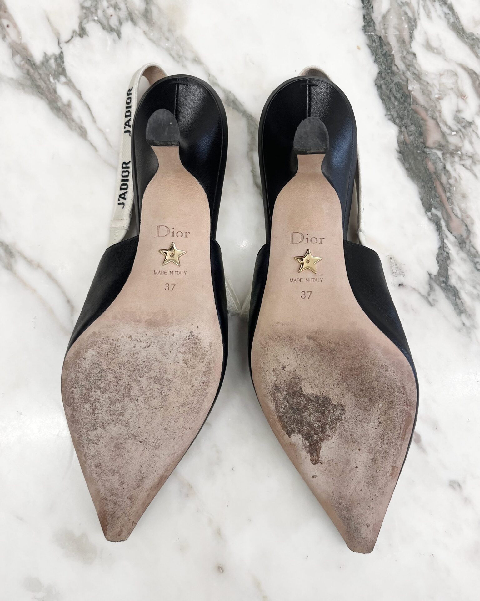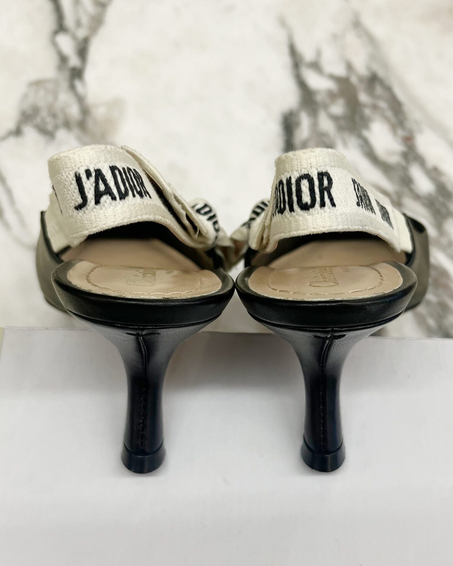 Dior pointed toe black leather pumps with 2.75″ heel and J’Adior spellout on slingback upper with small bow detail. Includes box & dustbags.