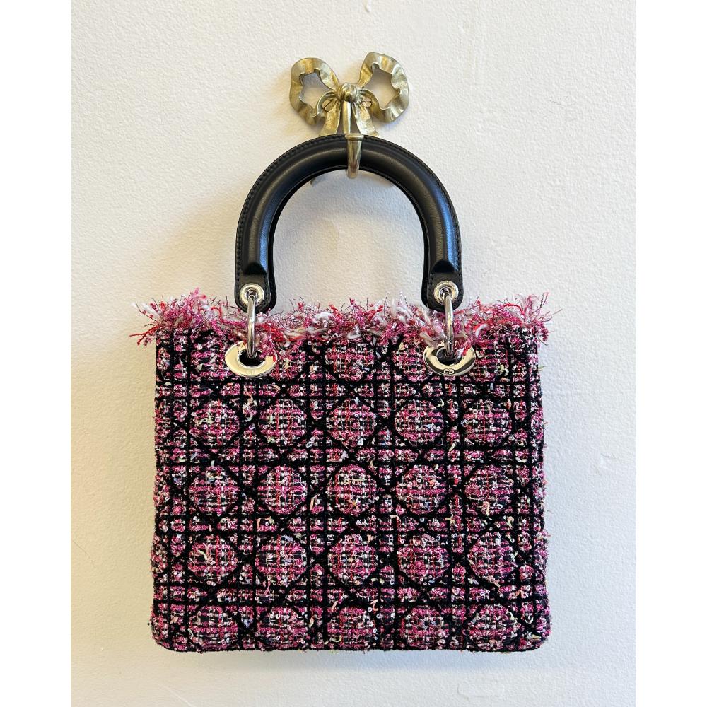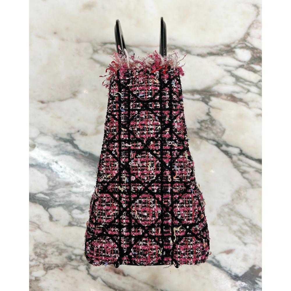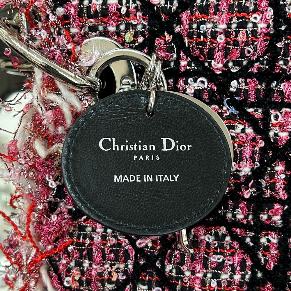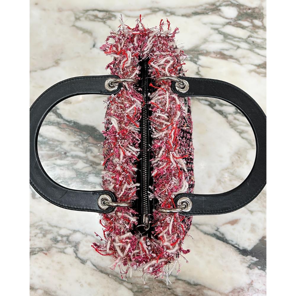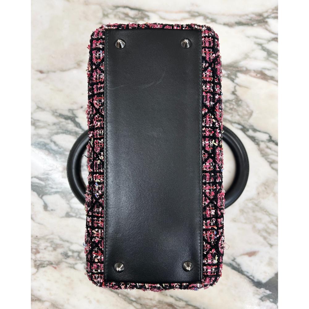 Black and pink tweed bag, with silver hardware, logo letter charms, black leather top handles and a removable cross body strap. The tweed has sparkly yarn woven throughout. The bag’s top zipper opens to a black leather interior. Comes with its authentication card. Bag dimensions: 10″ x 8.5″ x 4.75″ (W x H x D). Long strap drop: 16.5″. Condition: Very good. The leather handles, bottom leather panel, and logo charms have a little bit of wear.