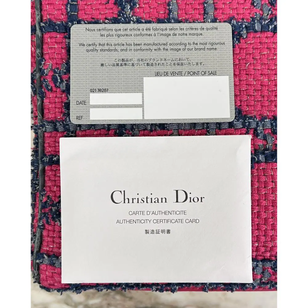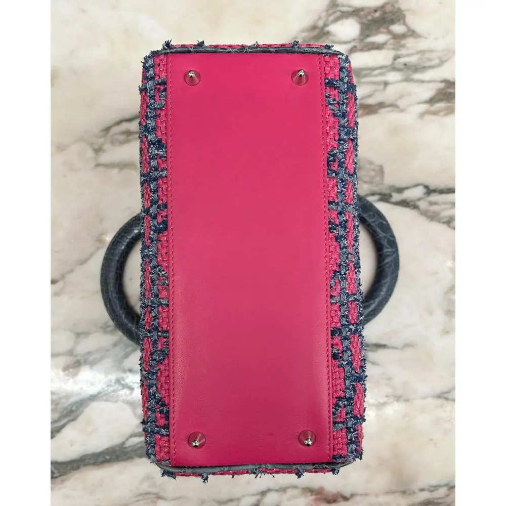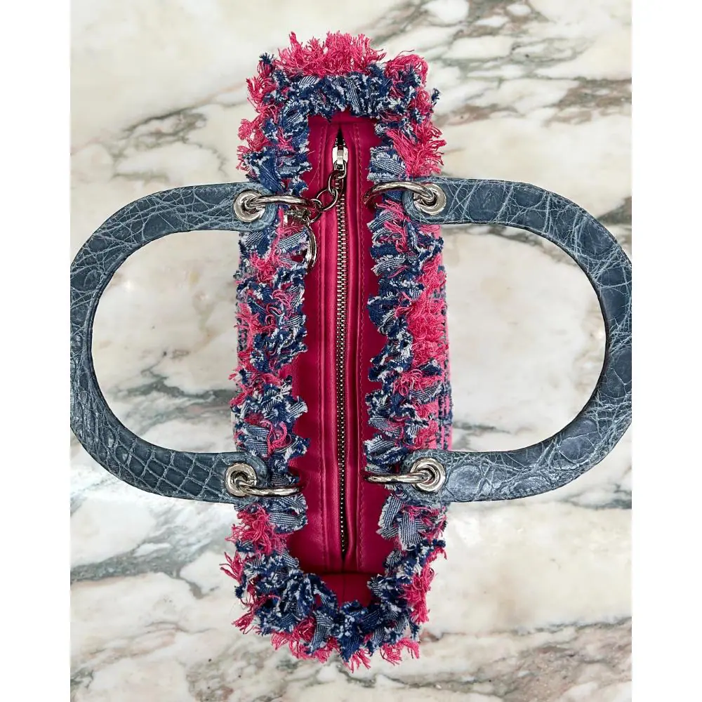 Pink and denim tweed hand bag with blue crocodile handles and trim. The tweed has shimmery thread woven in it, the bag has silver hardware, logo letter charms, and a top zipper. The interior of the bag is pink leather with the same blue croc trim around the inner pocket. Comes with its authentication card. Bag dimensions: 10″ x 8″ x 4.75″ (W x H x D). Condition: Near purrrfect. Has the slightest bit of wear on the letter charms. No other flaws.