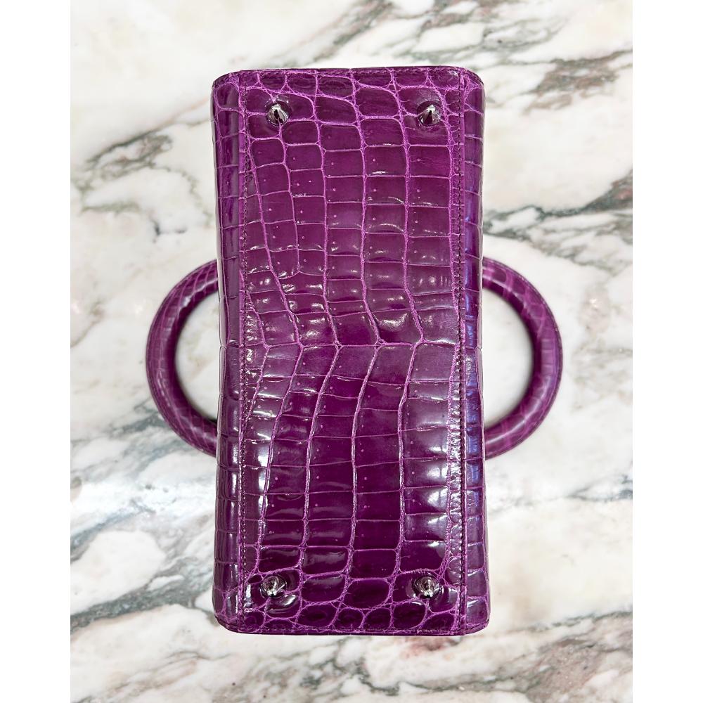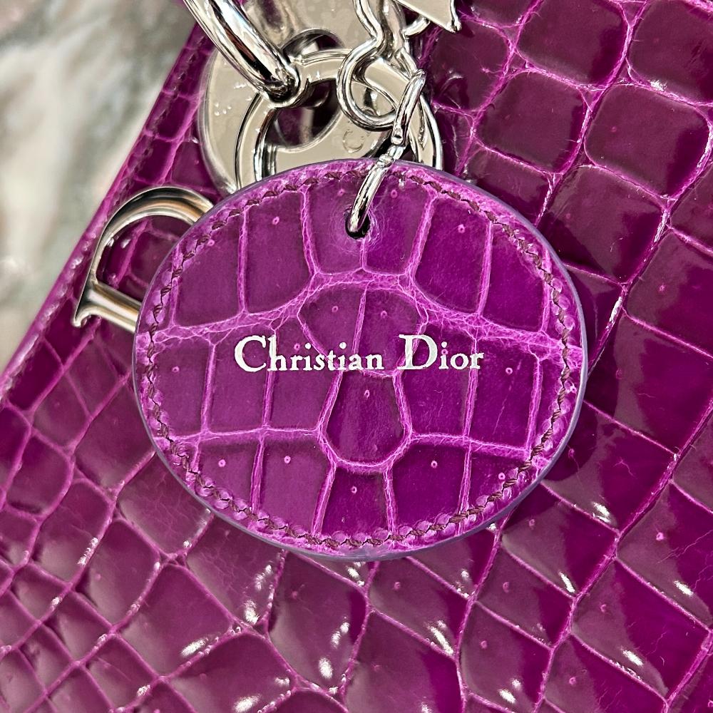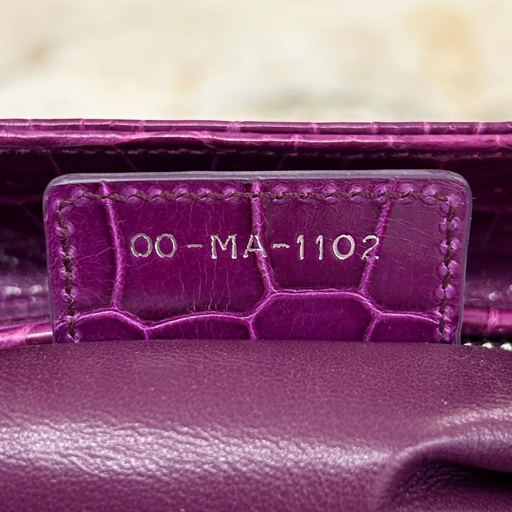 Magenta crocodile leather bag with silver hardware, logo letter charms, top handles, and an attachable long strap. The bag zippers open to a matching magenta leather lining with an inner zippered pocket. Comes with a dust bag. Bag dimensions: 9.25″ x 8″ x 4.5″ (W x H x D). Long strap drop: 16″. Condition: Very good. Two faint scratches on the front of the bag. Protective plastic still on some of the hardware.