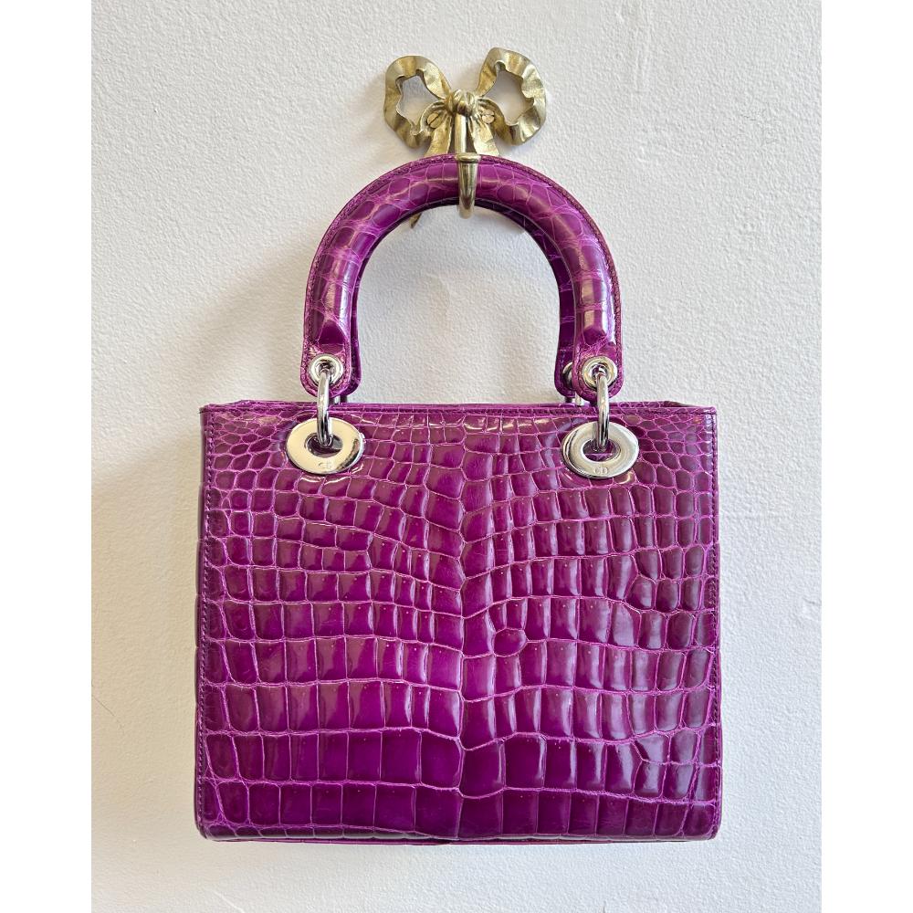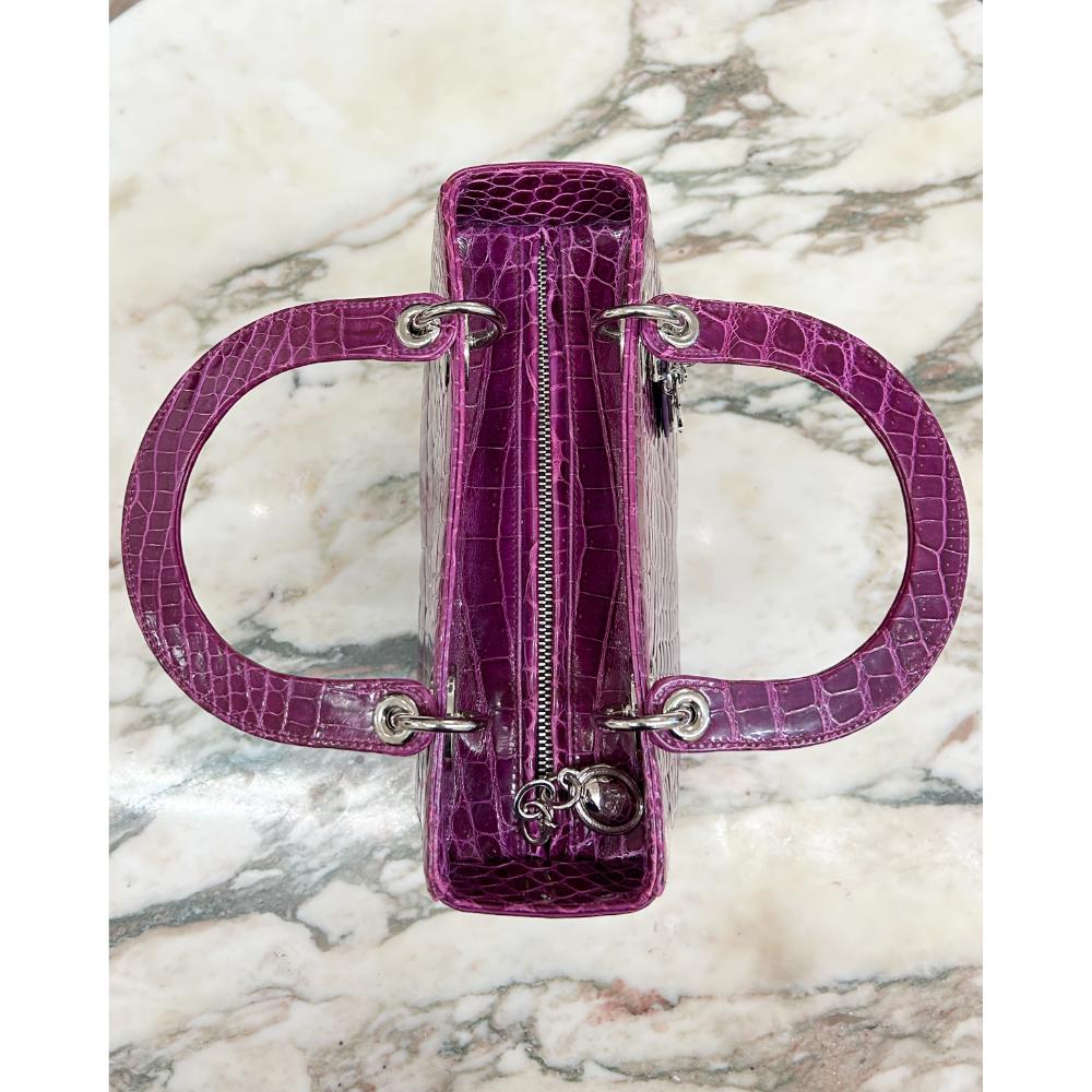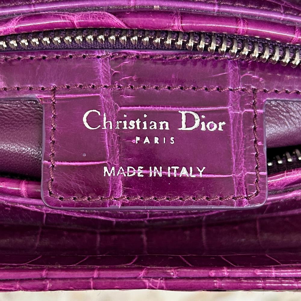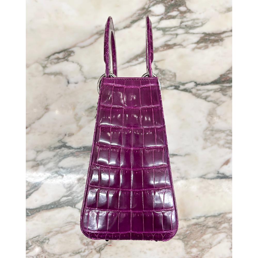 Magenta crocodile leather bag with silver hardware, logo letter charms, top handles, and an attachable long strap. The bag zippers open to a matching magenta leather lining with an inner zippered pocket. Comes with a dust bag. Bag dimensions: 9.25″ x 8″ x 4.5″ (W x H x D). Long strap drop: 16″. Condition: Very good. Two faint scratches on the front of the bag. Protective plastic still on some of the hardware.