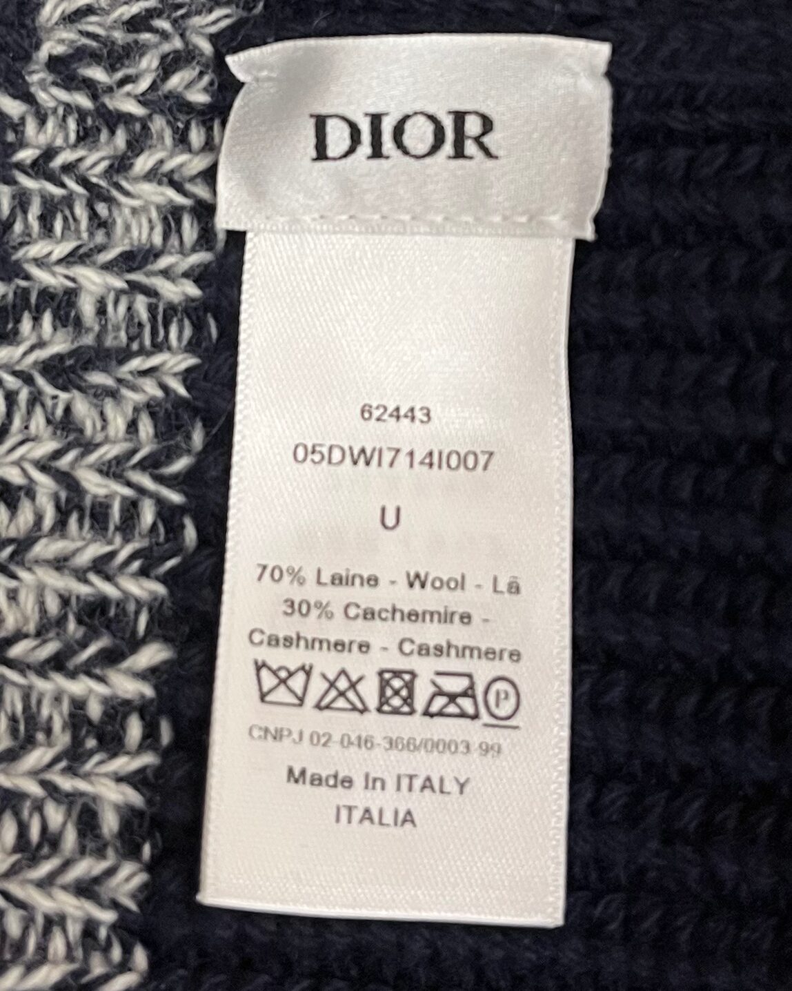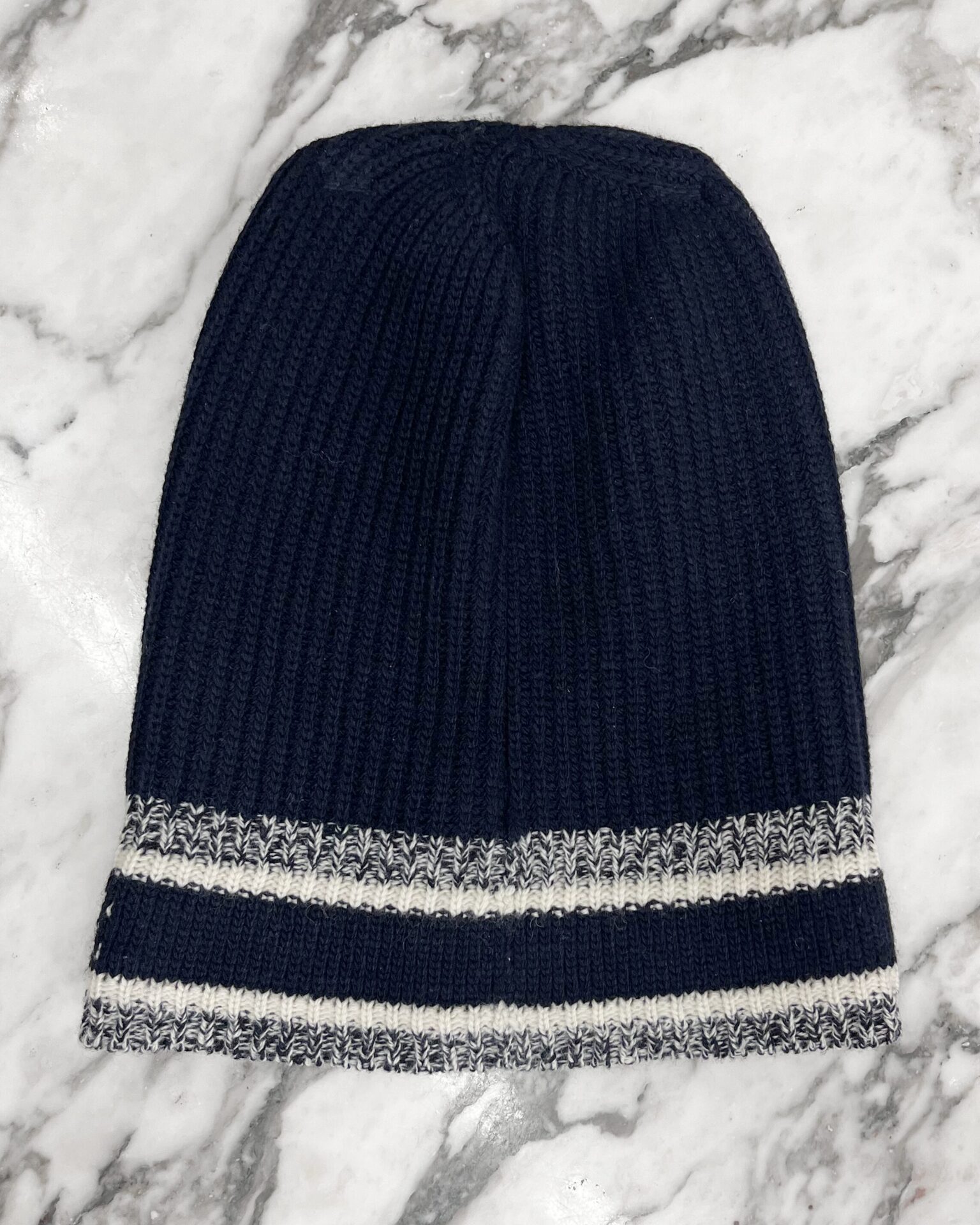Navy wool and cashmere ribbed knit beanie with a cream and grey knit logo band. See material content on tag image. Base circumference: 18″, stretches up to 23″. Condition: Purrrfect. No flaws.