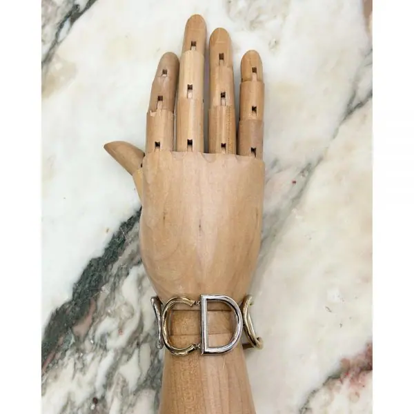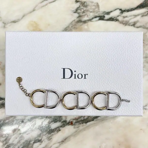 Gold and silver tone metal bracelet. CD logos in alternating gold and silver lettering. Attaches with a chain and hook closure. Bracelet width: 1.25″. Bracelet length (adjustable): 6.5″ – 7.5″. Comes with its original box and protective pouch. Condition: Purrrfect. No flaws.