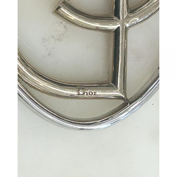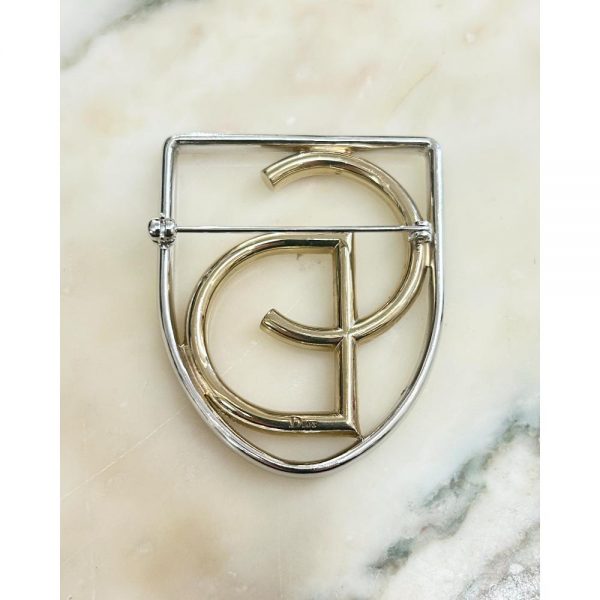 Gold and silver tone metal brooch. Gold CD logo inside a silver crest shape. Dimensions: 2″ x 1.5″. Condition: Near Purrrfect. Has a couple small shallow dents in the metal (barely noticeable).