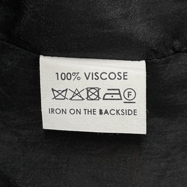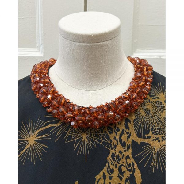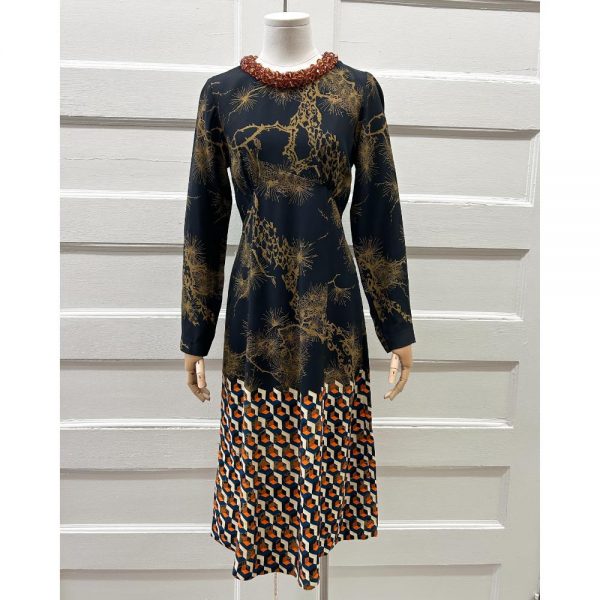 Mid length dress with long sleeves and a gathered yoke at the bust. The dress has a black and gold abstract branch pattern at the top, a colourful geometric print on the skirt, and orange beading at the collar. Made from 100% viscose. Condition: Purrrfect. No flaws.
