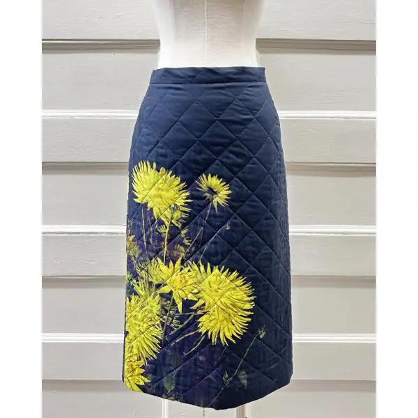 Navy cotton, quilted midi skirt with a dandelion print. Midi length, fully lined and has a back hem split. See label for material content. Condition: Purrrfect. No flaws and tag still on.