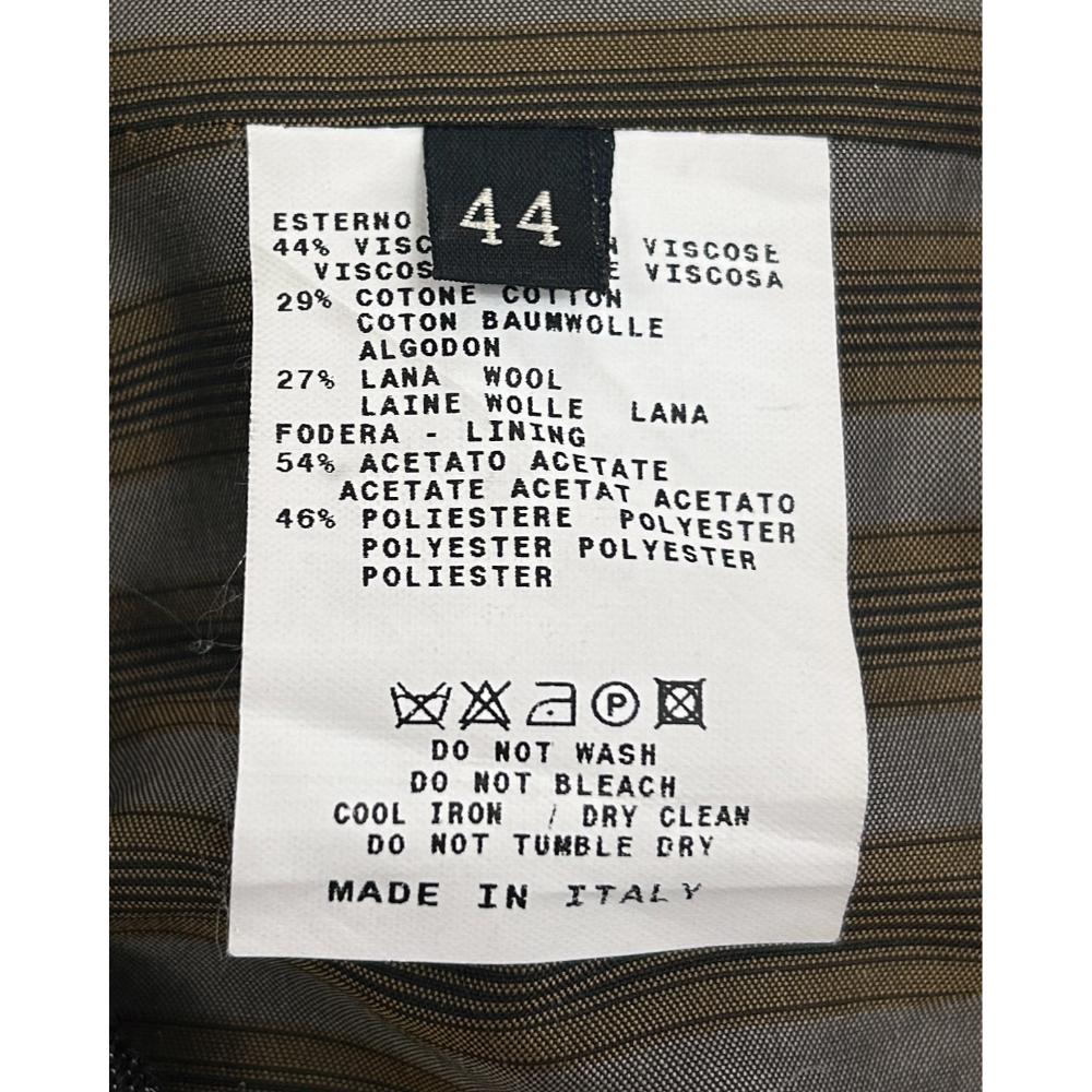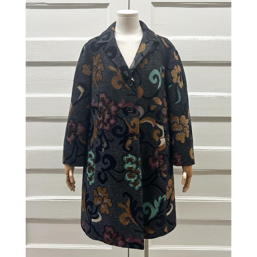 Grey coat with a black, purple, brown and turquoise floral print woven into it. The coat features a notch collar, side pockets, gusseted sleeves, and button down front. The inside is lined in striped fabric. See label image for material content. Condition: Purrrfect. No flaws.