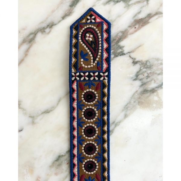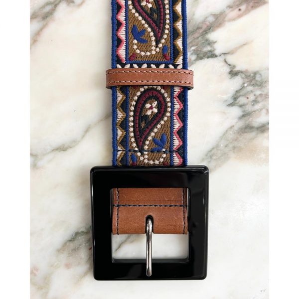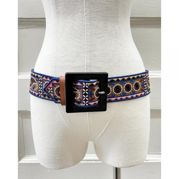 Multi-coloured, embroidered, wide belt with a large plastic square buckle. The inside of the belt is lined in brown leather. Belt width: 2″. This belt fits a 29″ – 33″ circumference. Condition: Very good. The buckle has a couple minor scratches, and leather on the back has some scuffs.
