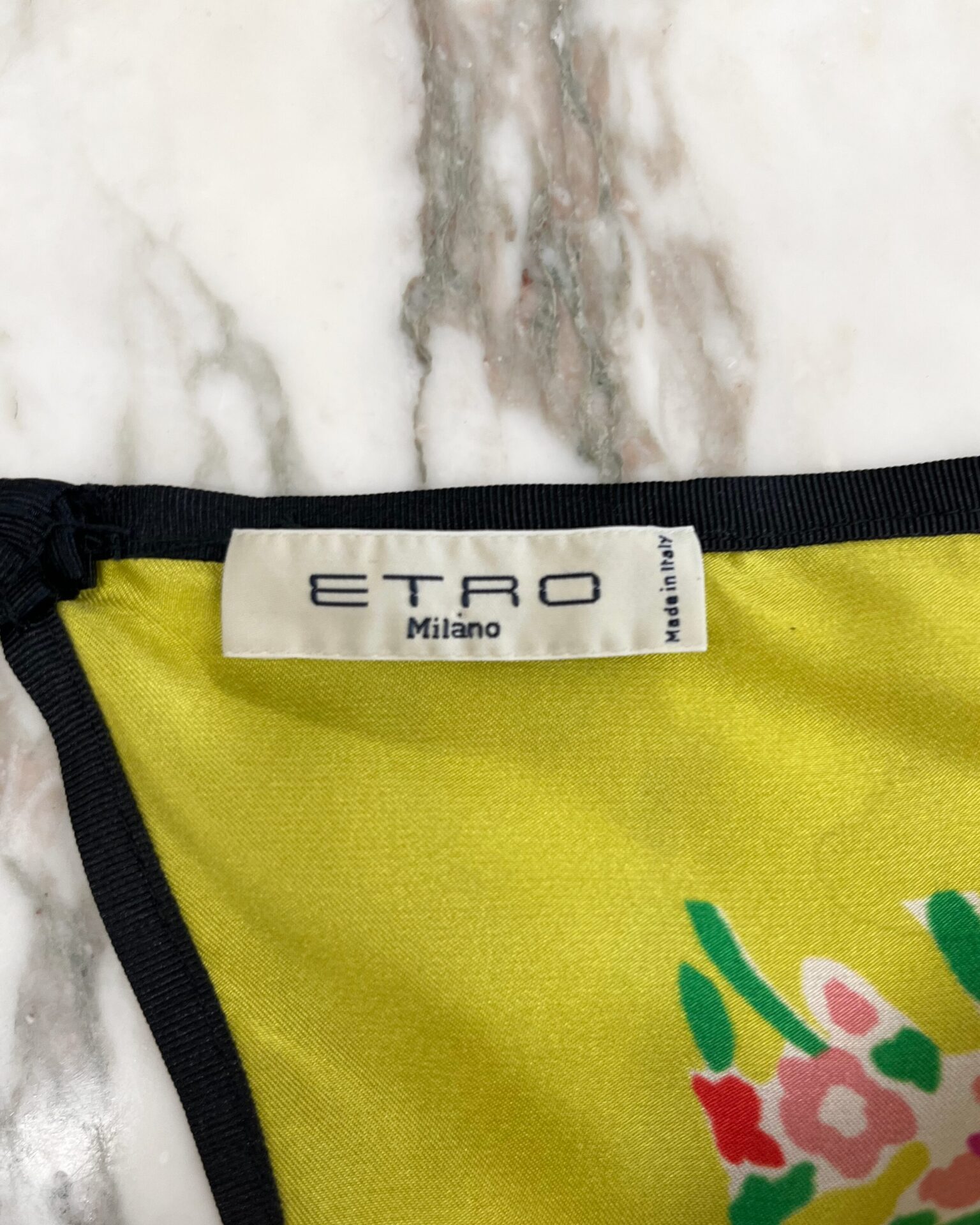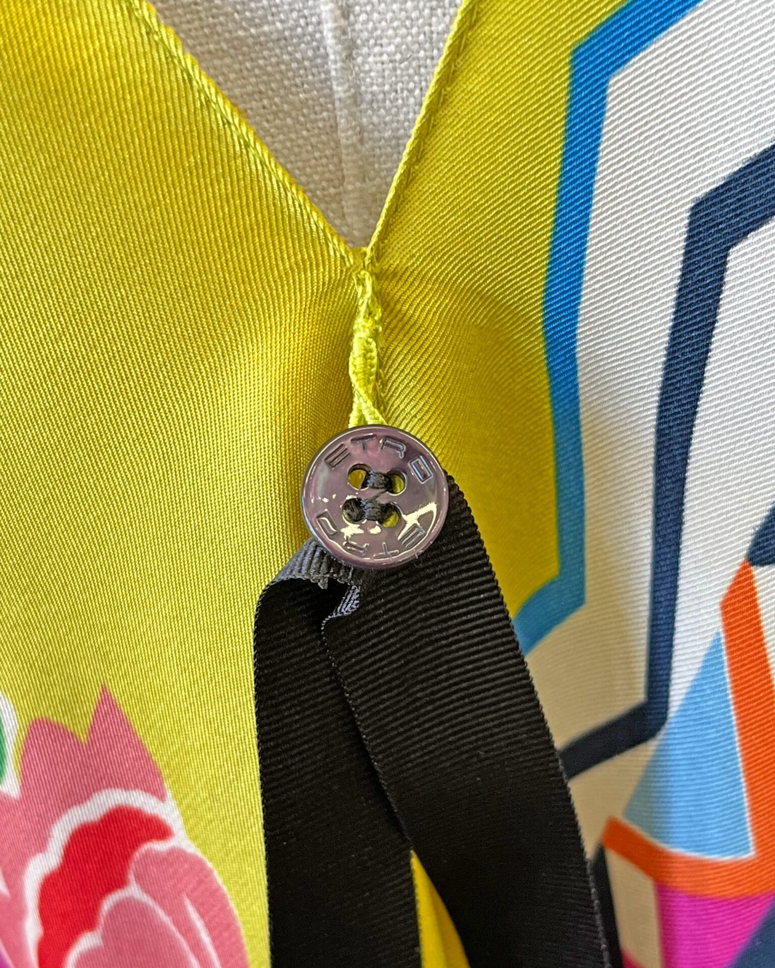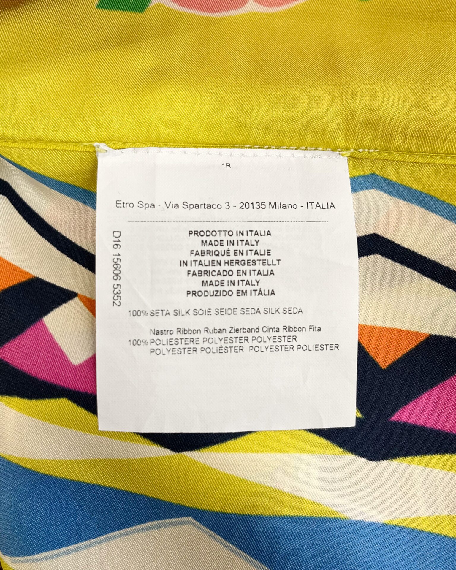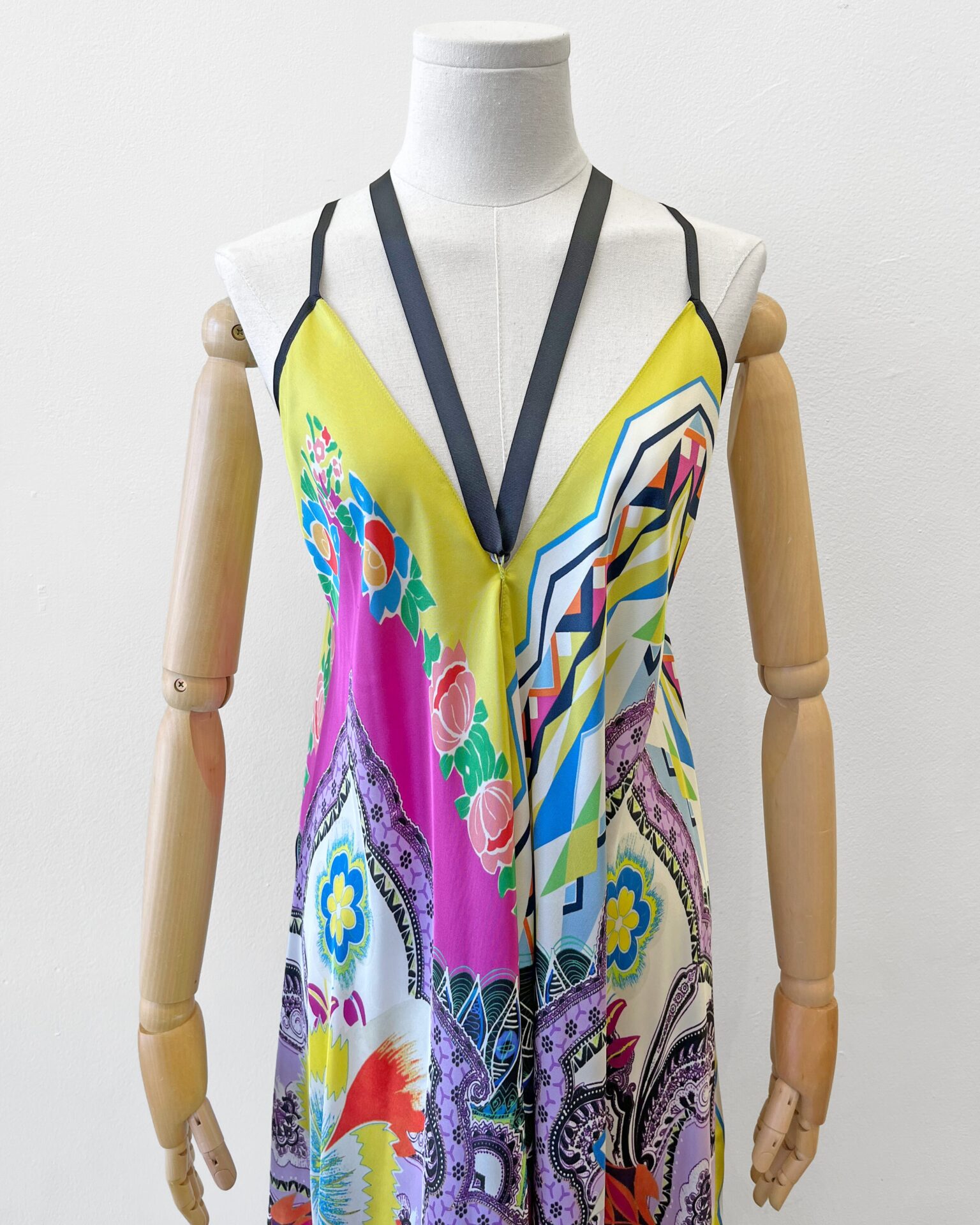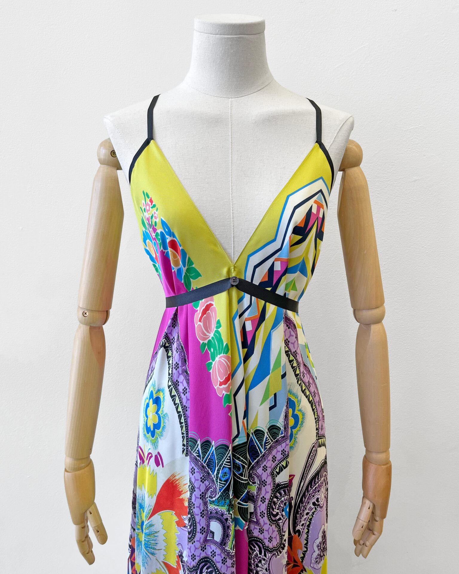 Gorgeous flowy Etro dress with incredible floral/geometric print, 3 bias-cut panels, versatile ribbon-tie and a branded button.