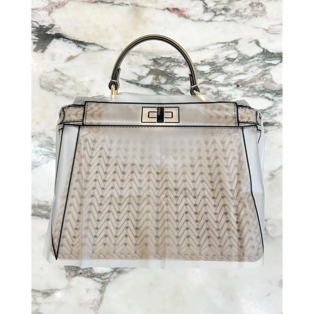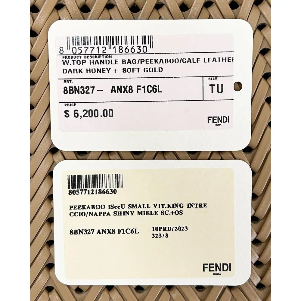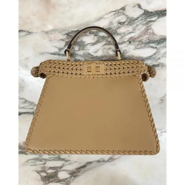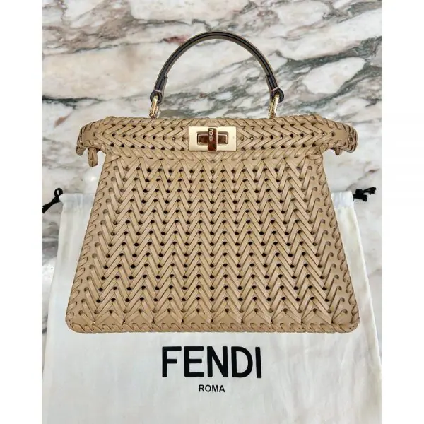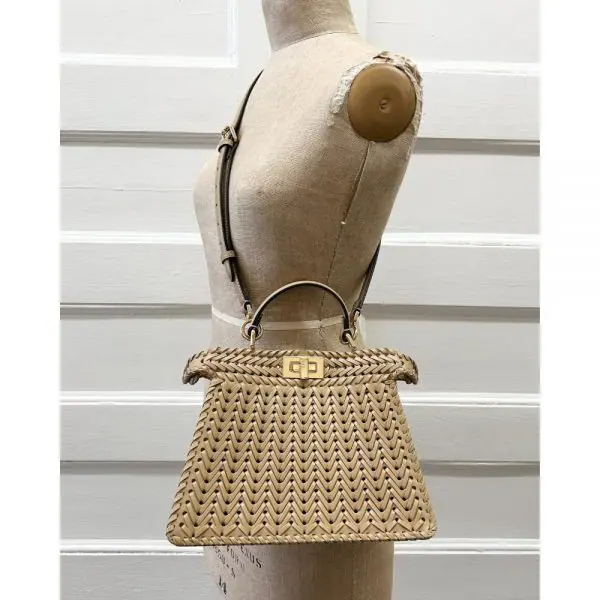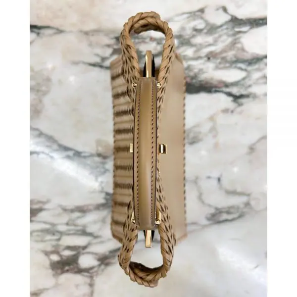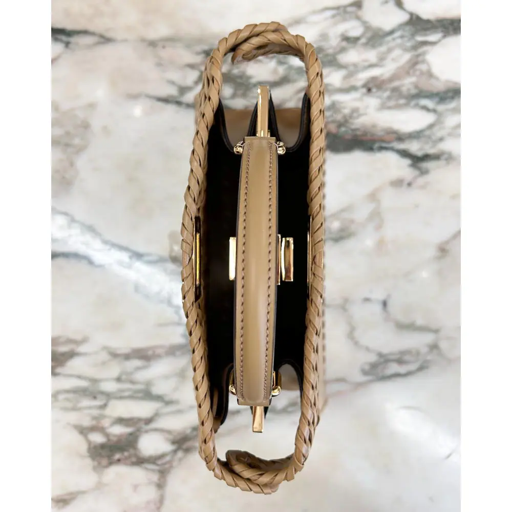 Camel tone, woven leather purse, with gold metal hardware. Top handle and attachable/adjustable cross body strap. Accordion side gussets, twist clasp closures that open the bag to two main inner compartments, lined in suede. Comes with a dust bag and rain cover. Dimensions: 10.75″ x 8.25″ x 4.5″ (W x H x D). Long strap drop (adjustable): 17″ – 20″. Condition: Purrrfect. New with plastic still on hardware.