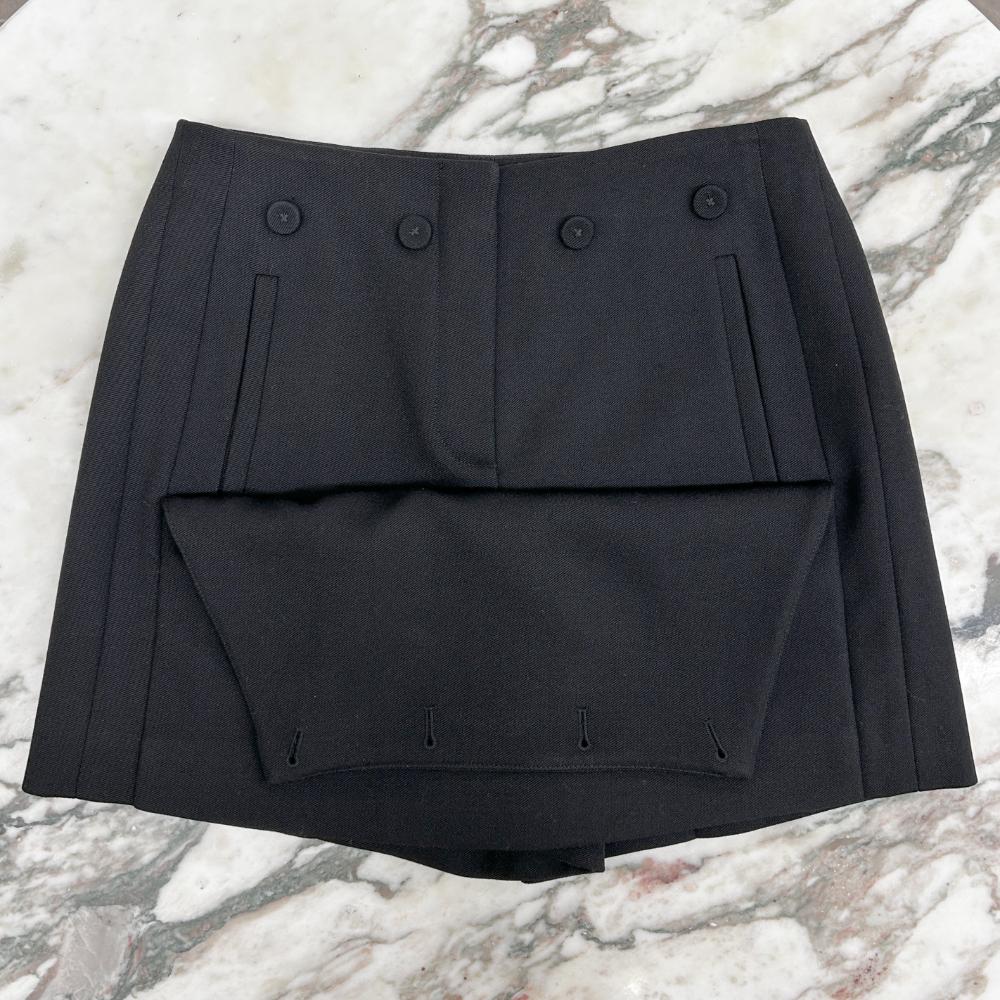 Black wool skort with a sailor style buttoned front flap. The skort has side pockets, welt pockets on the back, and a zippered fly front under the sailor flap. Made from 100% wool, and the lining is 100% silk. Condition: New with tags still on and flawless.