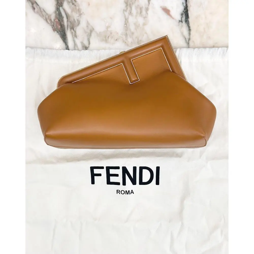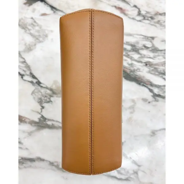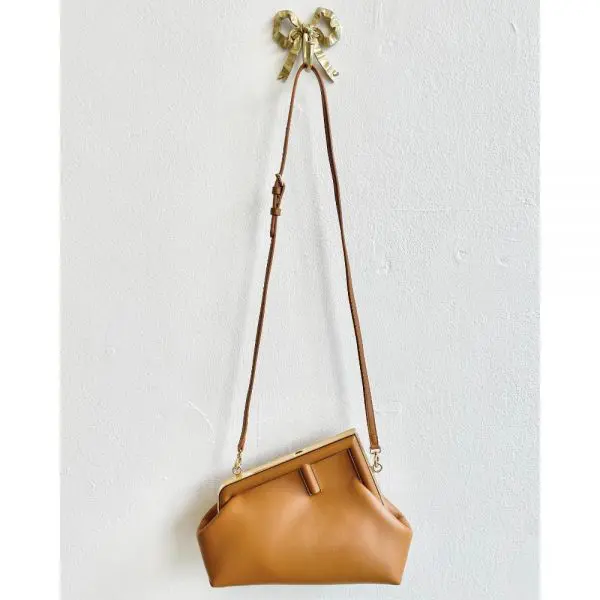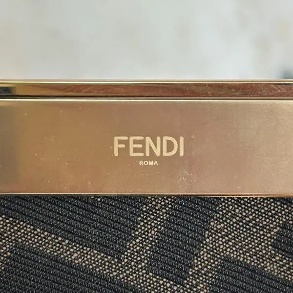 This bag is unique and versatile! Smooth brown leather outer with gold metal hardware. The bag can be worn with its leather strap, or as a clutch, by removing the strap and rotating the clasp attachments inside. It opens with a push closure to a Zucca print woven interior. Comes with original dust bag. Dimensions: 7″ x 9″ x 3.75″. Leather strap drop (adjustable): 16″ – 18″. Condition: Purrrfect. Never been used and protective plastic is still on the hardware.