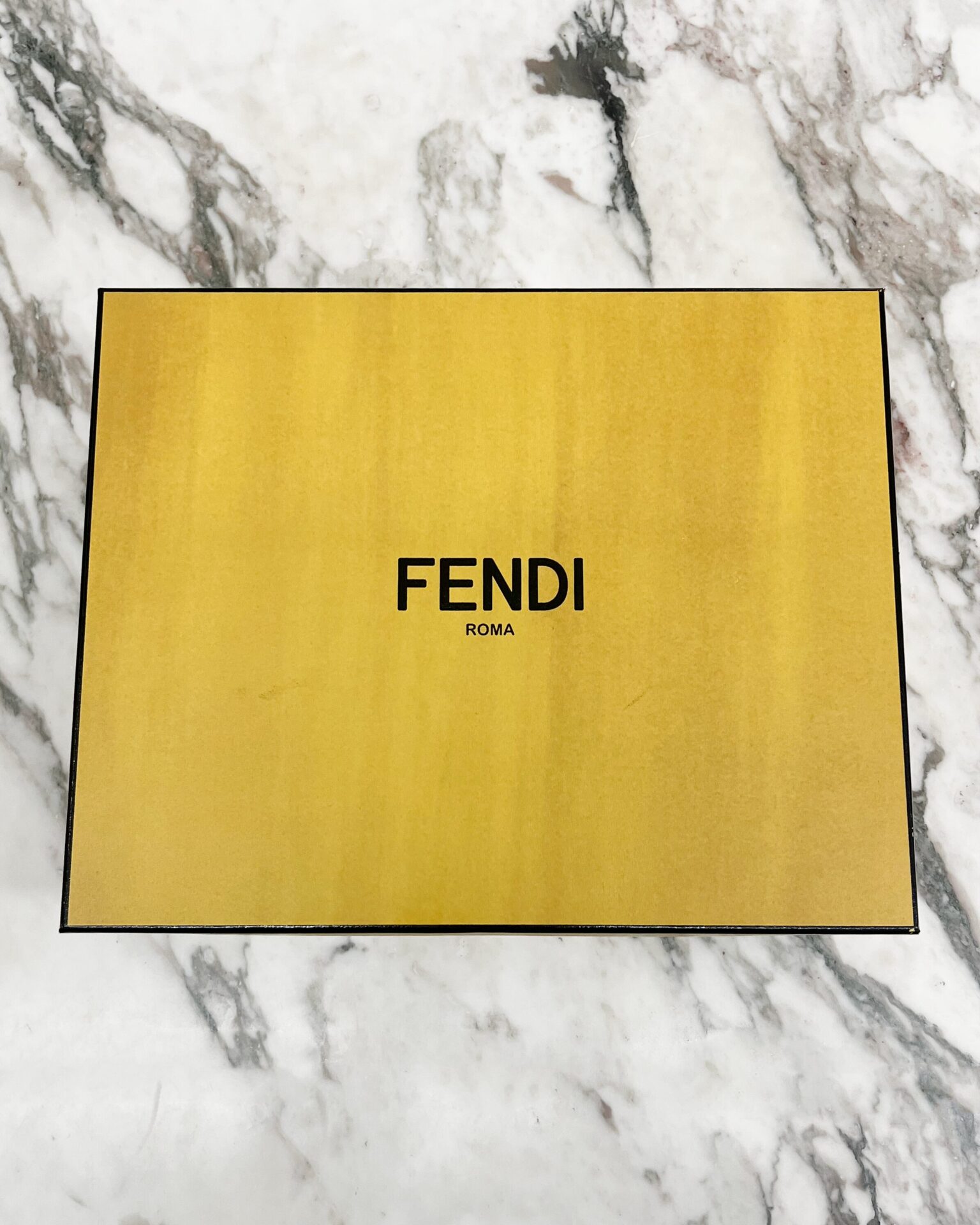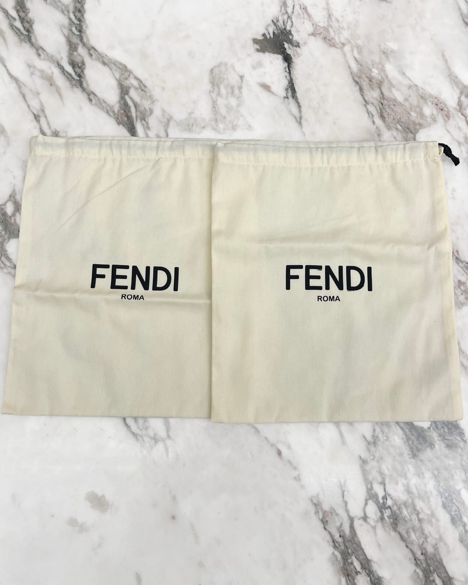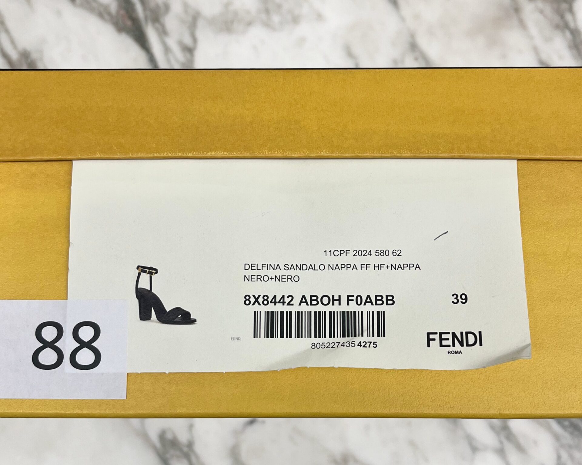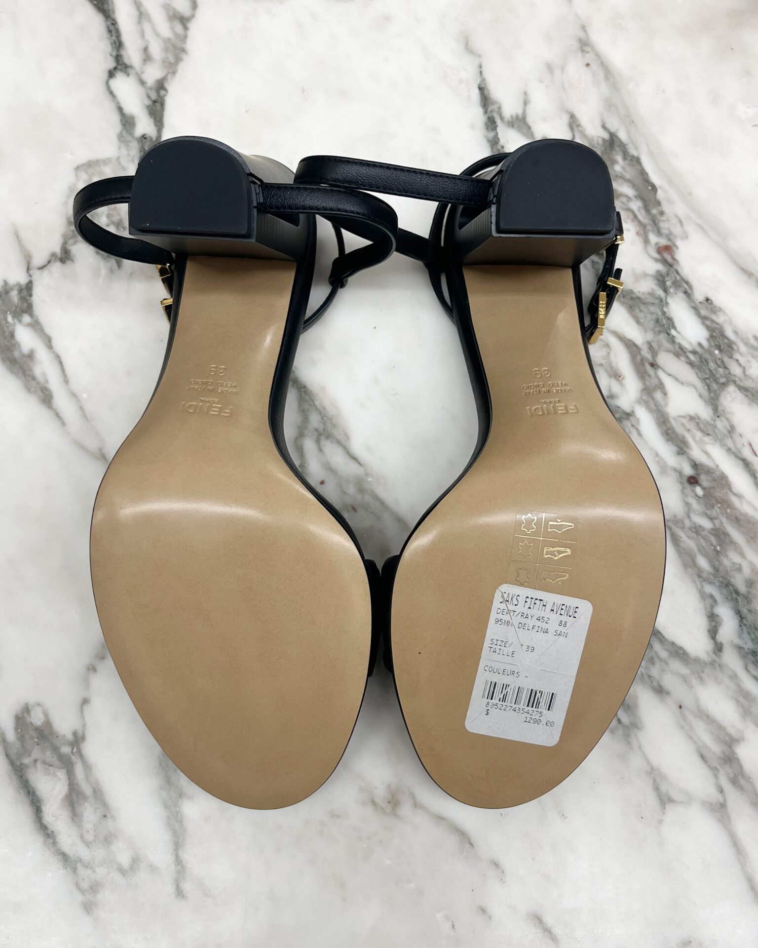 Black leather 4′ heeled sandals with Fendi ‘FF’ logo embossed on the strap. Features a slot in the heel block that allows the ankle strap to move up and down. Includes box and dustbags.
