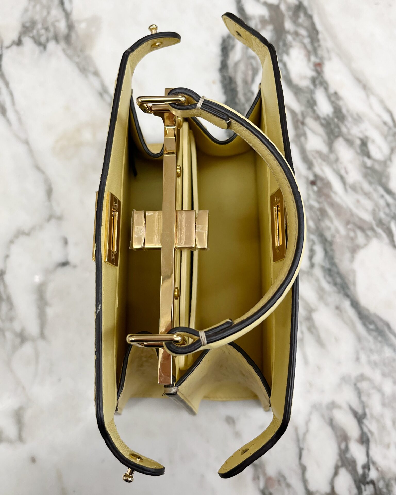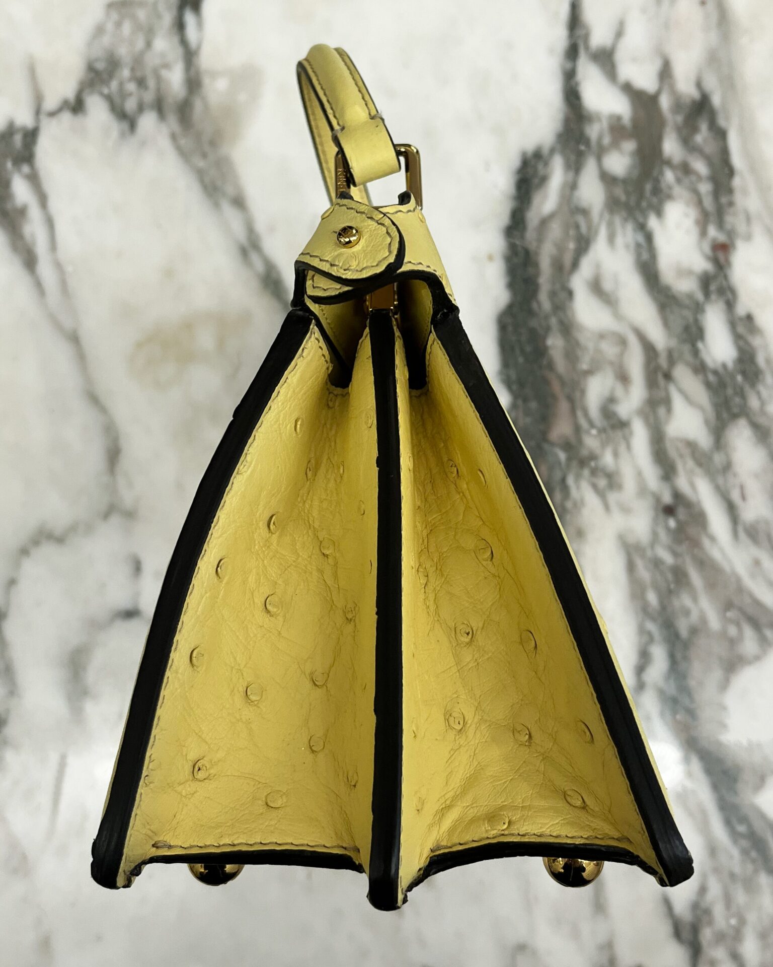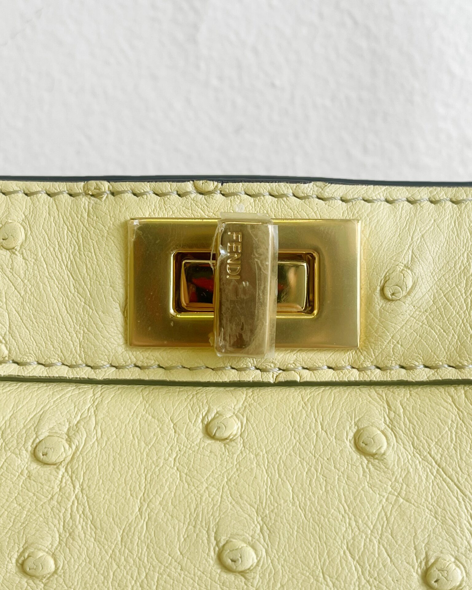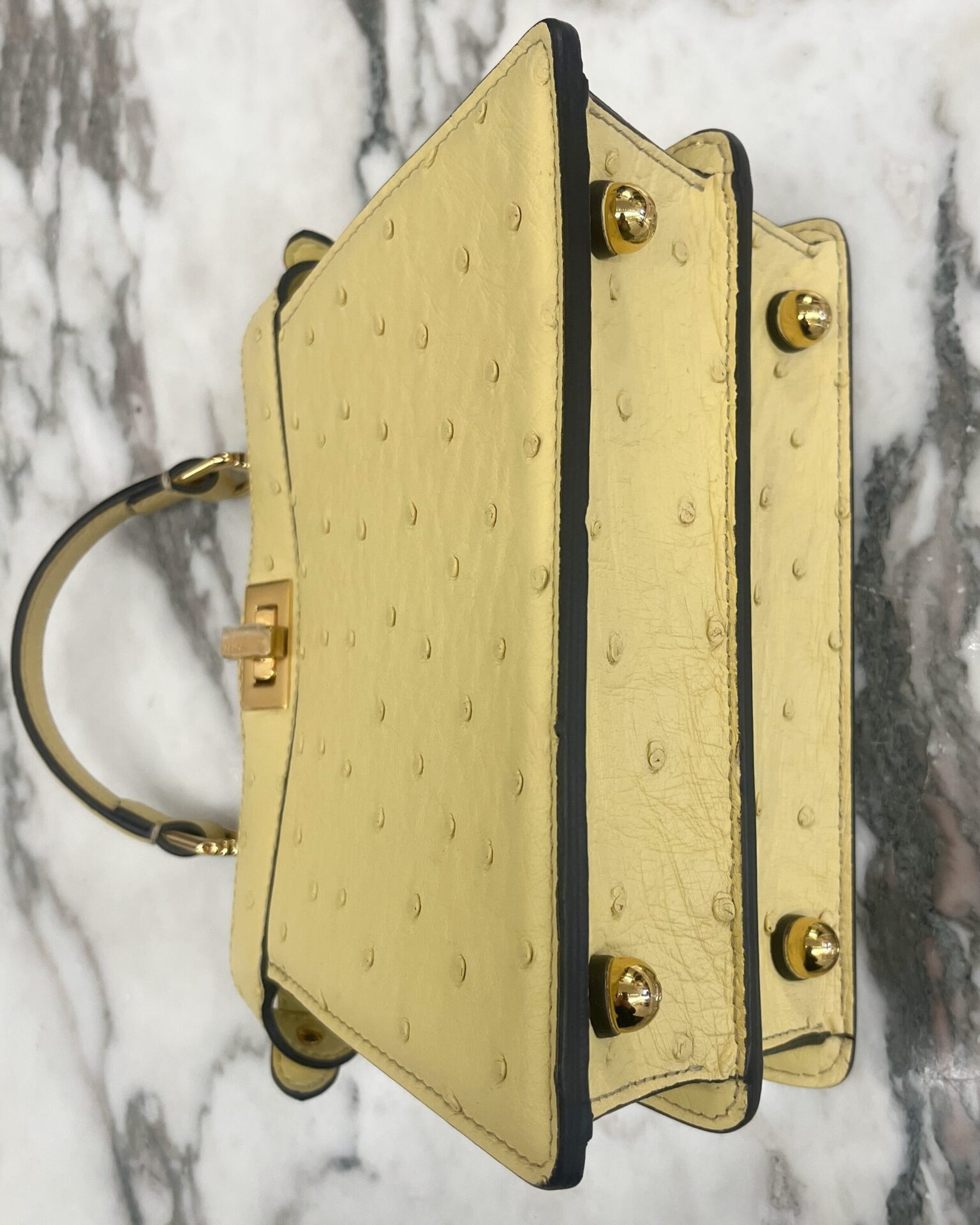 Pale yellow ostritch leather Fendi Peekaboo ISeeU petite bag, featuring gold coloured metal hardware, ‘FF’ logos engraved onto hardware on the bottom of the bag, adjustable shoulder strap, identification card, dustbag, and a waterproof rain cover.