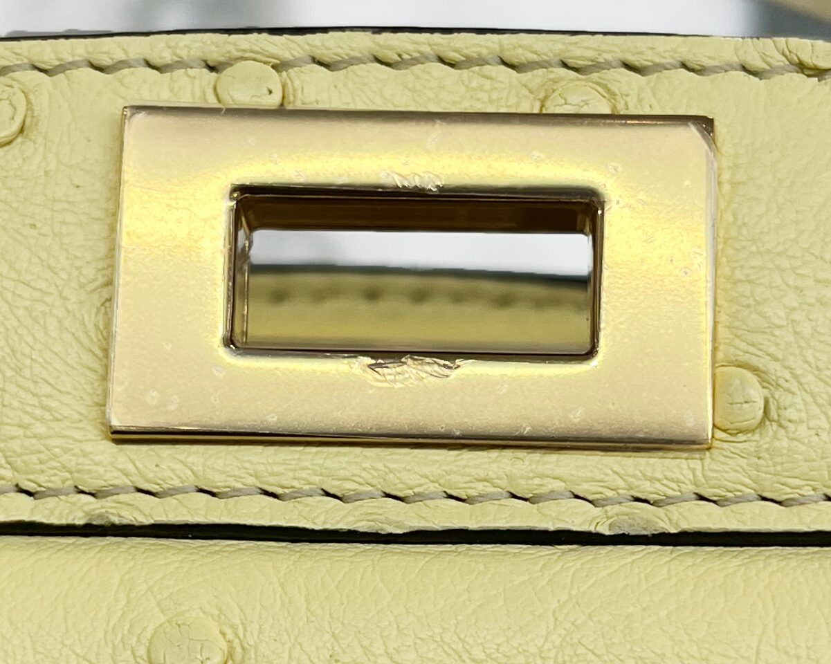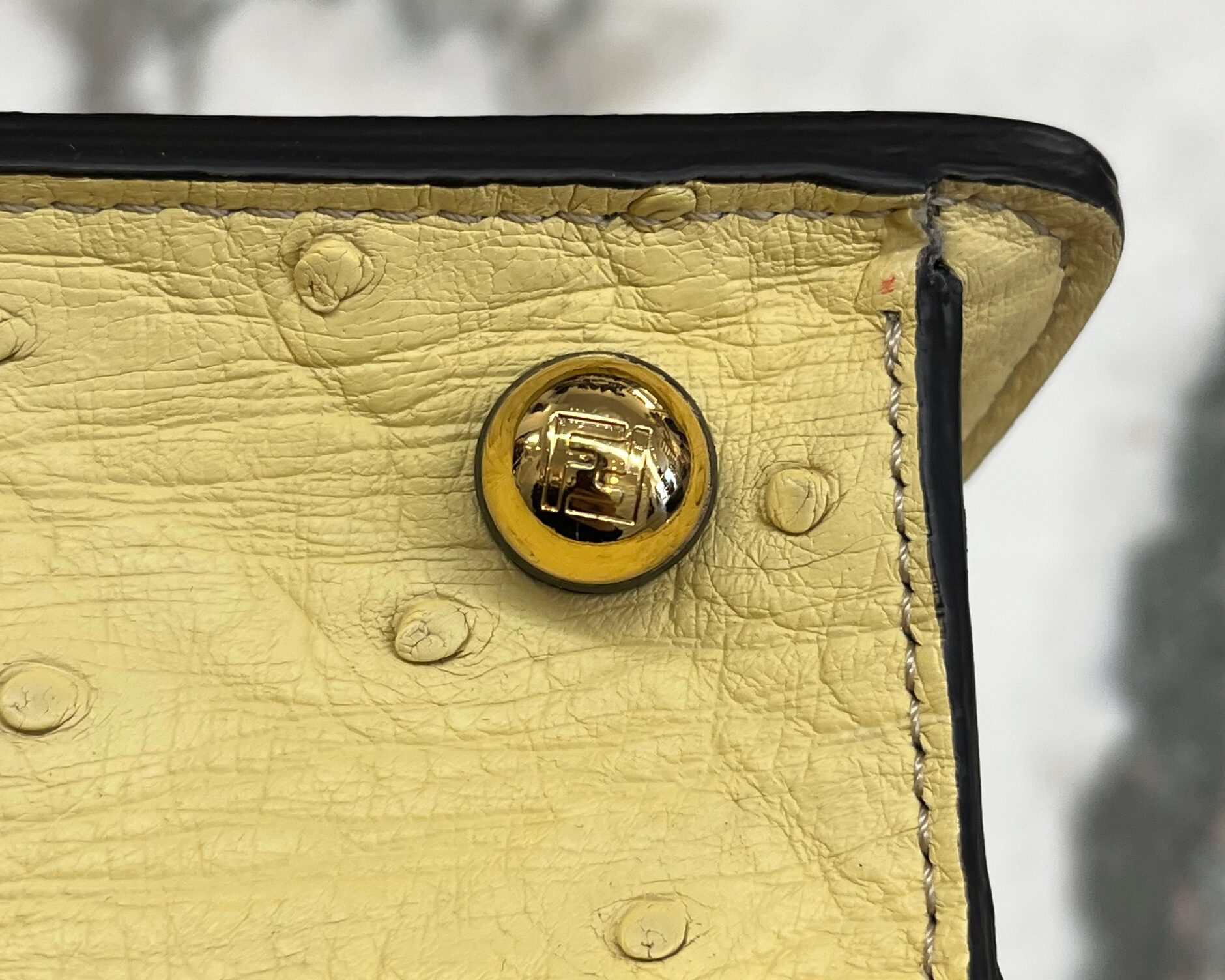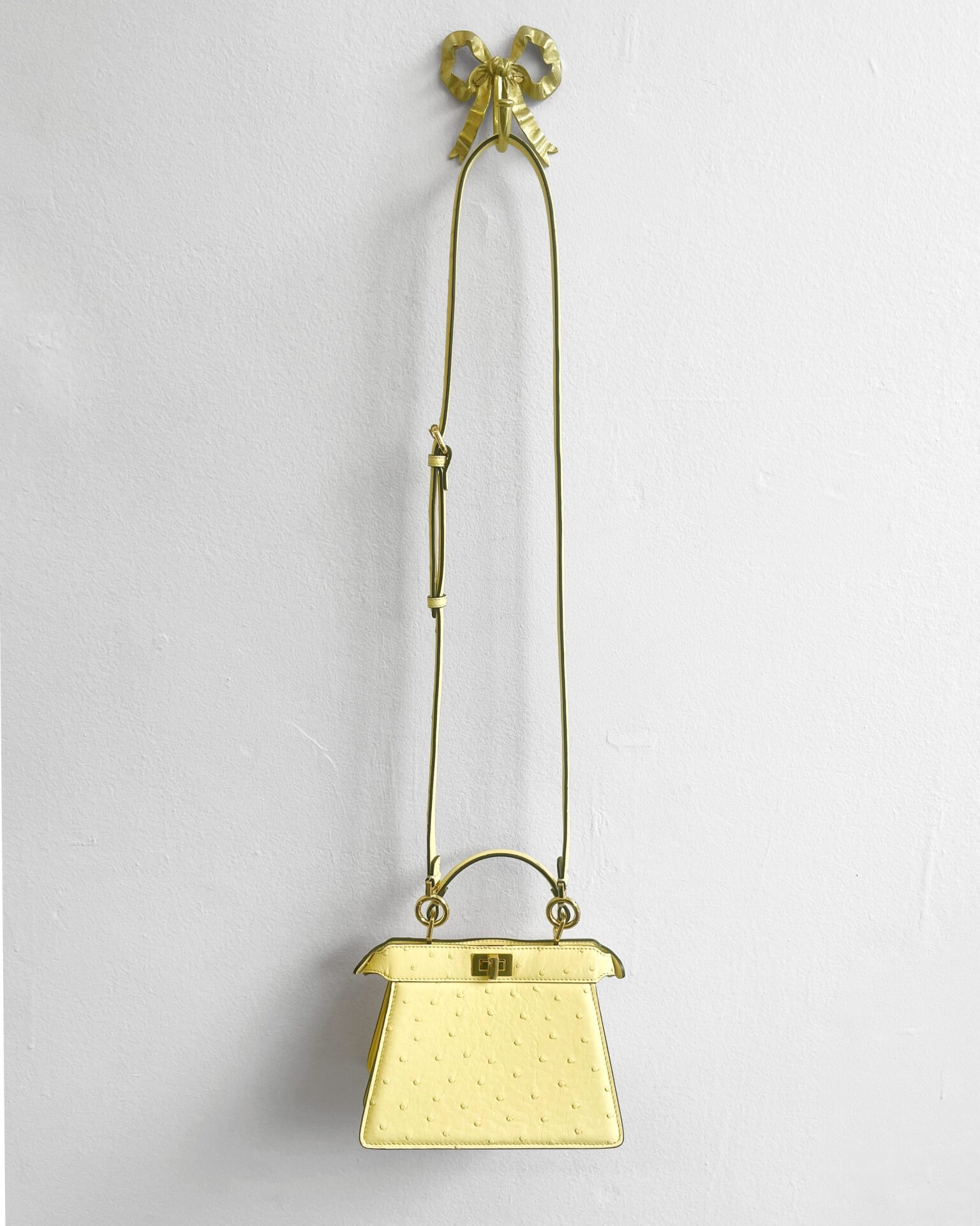 Pale yellow ostritch leather Fendi Peekaboo ISeeU petite bag, featuring gold coloured metal hardware, ‘FF’ logos engraved onto hardware on the bottom of the bag, adjustable shoulder strap, identification card, dustbag, and a waterproof rain cover.